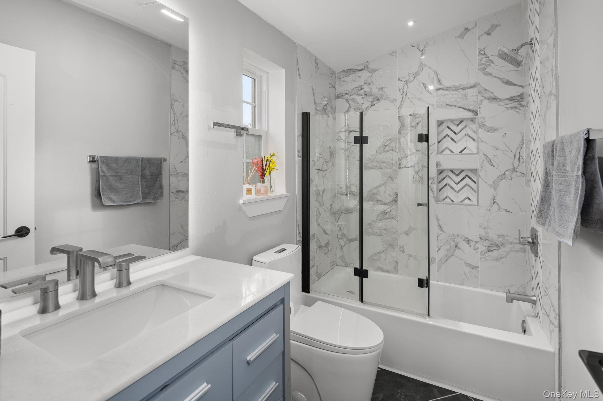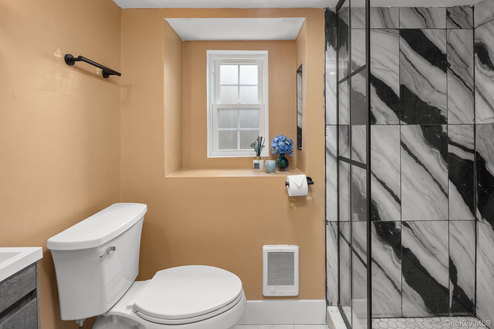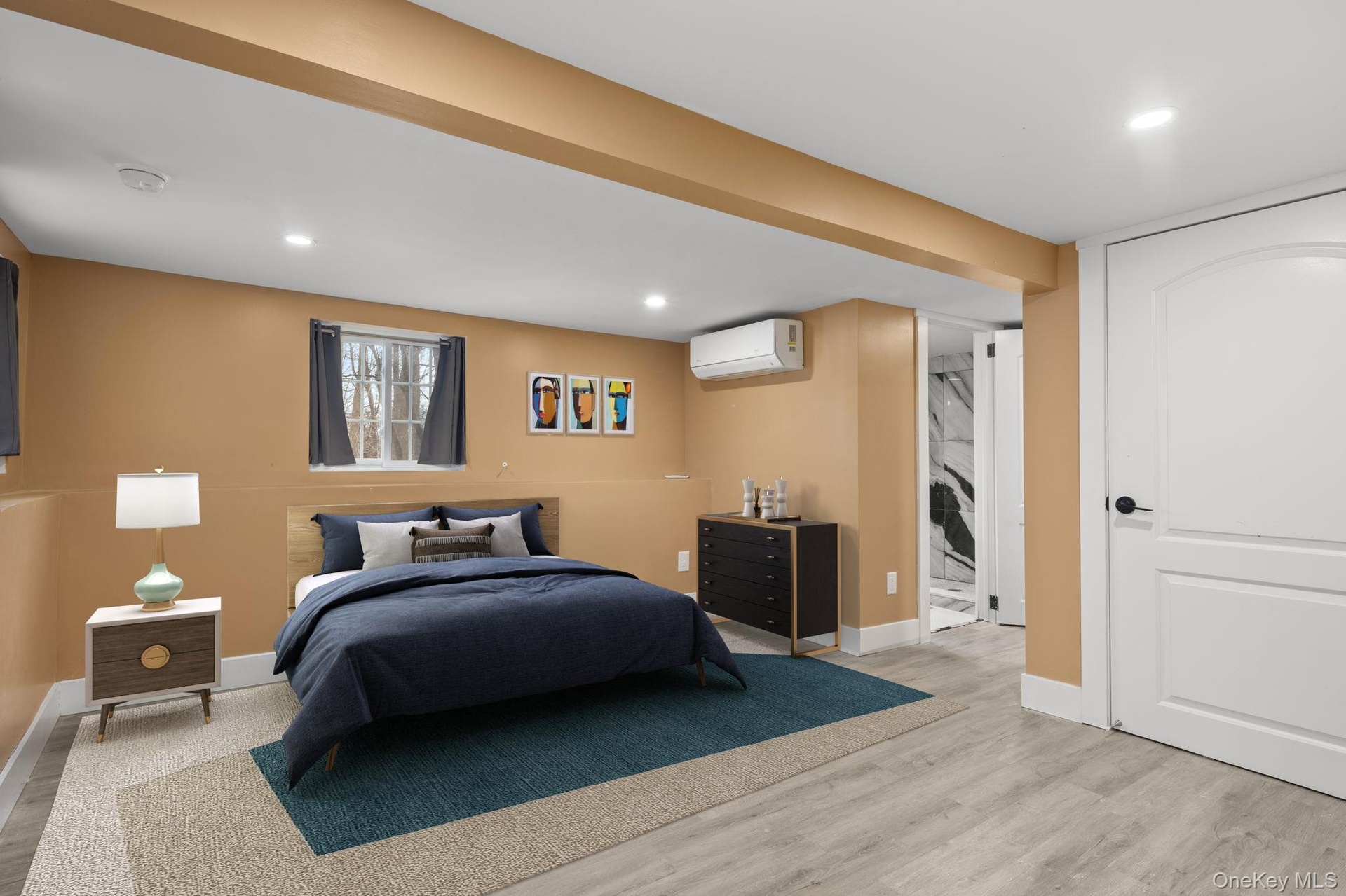 The light-filled main floor includes a spacious bedroom with dual closets and a beautifully updated full bath. The lower level offers a second bedroom with recessed lighting, a new walk-in glass shower, and access to a private patio—perfect as a guest suite, family room, or home office.