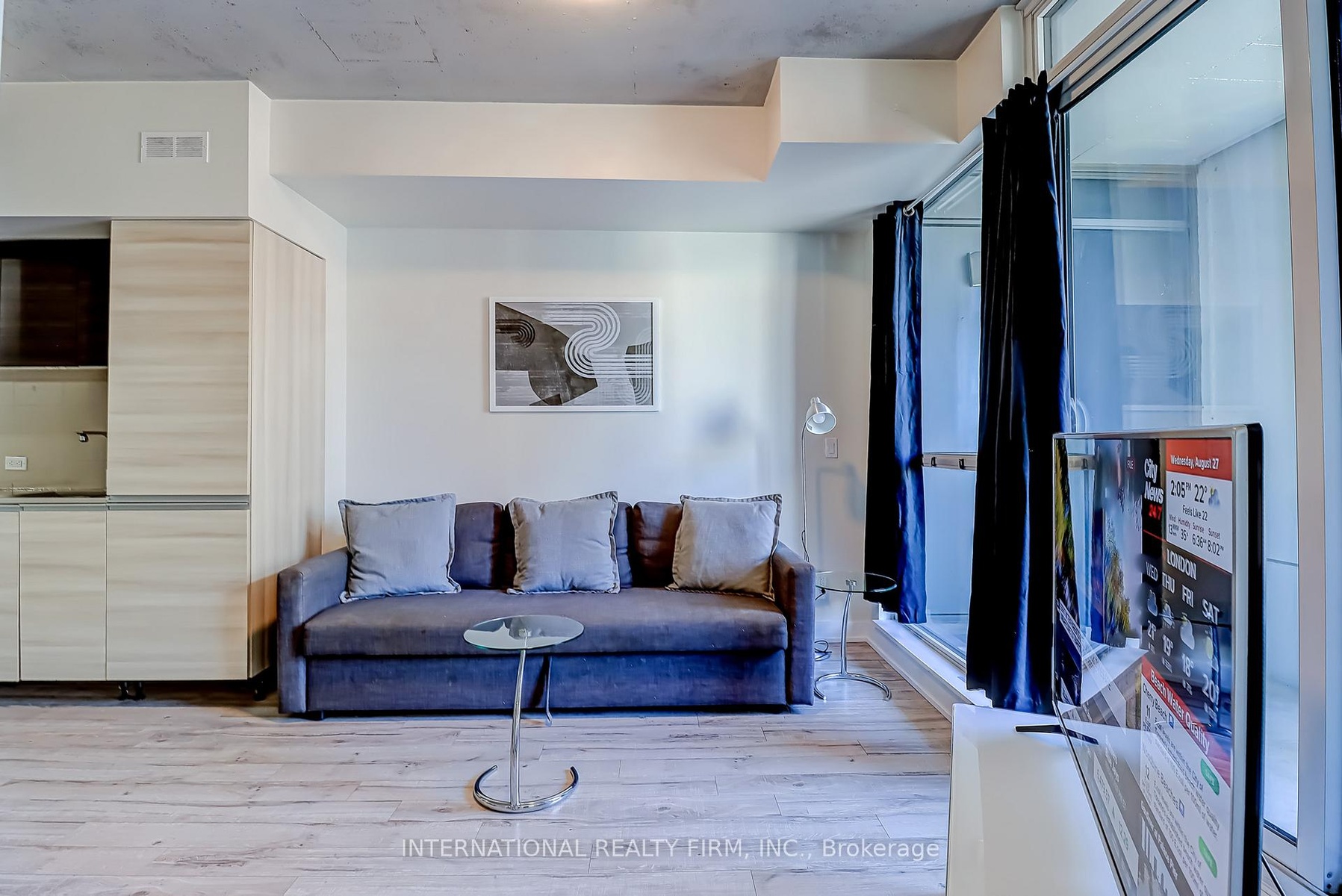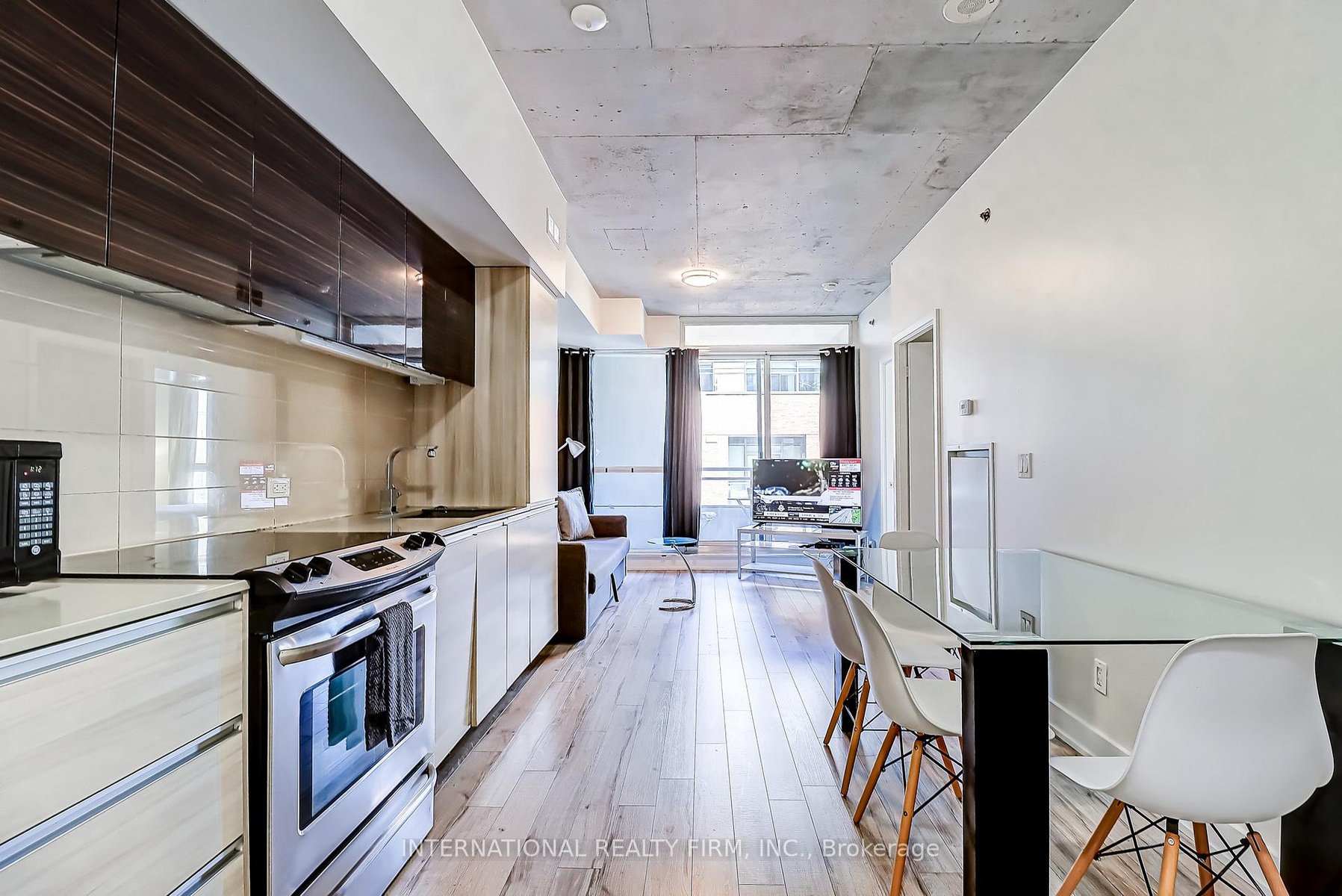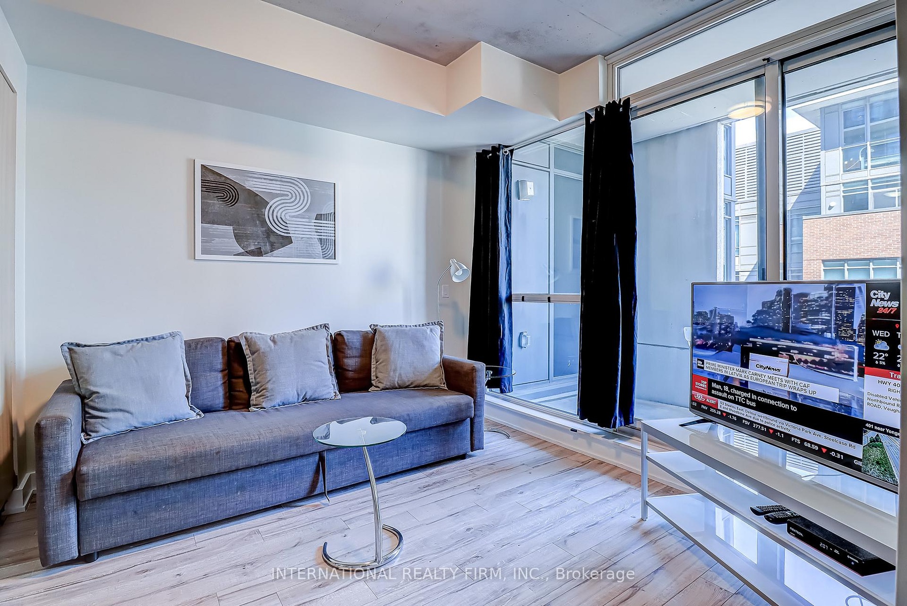 Modern 1 bedroom furnished condo at the Carnaby Lofts in Queen West featuring floor to ceiling windows, a sleek kitchen with built in appliances, in suite laundry, and a private ...