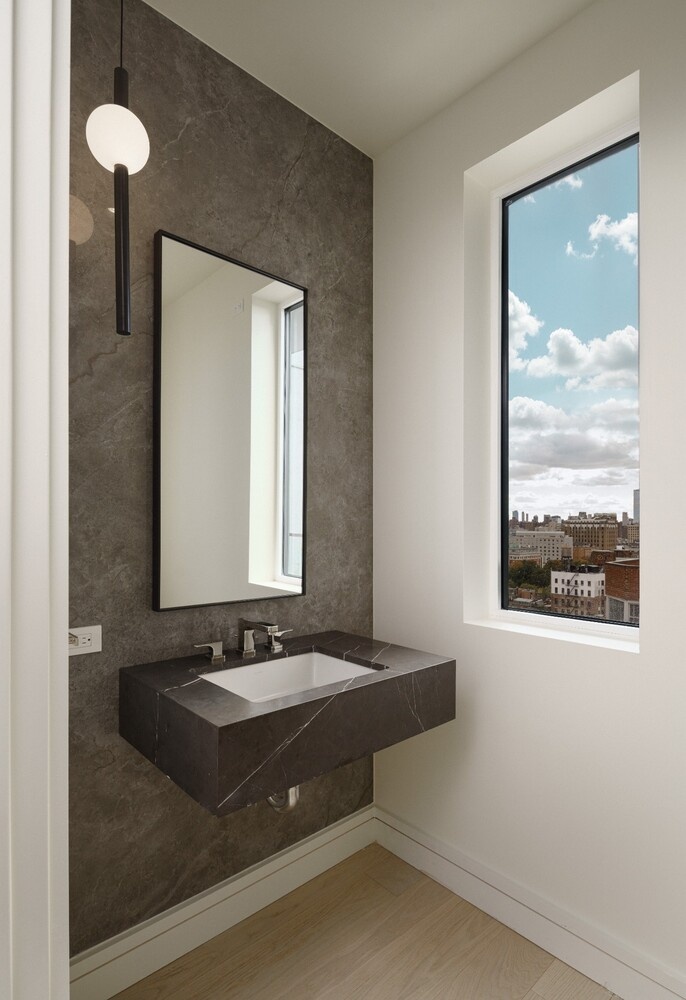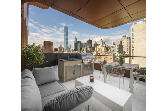 Residence 16B, a one-of-a-kind two-bedroom, two-and-a-half-bathroom home with a private terrace and balcony, captures panoramic views of the Manhattan skyline and Gramercy Park through expansive floor-to-ceiling windows. With triple exposures-west, north, and south-and ceilings approaching 11 feet, the space is bathed in natural light. The private terrace extends from the great room and features an outdoor kitchen with mesmerizing midtown views, offering a seamless indoor-outdoor experience and an ideal setting for dining or entertaining, a bonus sun bathed south facing balcony offers expansive views of Stuyvesant Park and the downtown Brooklyn Skyline.