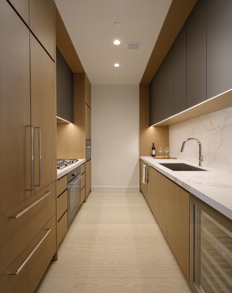 In the primary suite, a spacious walk-in closet leads to a five-fixture bath adorned with Perla Venata Quartzite floors, Bianco Dolomiti stone walls and tub deck, and a custom Tambour fluted wood-veneer vanity topped by a blackened steel-framed mirrored cabinet. The secondary bath continues the tactile narrative with Sandy White ceramic tile, Italian Alfalux Torbole mosaic tile, and Krion Snow White countertops. The powder room makes a striking impression with Xtone Fiori di Bosco polished marble walls and a Grafite honed-marble vanity.