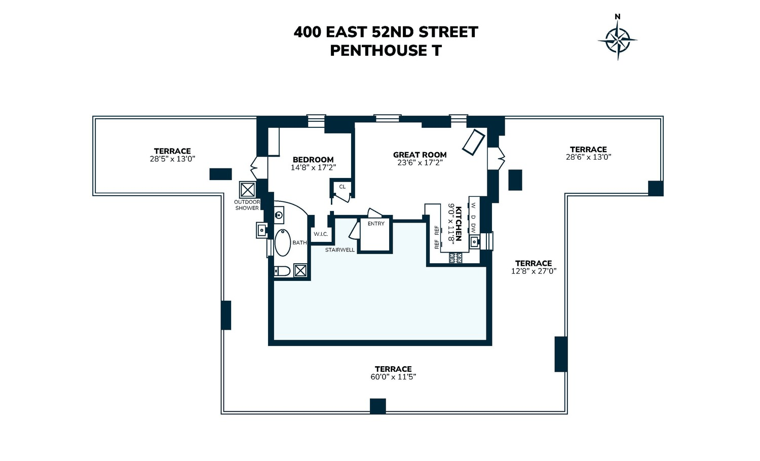 Situated in the tower, one flight up from the PH level, one enters into a truly spectacular great room with soaring 13+ft ceilings and surrounded by sun-drenched oversized pictures windows, with breathtaking open views from every exposure. The entire apartment is surrounded by a spectacular and expansive 1800+sf wraparound terrace offering unparalleled East River and City views.