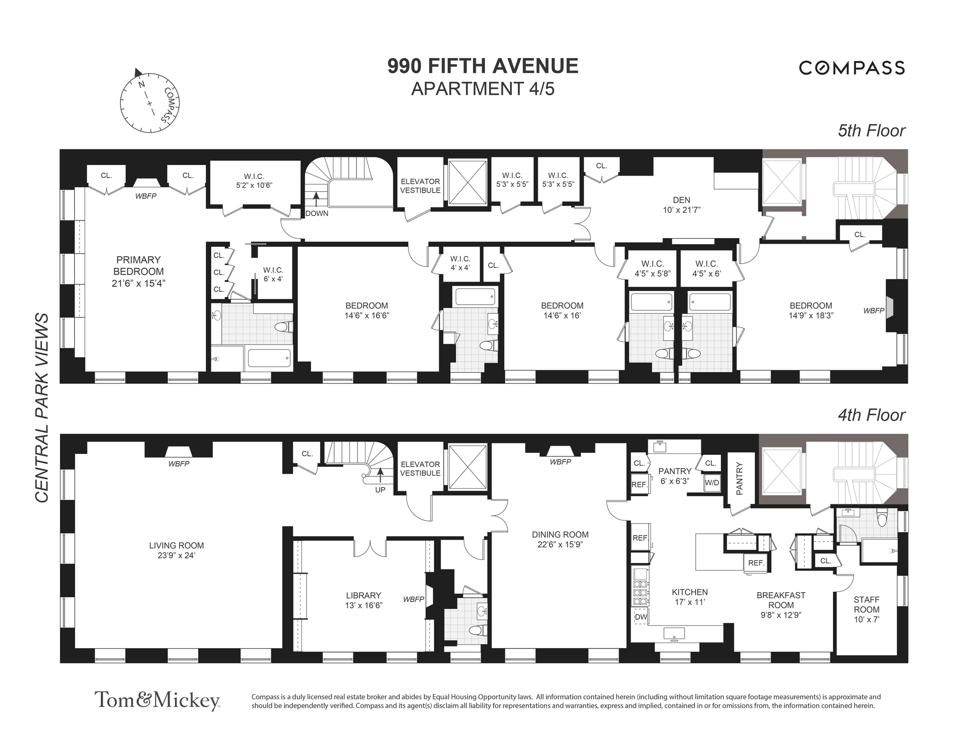 Ideally positioned to capture the lush tree-line vistas of Central Park and the iconic Metropolitan Museum of Art, residence 4/5 at 990 5th Avenue is a distinguished duplex apartment that offers breathtaking views and captivating southwest light. This architectural gem, with just six residences, was designed in 1927 by Rosario Candela and Warren & Wetmore and provides five spacious bedrooms, five and a half bathrooms and five wood-burning fireplaces.
