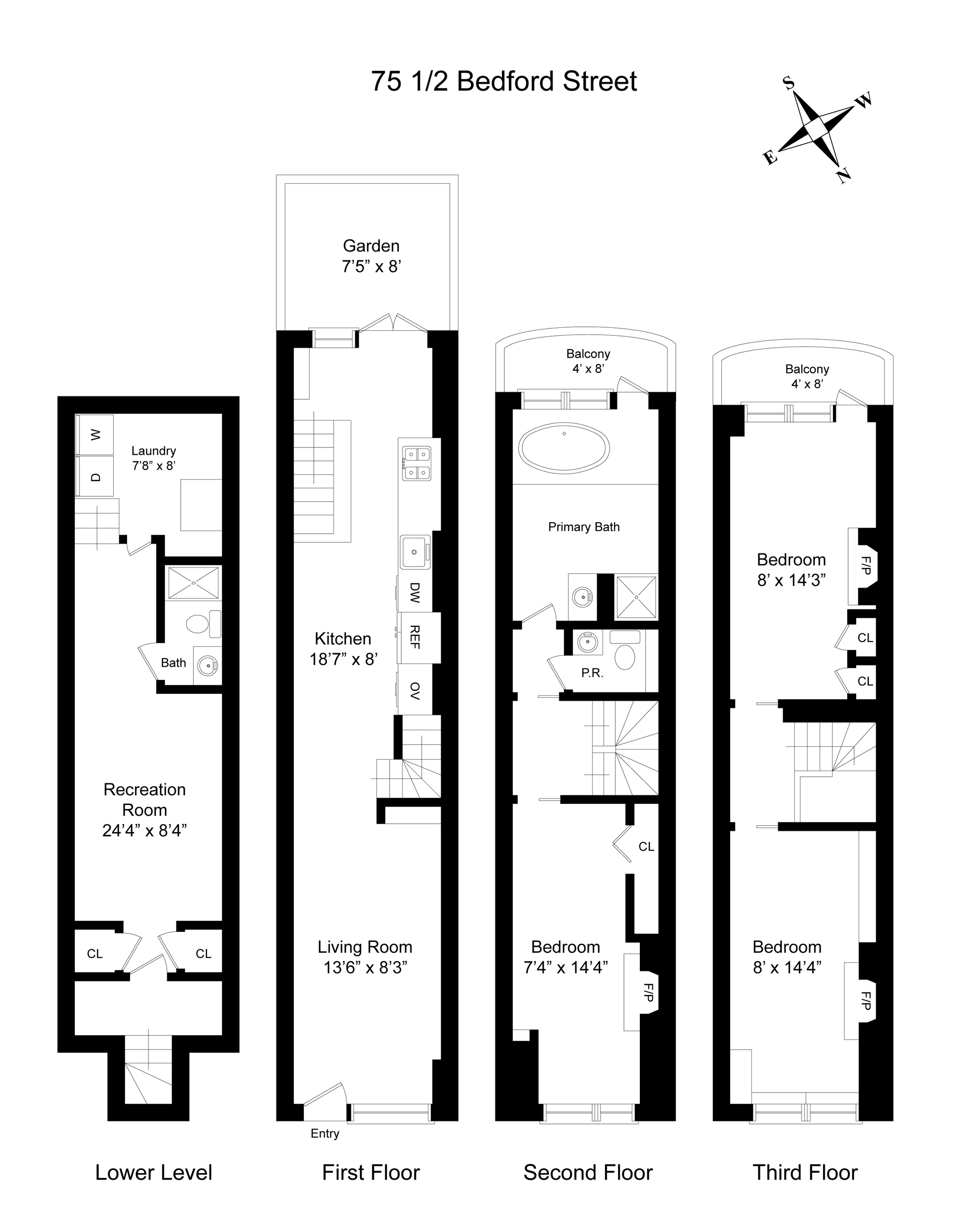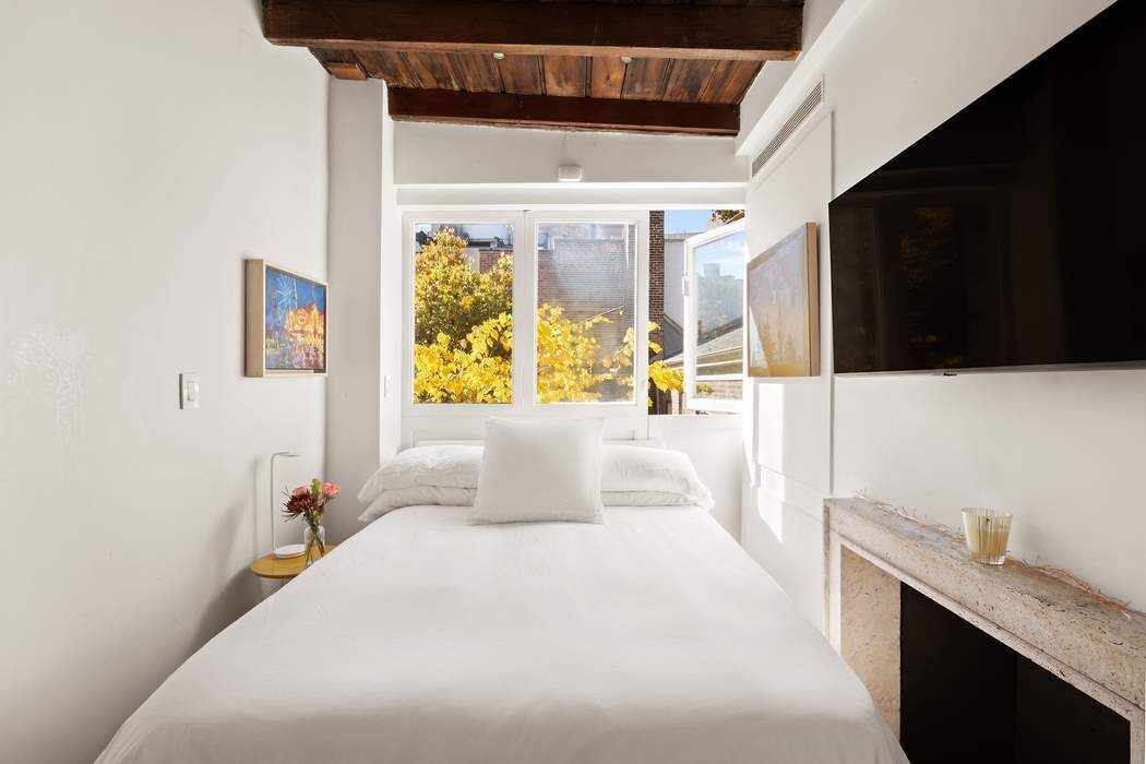 75 1/ Bedofrd, built in the 19th century, is truly a gem of a townhouse. It boasts 3 Bedrooms, 2 Bathrooms and a finished lower level retreat that easily functions as a fourth Bedroom for guests with its own Calacatta marble Bathroom. The home, with 150 sq ft of outdoor space, has a Private Garden oasis off of the Kitchen that has been beautifully landscaped and is ideal for dinner parties or just relaxing and connecting with nature. There is wonderful light throughout the house from the large skylight on the upper level, oversized windows in the front and floor-to-ceiling French doors on the first two levels. All Bedrooms, as well as the Primary Bathroom, have working wood-burning fireplaces framed in travertine. What a dream! Leave the Dutch door on the ground floor garden level open, enjoy a fresh breeze, and cook in your well-appointed Kitchen with custom millwork, Italian marble countertops and backsplash, built-in Miele coffee maker and vented oven. On the second level the airy Primary Suite features efficient closet space and a spa-like Bathroom, with a balcony overlooking the serene Garden. The Bathroom is exquisitely designed with a claw-foot deep-soaking tub against a gorgeous mosaic tile backdrop, separate shower, two Italian marble sinks, Lefroy Brooks fixtures and abundant storage space. The upper level soars to 12 feet leading to the magnificent skylight and has two additional Bedrooms, one with a balcony overlooking treetops. You will wake up every morning feeling transported to Europe! Other features of this magical home include oak flooring throughout, central air conditioning and a vented washer/dryer.