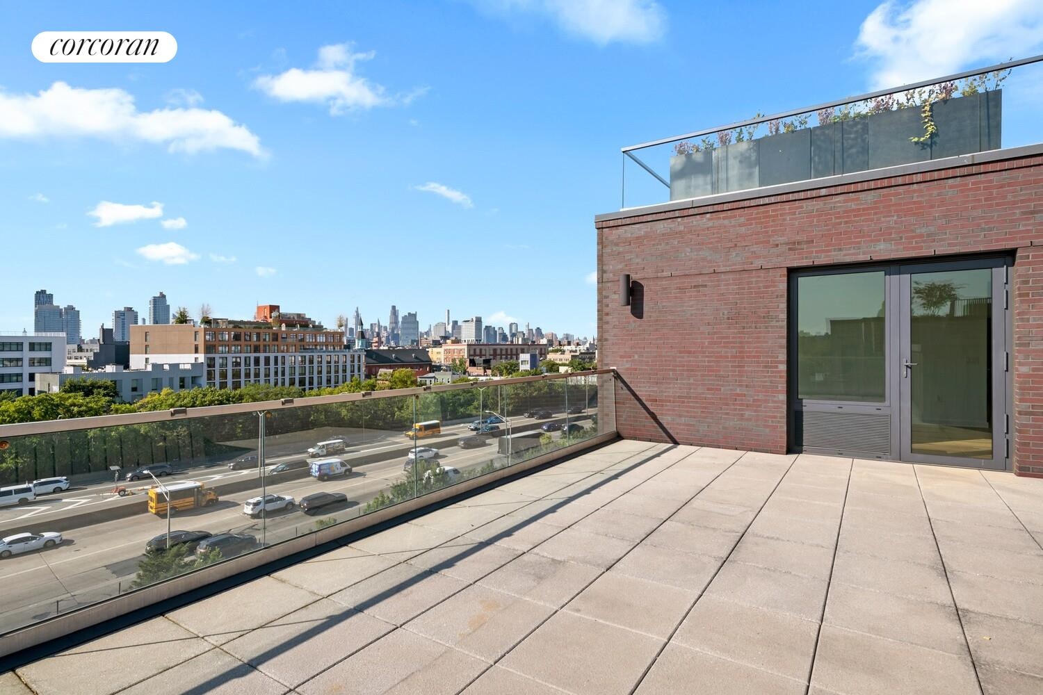 An expansive, fully furnished and landscaped roof deck overlooking Brooklyn and Manhattan