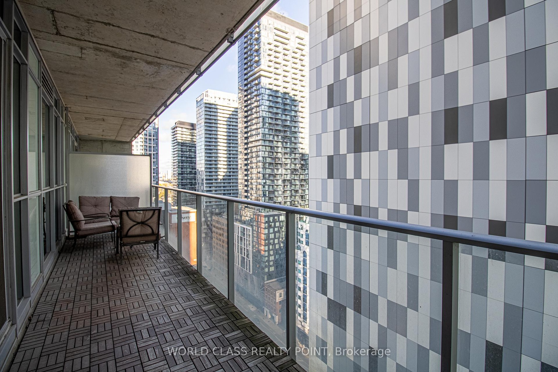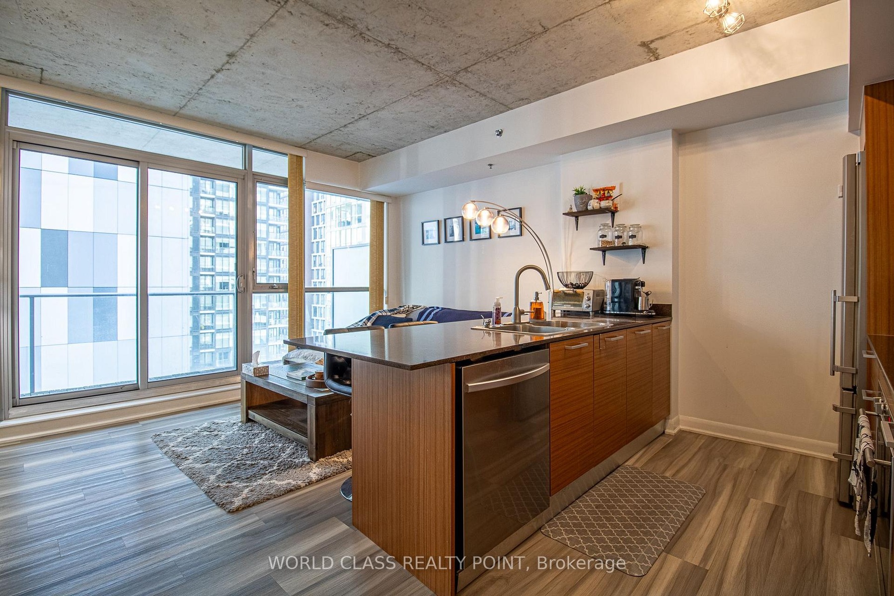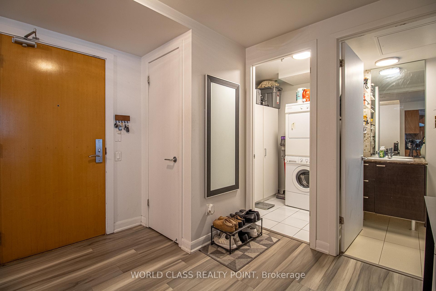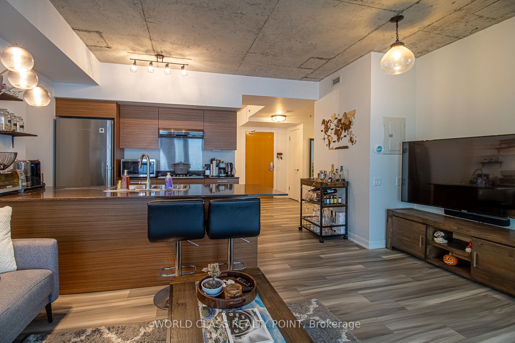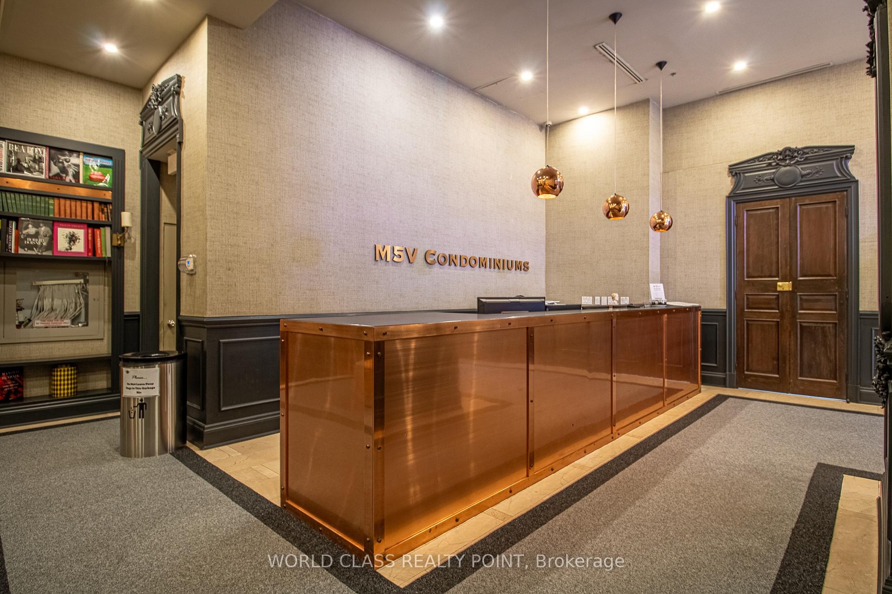 Experience elevated urban living in the heart of the Entertainment District at the iconic M5V Condos, where refined design meets modern vibrancy. Perfectly situated at the intersection of King & Peter with a 100 Walk Score and 100 Transit Score, this expansive 1+1 suite redefines downtown luxury. The thoughtfully designed den offers versatility - easily functioning as a second bedroom or home office. Featuring an open-concept floor plan with floor-to-ceiling east-facing windows that floods the space with natural light. The gourmet kitchen is a statement featuring full-sized stainless steel appliances, a sleek breakfast bar, and modern cabinetry. The primary bedroom boasts a spacious custom closet, while the ensuite laundry and dedicated storage room provide exceptional convenience and organization. Outside, the oversized balcony is an entertainer's dream, complete with upgraded patio tiles, making outdoor dining and lounging effortless. Residents of M5V enjoy five-star amenities, including a state-of-the-art fitness centre with brand-new equipment, Peloton room, yoga studio, steam rooms, a stylish entertainment lounge with a foosball and ping pong table, and an elevated BBQ terrace. Location, Location, Location! Located just steps from trendy cafés, restaurants, TTC, fitness studios, grocery stores, shopping, and The Well. This residence offers the best of urban convenience and contemporary elegance. Don't miss this rare opportunity - a true must-see in Toronto's most dynamic neighbourhood.