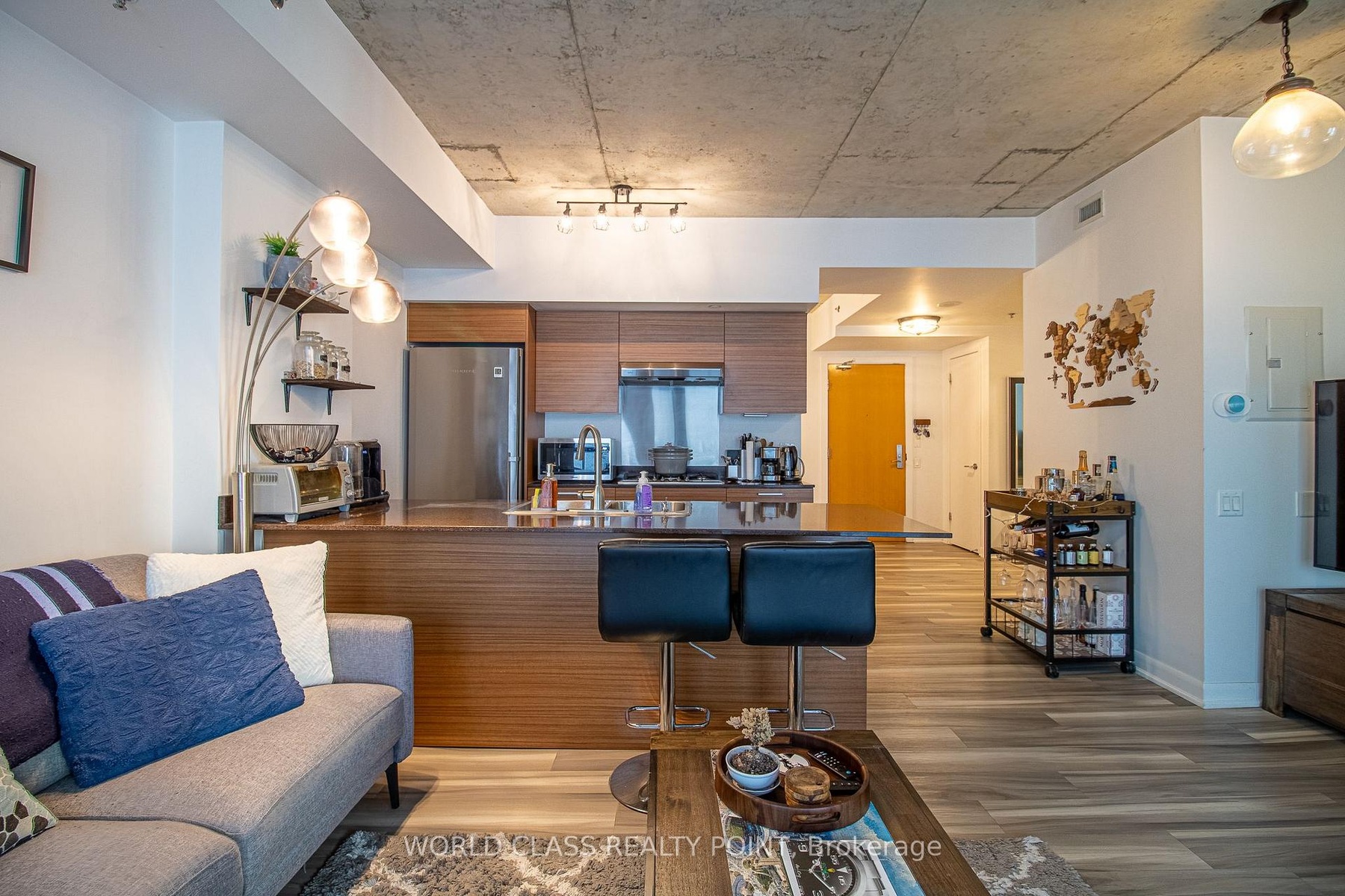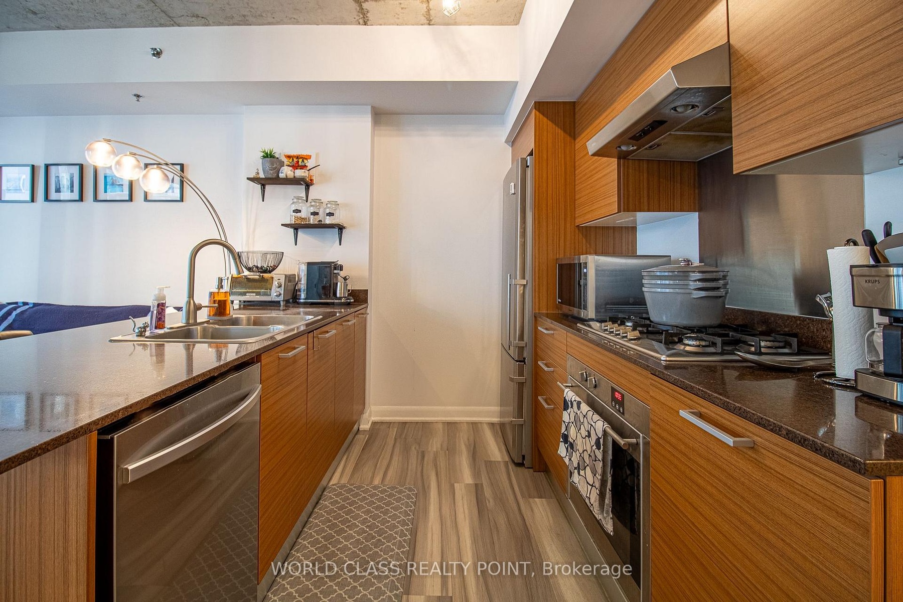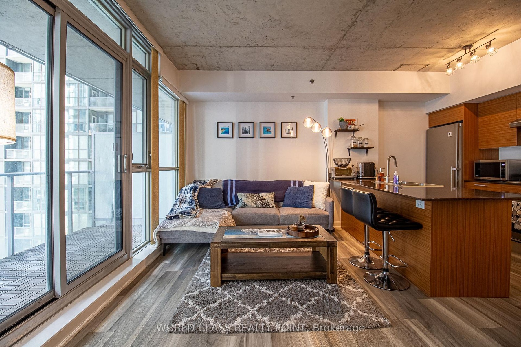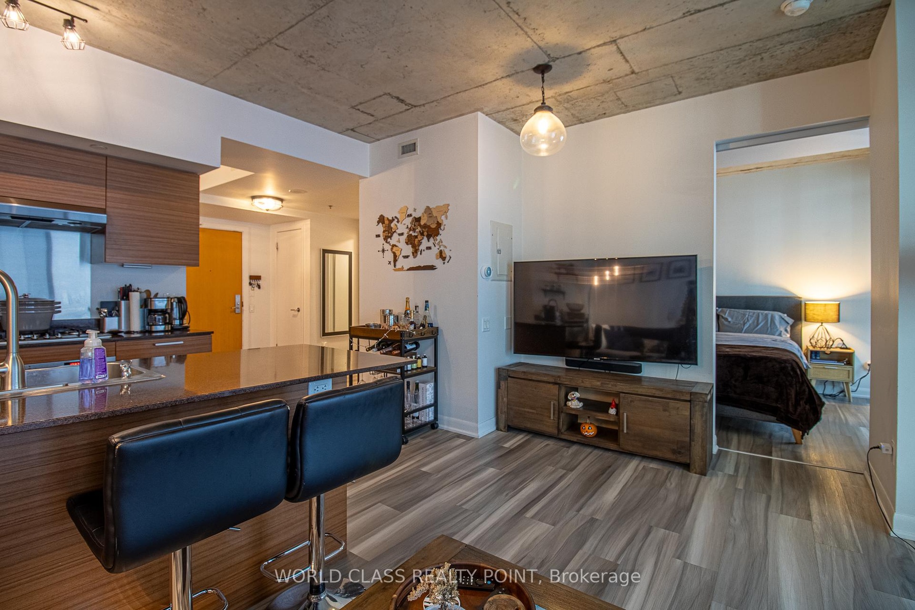 Experience elevated urban living in the heart of the Entertainment District at the iconic M5V Condos, where refined design meets modern vibrancy. Perfectly situated at the intersection of King & Peter with a 100 Walk Score and 100 Transit Score, this expansive 1+1 suite redefines downtown luxury. The thoughtfully designed den offers versatility - easily functioning as a second bedroom or home office. Featuring an open-concept floor plan with floor-to-ceiling east-facing windows that floods the space with natural light. The gourmet kitchen is a statement featuring full-sized stainless steel appliances, a sleek breakfast bar, and modern cabinetry. The primary bedroom boasts a spacious custom closet, while the ensuite laundry and dedicated storage room provide exceptional convenience and organization. Outside, the oversized balcony is an entertainer's dream, complete with upgraded patio tiles, making outdoor dining and lounging effortless. Residents of M5V enjoy five-star amenities, including a state-of-the-art fitness centre with brand-new equipment, Peloton room, yoga studio, steam rooms, a stylish entertainment lounge with a foosball and ping pong table, and an elevated BBQ terrace. Location, Location, Location! Located just steps from trendy cafés, restaurants, TTC, fitness studios, grocery stores, shopping, and The Well. This residence offers the best of urban convenience and contemporary elegance. Don't miss this rare opportunity - a true must-see in Toronto's most dynamic neighbourhood.