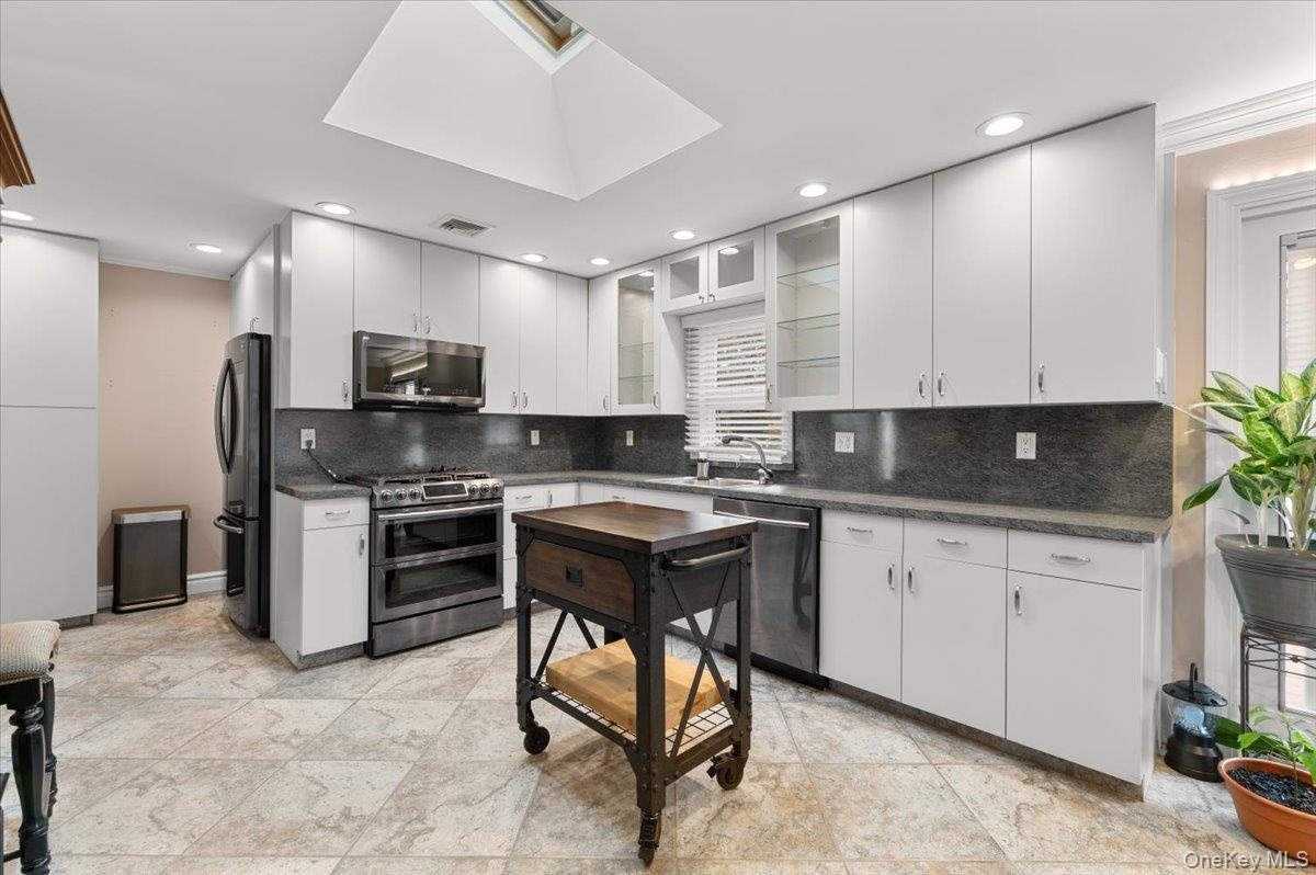 Step through the front door into a welcoming foyer that opens to a bright, spacious living room filled with natural light. A beautifully crafted stone fireplace with custom mantle serves as the centerpiece, while dual entryways lead to the expansive eat-in chef’s kitchen. Here you’ll find custom cabinetry, abundant storage, new appliances, and vibrant illumination from recessed LED lighting and a skylight above. The kitchen easily accommodates a six-person dining table and provides direct access to a large backyard entertaining deck with a roll-up awning—perfect for outdoor gatherings.