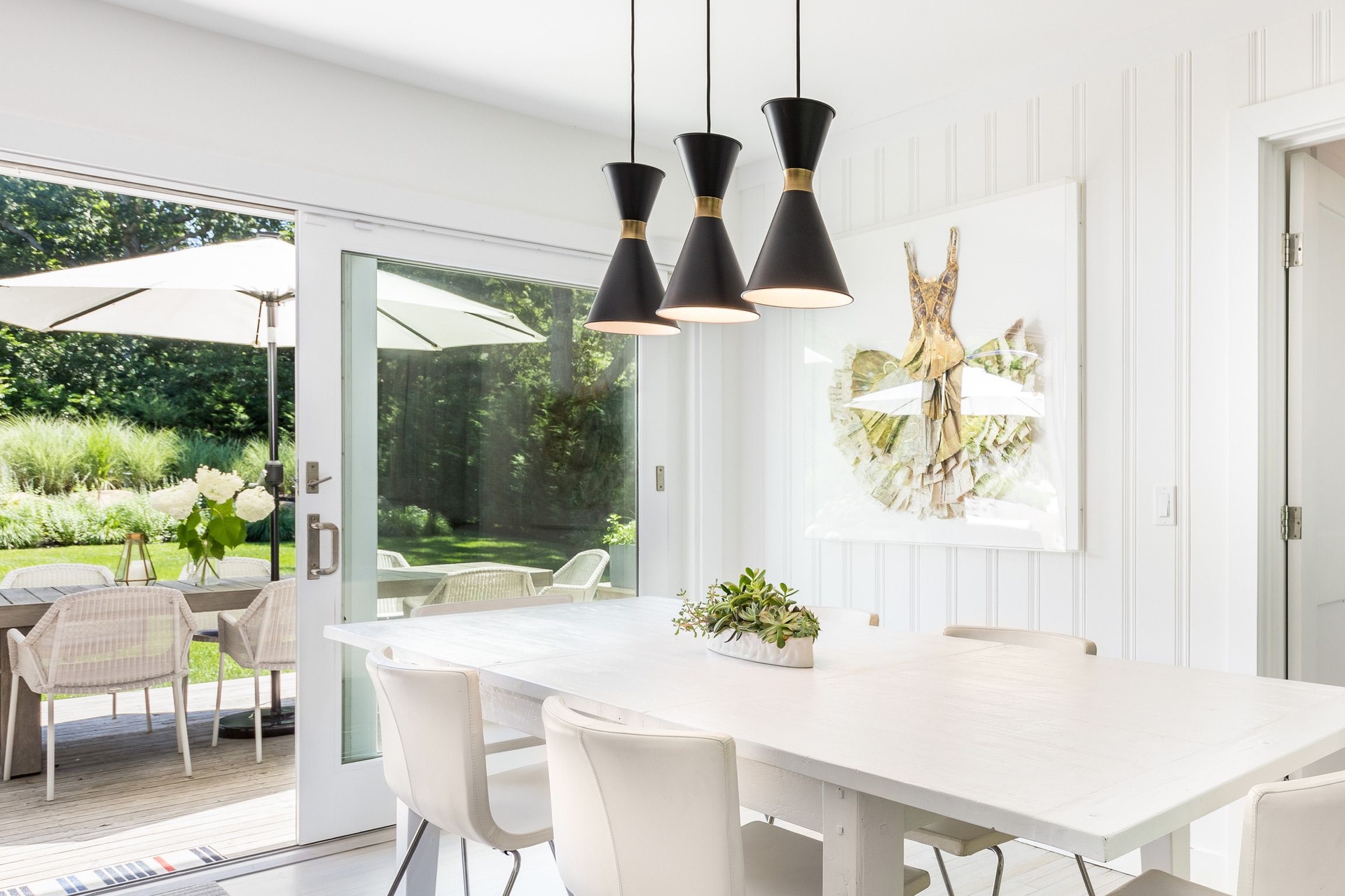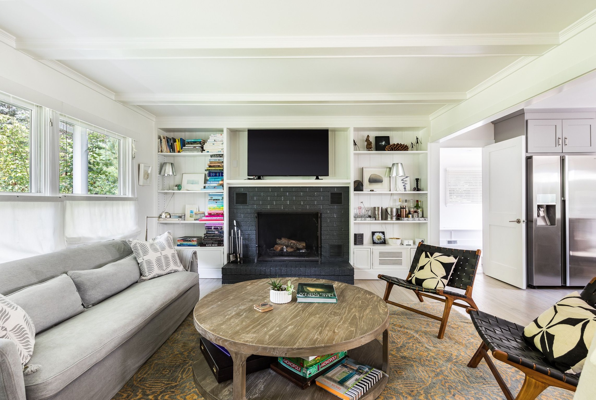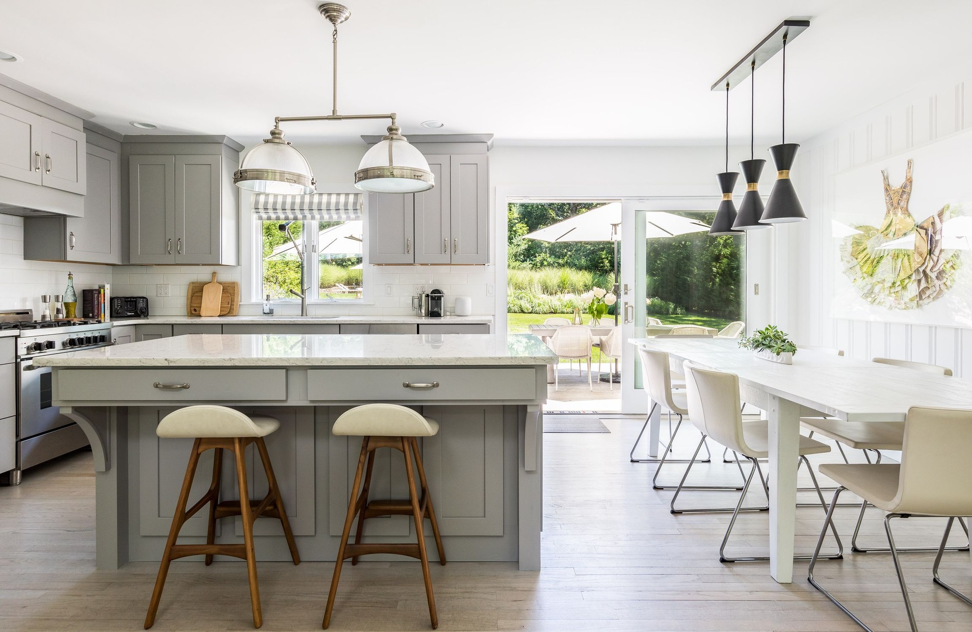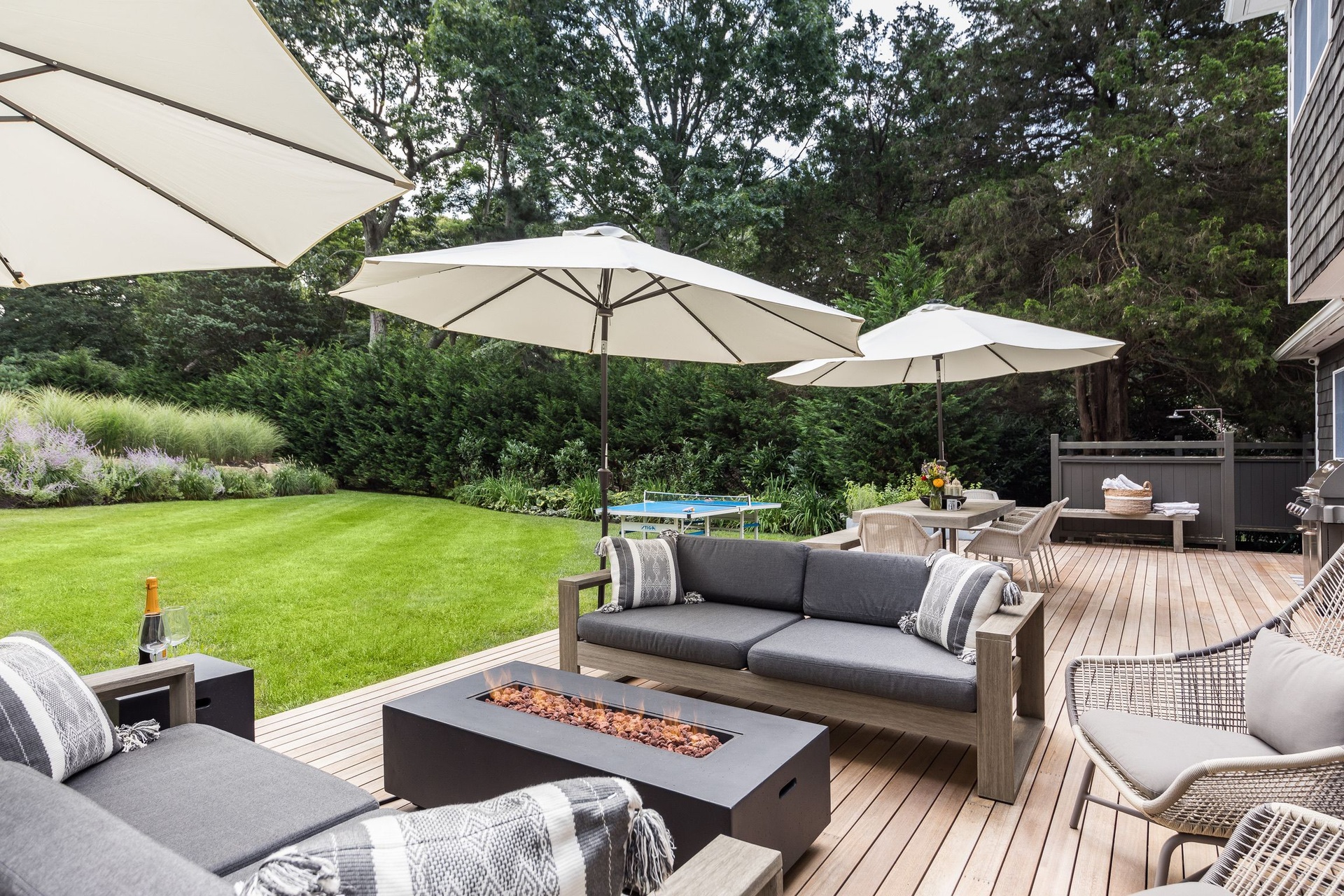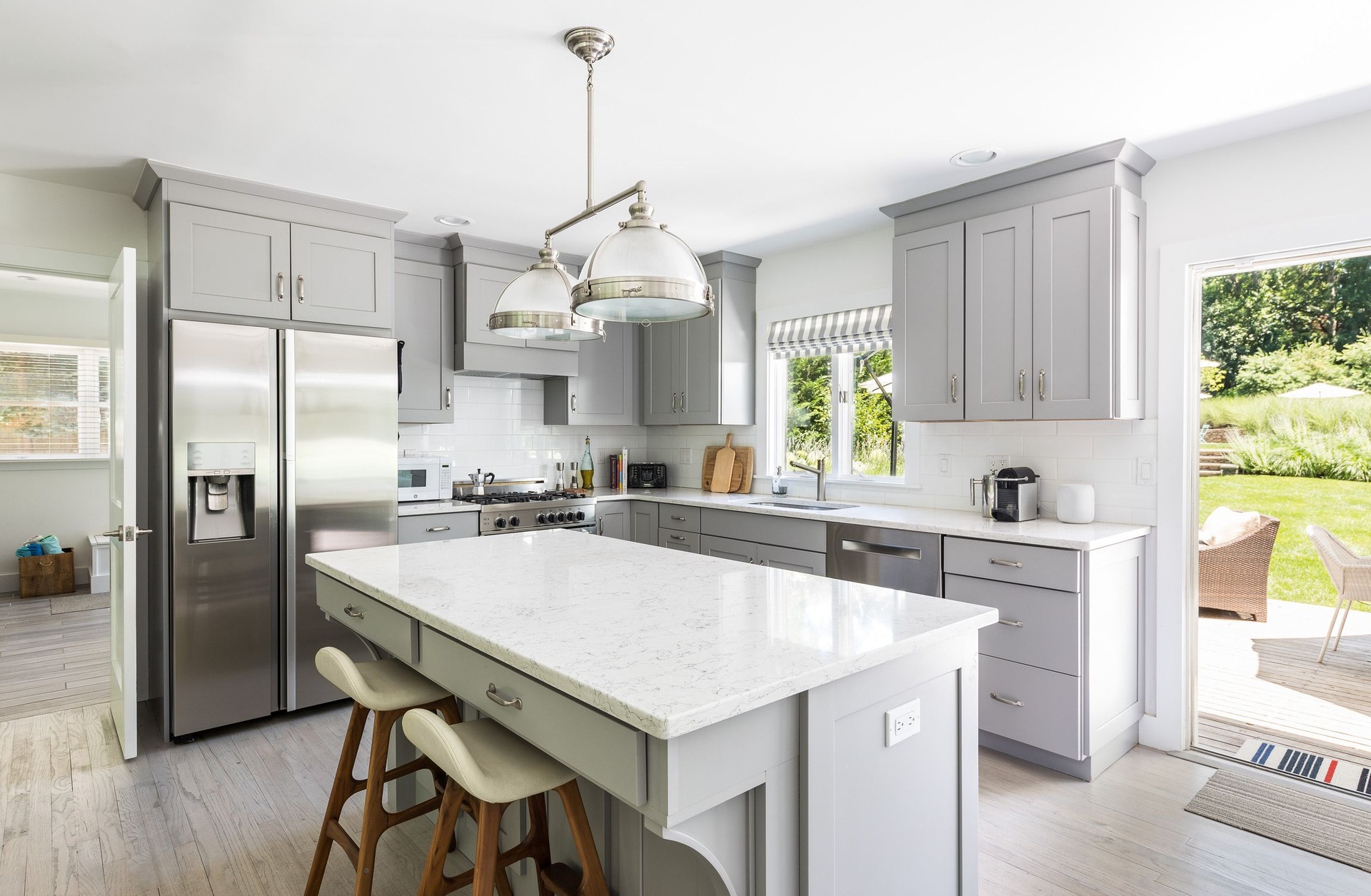 Outside, enjoy an enclosed backyard featuring a saltwater gunite pool, outdoor shower, fire pit, and a dining area that seats ten ideal for summer entertaining.