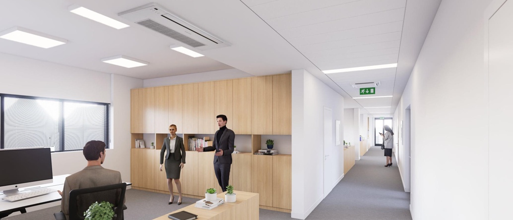 The property features Daikin heating and cooling systems with heat pumps and fan coil units, electric underfloor heating in restrooms, and individual electricity and water meters for each office unit.