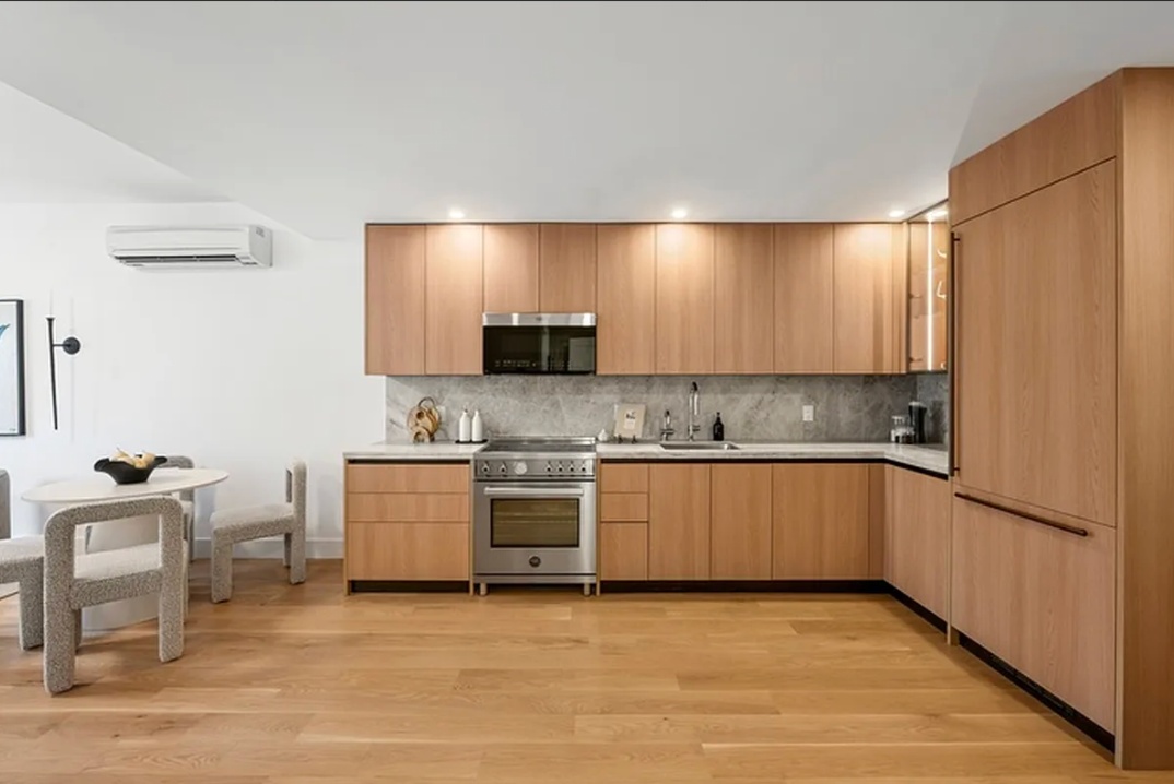 The expansive open-plan living and dining area boasts wide plank white oak floors and large windows that flood the space with natural light. Sliding glass doors open onto a private terrace, creating a seamless transition between indoor and outdoor living. The chef’s kitchen is designed with functionality and elegance in mind, featuring imported Italian cabinetry from Scavolini, Taj Mahal quartzite countertops, and high-end Bertazzoni appliances, including a panel-ready refrigerator and dishwasher. The combination of sleek surfaces and top-tier appliances ensures that the kitchen is both a culinary haven and a stylish centerpiece of the home.