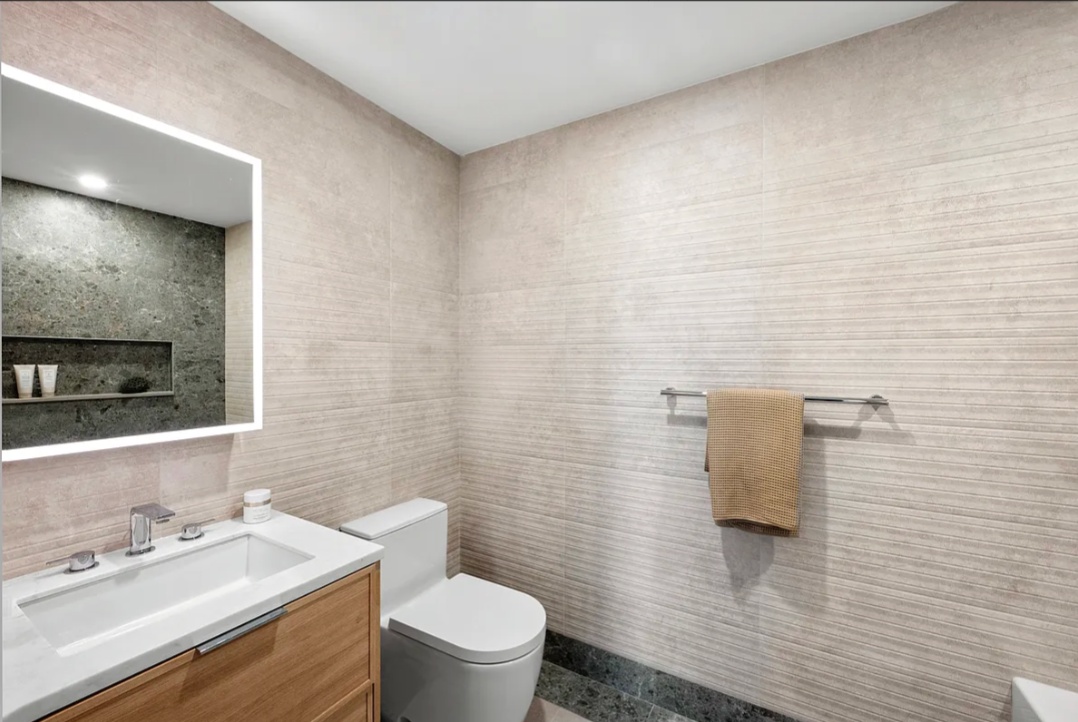 The king-size primary bedroom offers abundant space, natural light, and a walk-in closet. The en-suite bathroom is designed with relaxation in mind, featuring chrome fixtures, a custom Ocala Walnut scalloped vanity topped with Calacatta Miraggio, and luxurious Vive tiles imported from Spain. The second bedroom is versatile, ideal for use as a guest room, home office, or family space, and is conveniently located near the second full bathroom, which mirrors the high-end finishes of the primary bath. A full-size washer/dryer is tucked away for ultimate convenience.