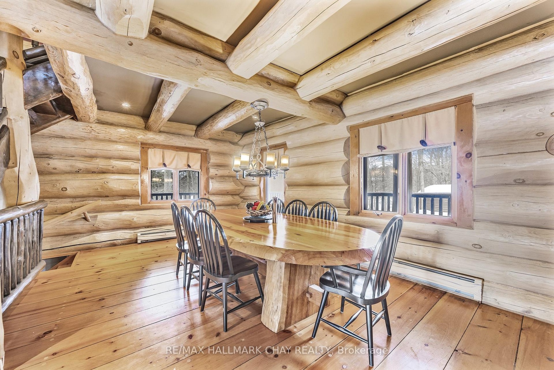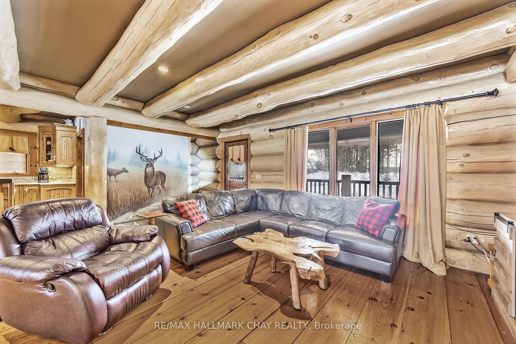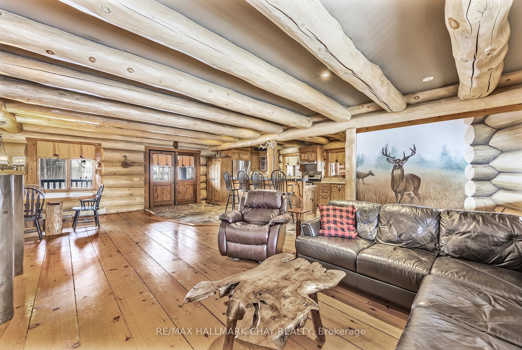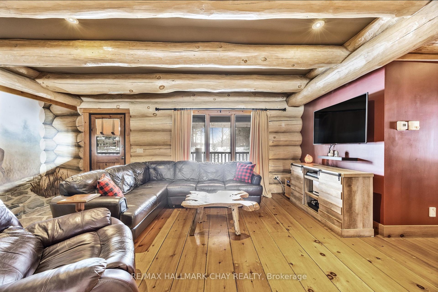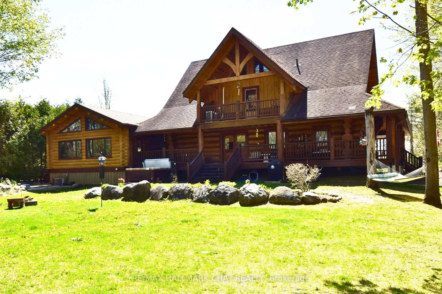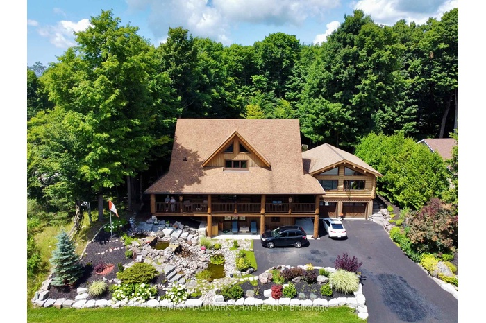 Welcome to 118 Highland Drive, Oro-Medonte. Discover the charm and craftsmanship of this stunning log home in the heart of Horseshoe Valley. Featured in the movie The Christmas Chronicles starring Kurt Russell, this home radiates warmth and comfort, complemented by award-winning landscaping and a breathtaking 3-tier pond a tranquil highlight of the property. Step inside to a spacious foyer with tile flooring which leads into a cozy yet expansive rec room with rich hardwood floors. This level also features a beautiful wet bar, a comfortable bedroom, and a 4-piece bathroom, ideal for entertaining or hosting guests.The open-concept main floor is designed for modern living. The kitchen dazzles with granite countertops, stainless steel appliances, and a breakfast bar, flowing effortlessly into the dining and living room. A walk-in pantry with a built-in freezer and second fridge provides exceptional storage, while a stylish powder room completes this level.The second floor offers two generously sized bedrooms, each with its own ensuite. The primary suite boasts a walkout to a private balcony overlooking the backyard and includes a convenient laundry area. A bright office space and soaring cathedral ceilings with wood beams enhance the airy ambiance of the home.The heated garage, complete with an entertainment room above, blends utility with style. Outdoor living is equally impressive, with multiple walkouts to covered porches, including a wrap-around porch and private balconiesperfect for soaking in the peaceful surroundings. You will love the cleanliness and efficiency of the water radiators and in-floor heating, ensuring consistent warmth and a clean, comfortable atmosphere throughout.Situated just one minute from Vetta Nordic Spa, five minutes from Horseshoe Valley Resort, and close to Craighurst amenities and major highways, this property offers a harmonious blend of natural beauty and unmatched convenience.