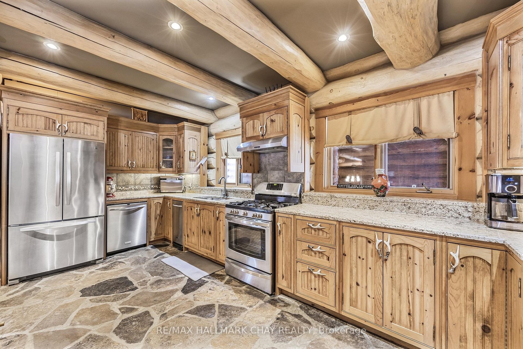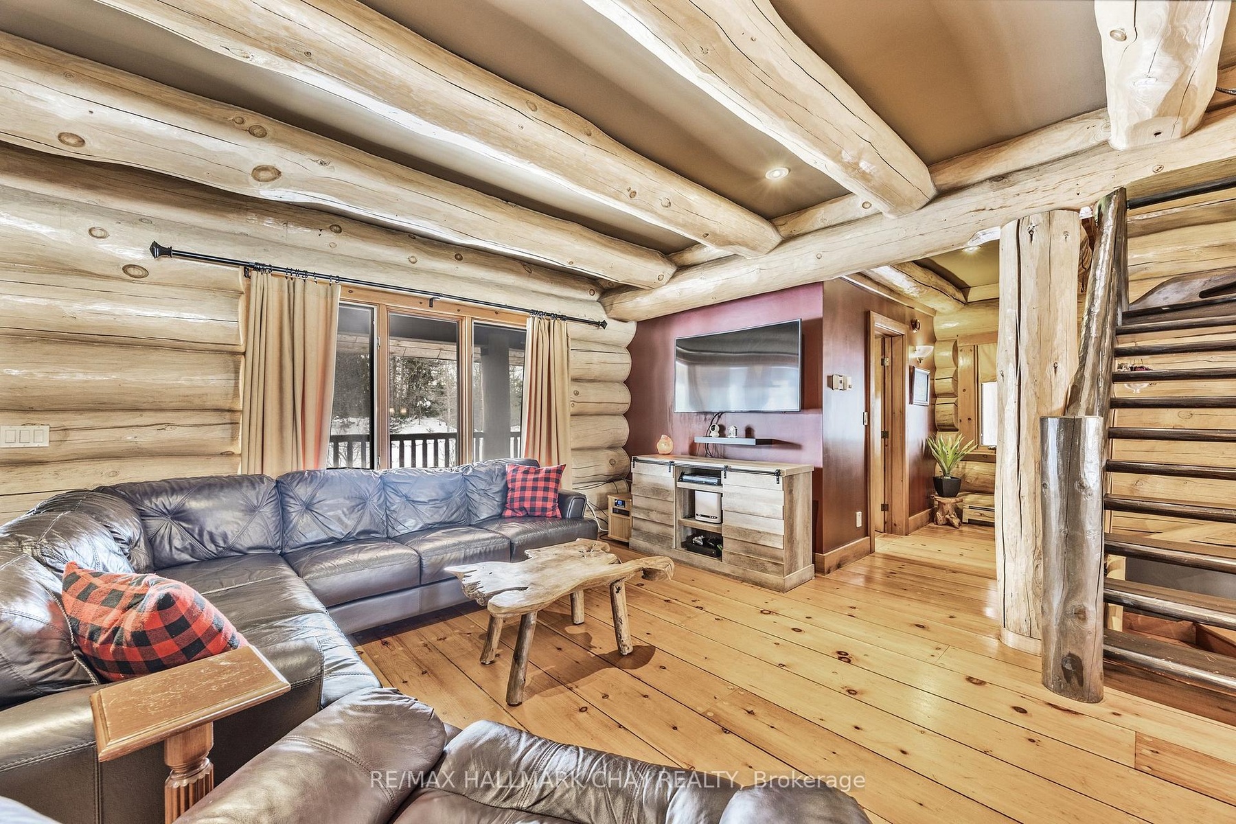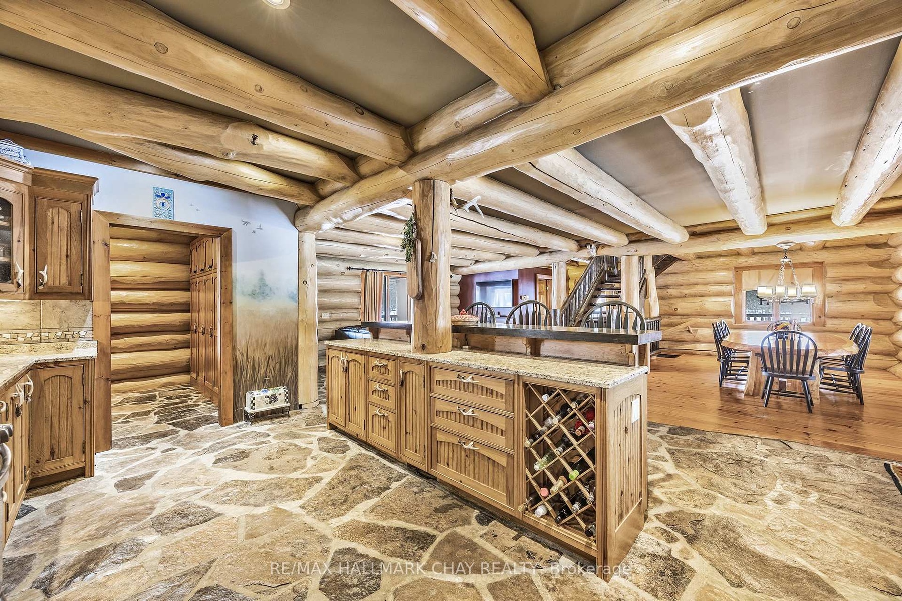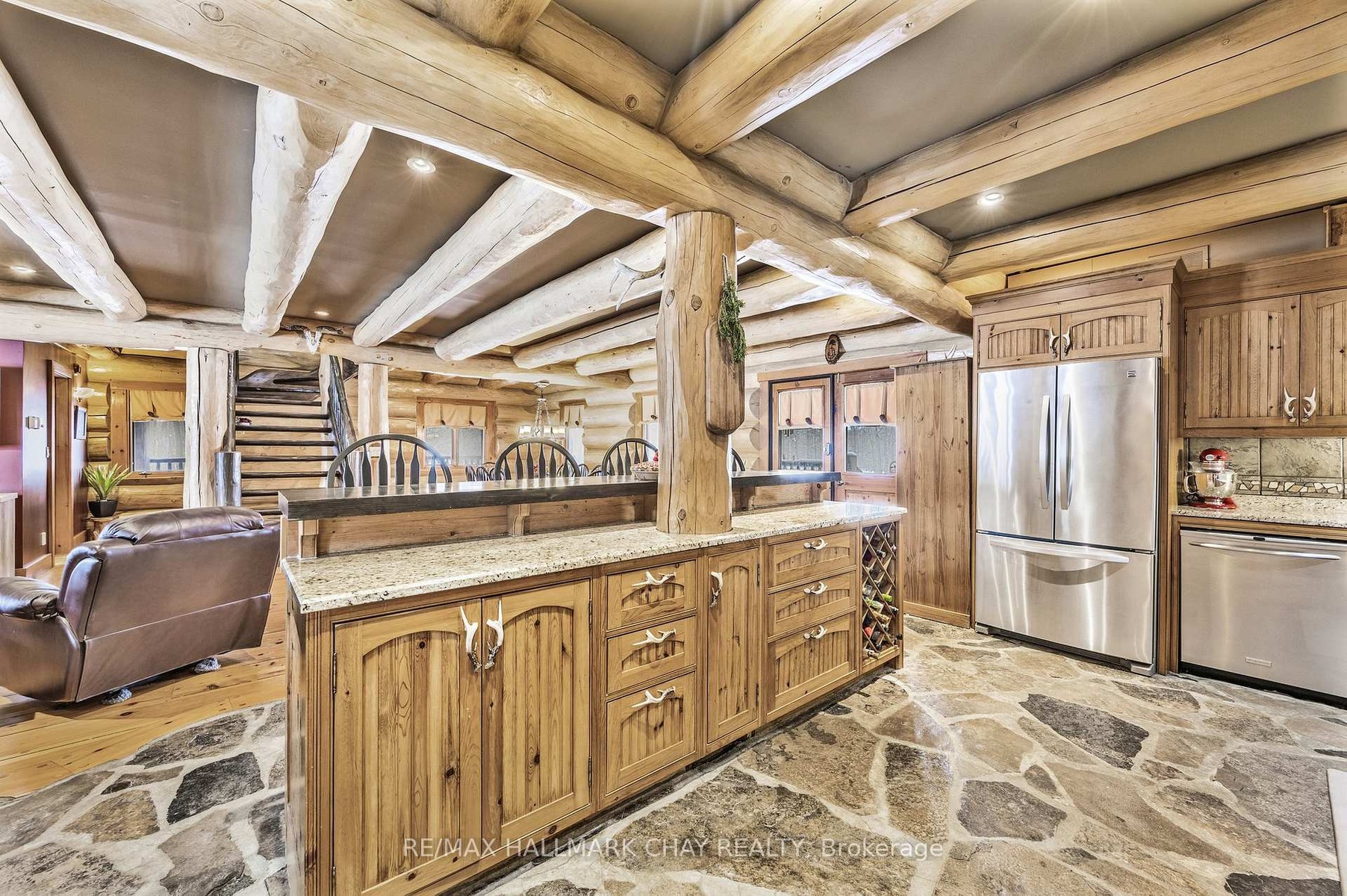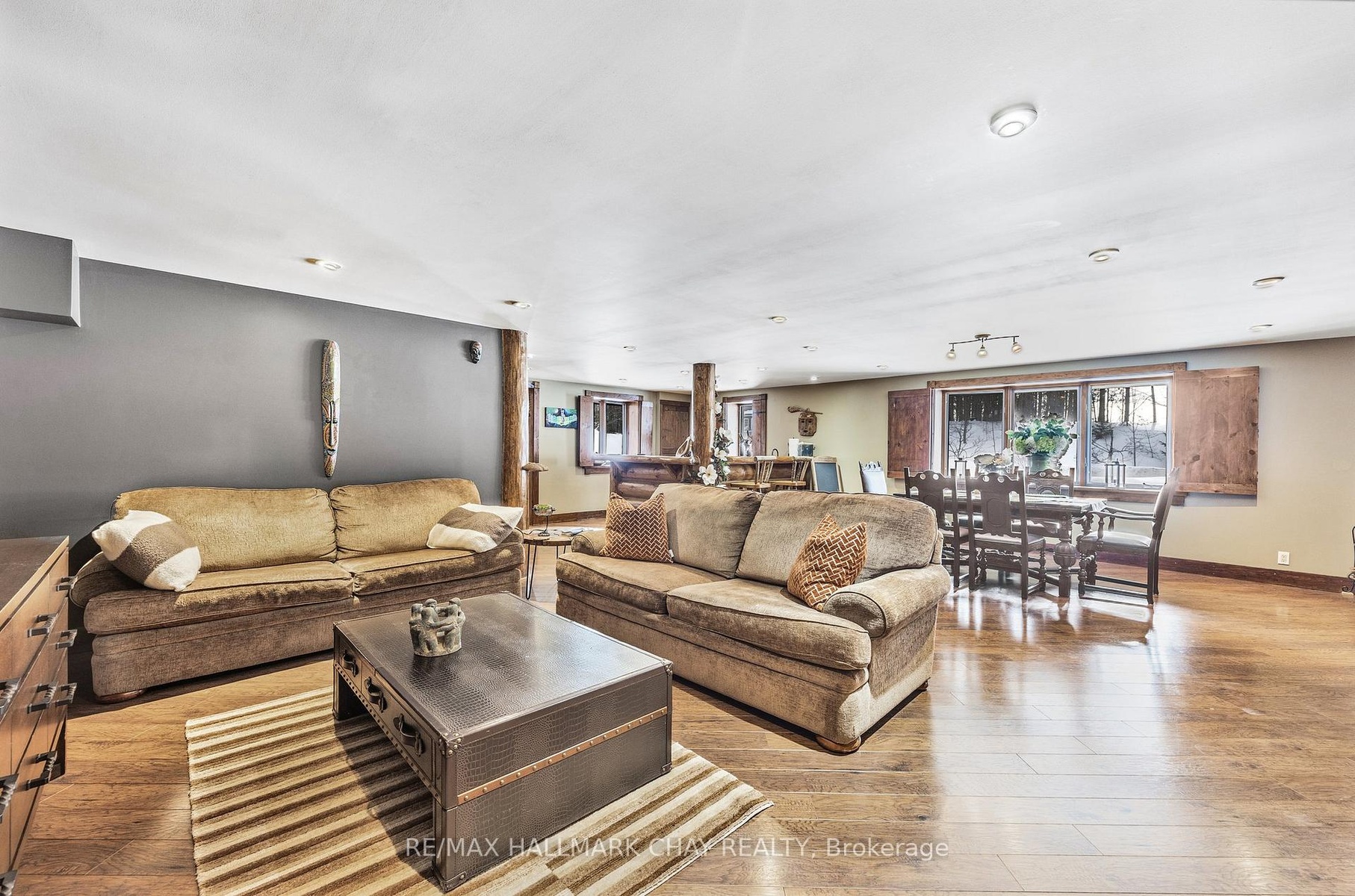 Welcome to 118 Highland Drive, Oro-Medonte. Discover the charm and craftsmanship of this stunning log home in the heart of Horseshoe Valley. Featured in the movie The Christmas Chronicles starring Kurt Russell, this home radiates warmth and comfort, complemented by award-winning landscaping and a breathtaking 3-tier pond a tranquil highlight of the property. Step inside to a spacious foyer with tile flooring which leads into a cozy yet expansive rec room with rich hardwood floors. This level also features a beautiful wet bar, a comfortable bedroom, and a 4-piece bathroom, ideal for entertaining or hosting guests.The open-concept main floor is designed for modern living. The kitchen dazzles with granite countertops, stainless steel appliances, and a breakfast bar, flowing effortlessly into the dining and living room. A walk-in pantry with a built-in freezer and second fridge provides exceptional storage, while a stylish powder room completes this level.The second floor offers two generously sized bedrooms, each with its own ensuite. The primary suite boasts a walkout to a private balcony overlooking the backyard and includes a convenient laundry area. A bright office space and soaring cathedral ceilings with wood beams enhance the airy ambiance of the home.The heated garage, complete with an entertainment room above, blends utility with style. Outdoor living is equally impressive, with multiple walkouts to covered porches, including a wrap-around porch and private balconiesperfect for soaking in the peaceful surroundings. You will love the cleanliness and efficiency of the water radiators and in-floor heating, ensuring consistent warmth and a clean, comfortable atmosphere throughout.Situated just one minute from Vetta Nordic Spa, five minutes from Horseshoe Valley Resort, and close to Craighurst amenities and major highways, this property offers a harmonious blend of natural beauty and unmatched convenience.