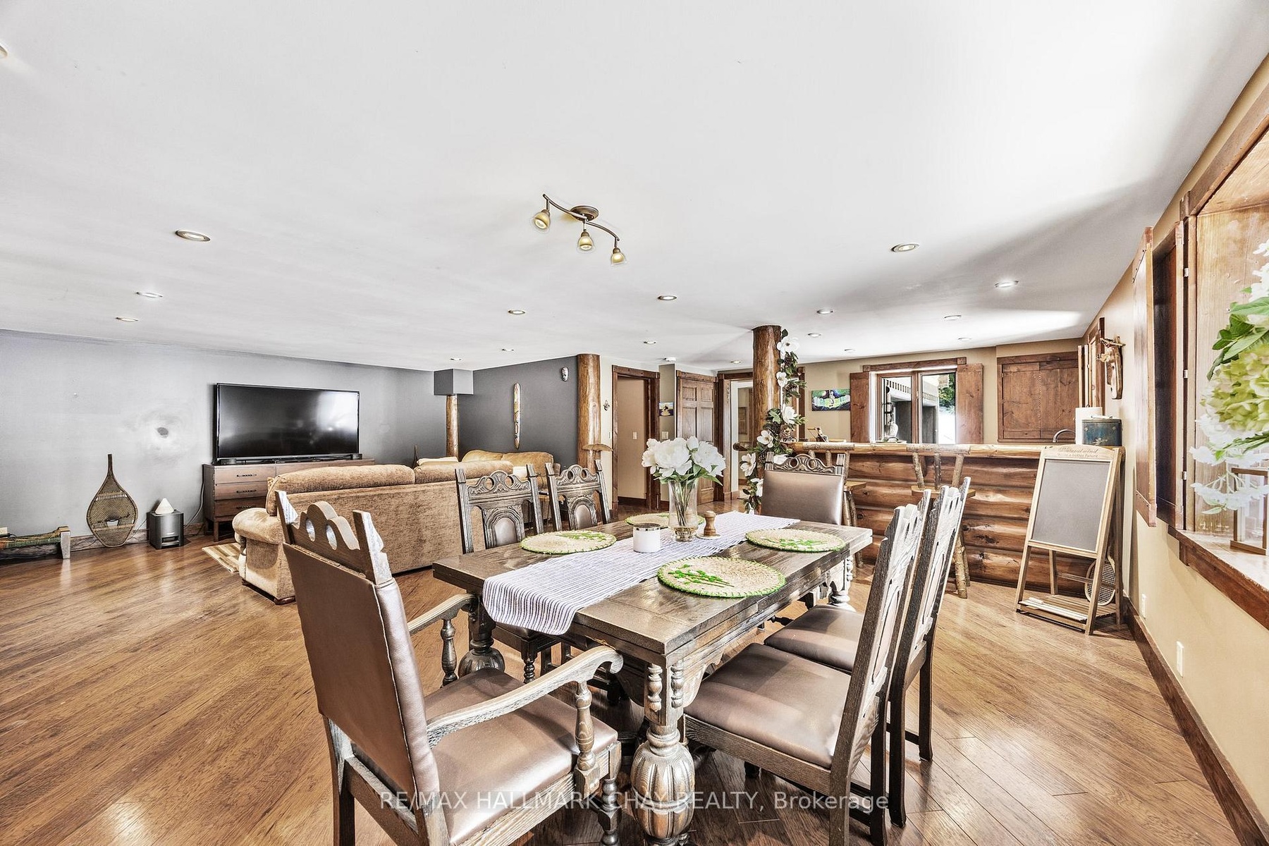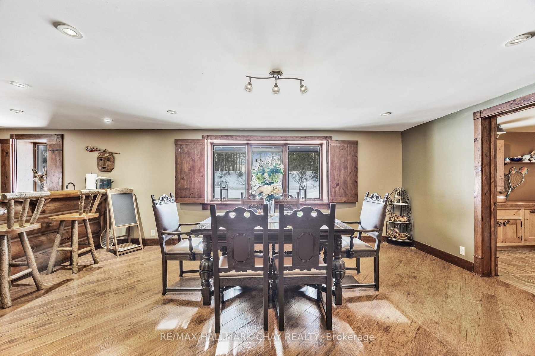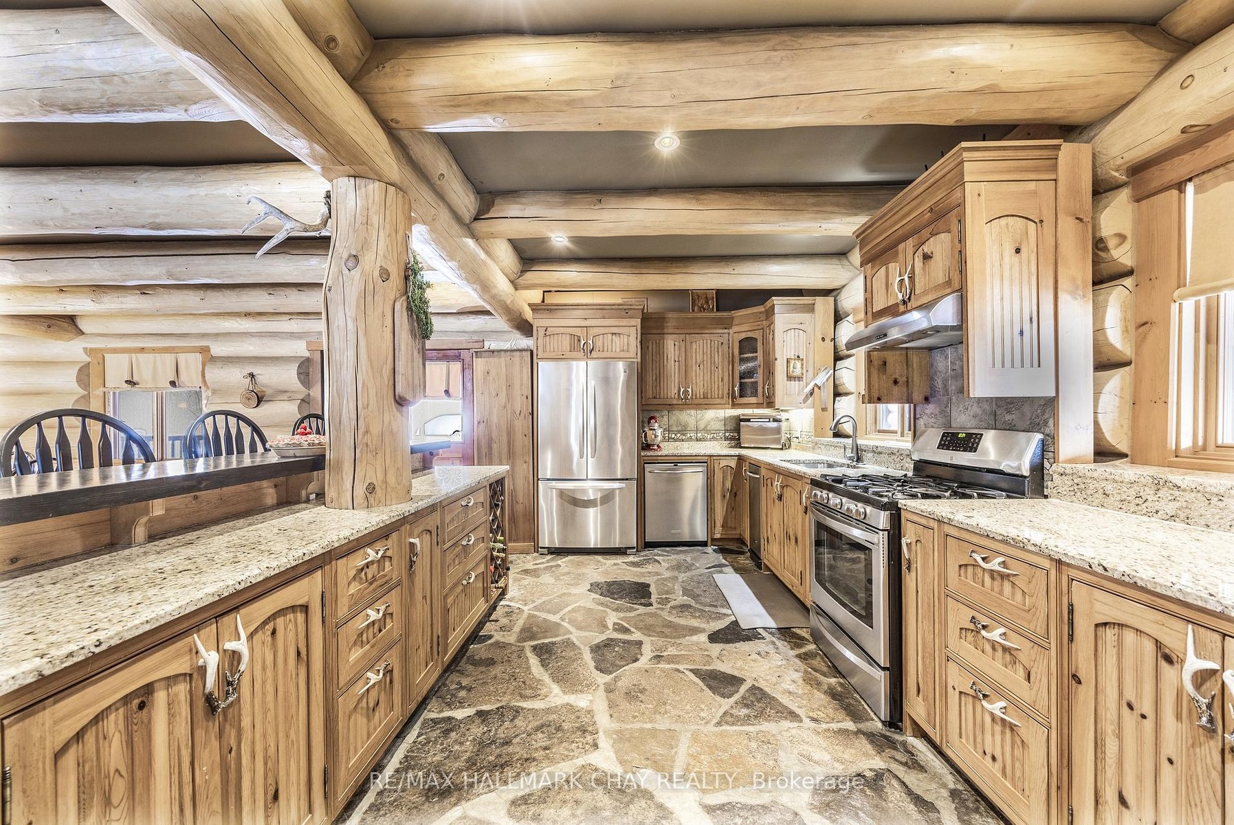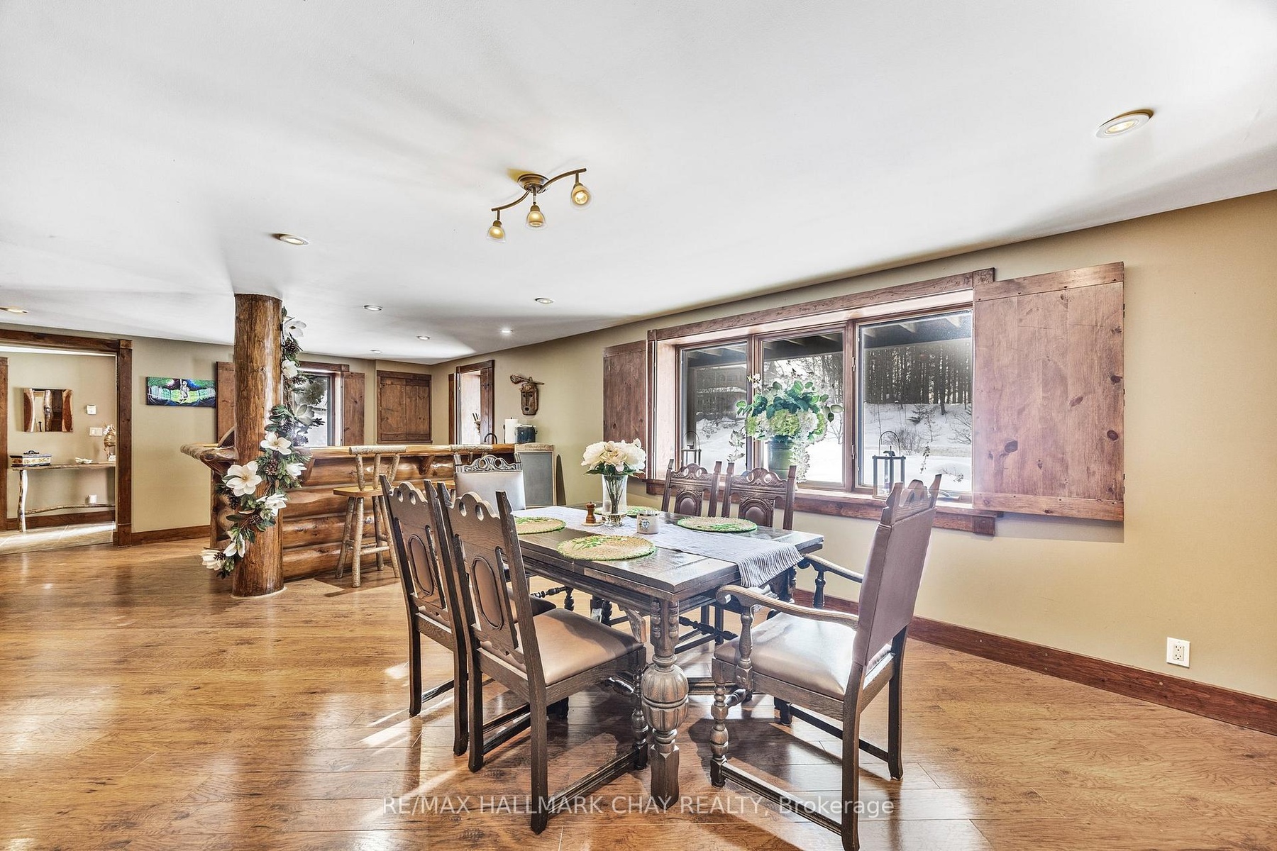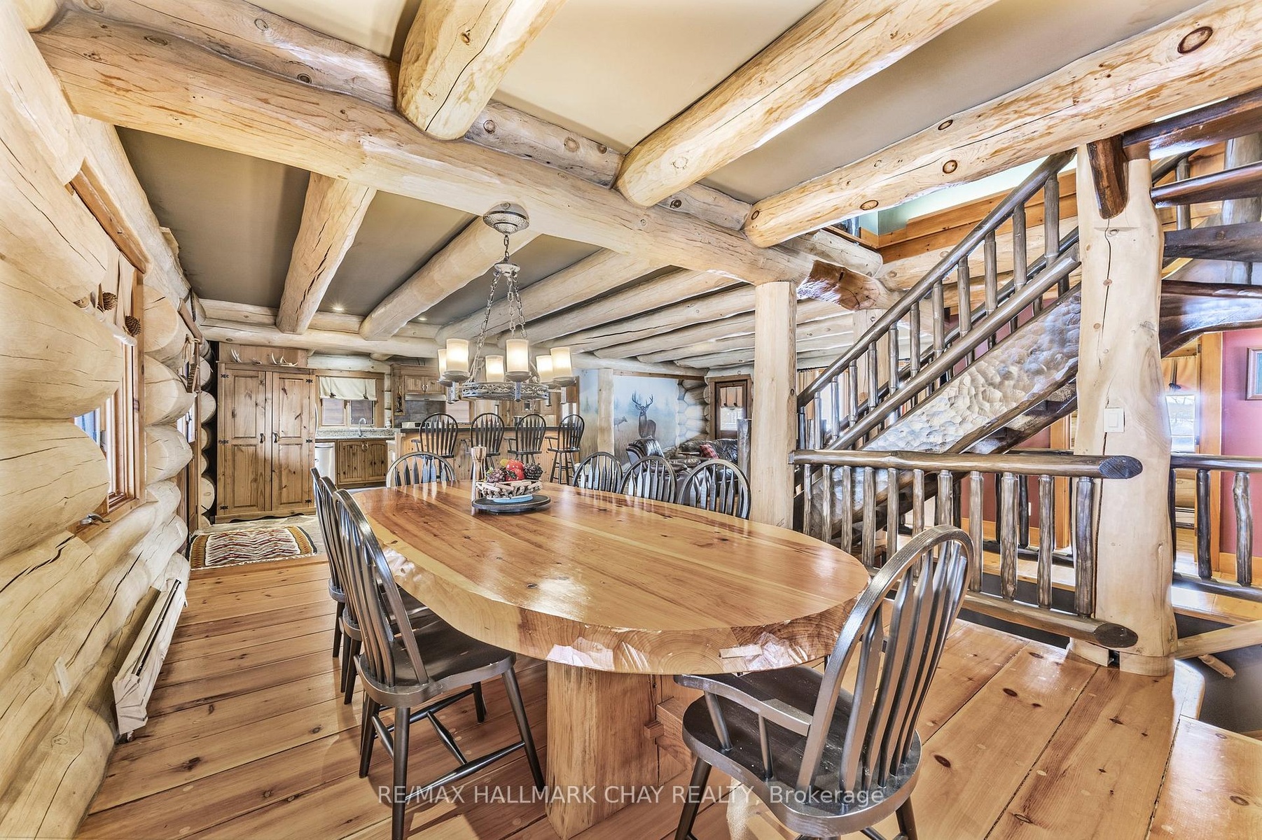Welcome to 118 Highland Drive, Oro-Medonte. Discover the charm and craftsmanship of this stunning log home in the heart of Horseshoe Valley. Featured in the movie The Christmas Chronicles starring Kurt Russell, this home radiates warmth and comfort, complemented by award-winning landscaping and a breathtaking 3-tier pond a tranquil highlight of the property. Step inside to a spacious foyer with tile flooring which leads into a cozy yet expansive rec room with rich hardwood floors. This level also features a beautiful wet bar, a comfortable bedroom, and a 4-piece bathroom, ideal for entertaining or hosting guests.The open-concept main floor is designed for modern living. The kitchen dazzles with granite countertops, stainless steel appliances, and a breakfast bar, flowing effortlessly into the dining and living room. A walk-in pantry with a built-in freezer and second fridge provides exceptional storage, while a stylish powder room completes this level.The second floor offers two generously sized bedrooms, each with its own ensuite. The primary suite boasts a walkout to a private balcony overlooking the backyard and includes a convenient laundry area. A bright office space and soaring cathedral ceilings with wood beams enhance the airy ambiance of the home.The heated garage, complete with an entertainment room above, blends utility with style. Outdoor living is equally impressive, with multiple walkouts to covered porches, including a wrap-around porch and private balconiesperfect for soaking in the peaceful surroundings. You will love the cleanliness and efficiency of the water radiators and in-floor heating, ensuring consistent warmth and a clean, comfortable atmosphere throughout.Situated just one minute from Vetta Nordic Spa, five minutes from Horseshoe Valley Resort, and close to Craighurst amenities and major highways, this property offers a harmonious blend of natural beauty and unmatched convenience.