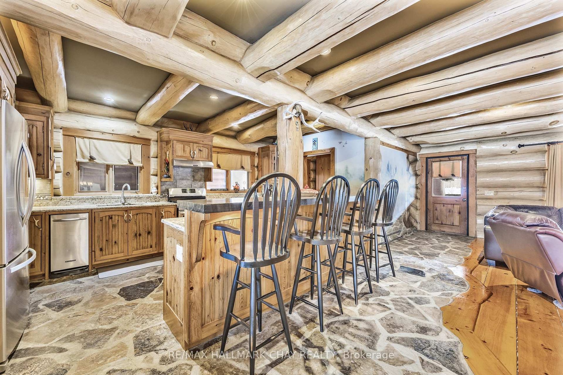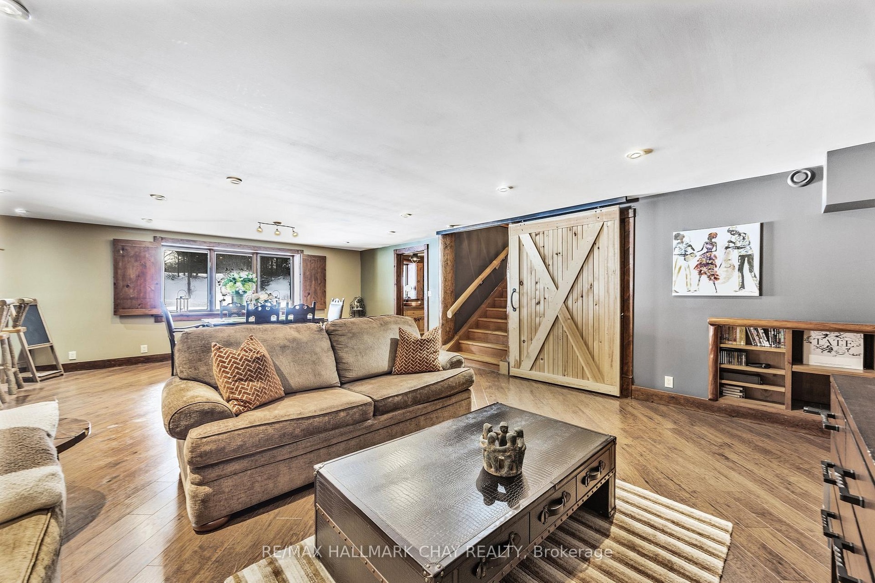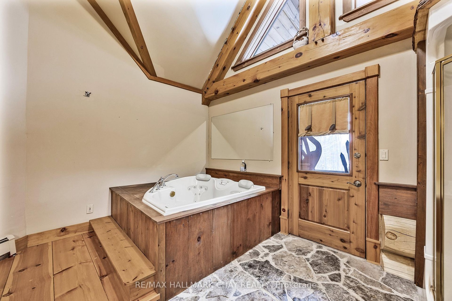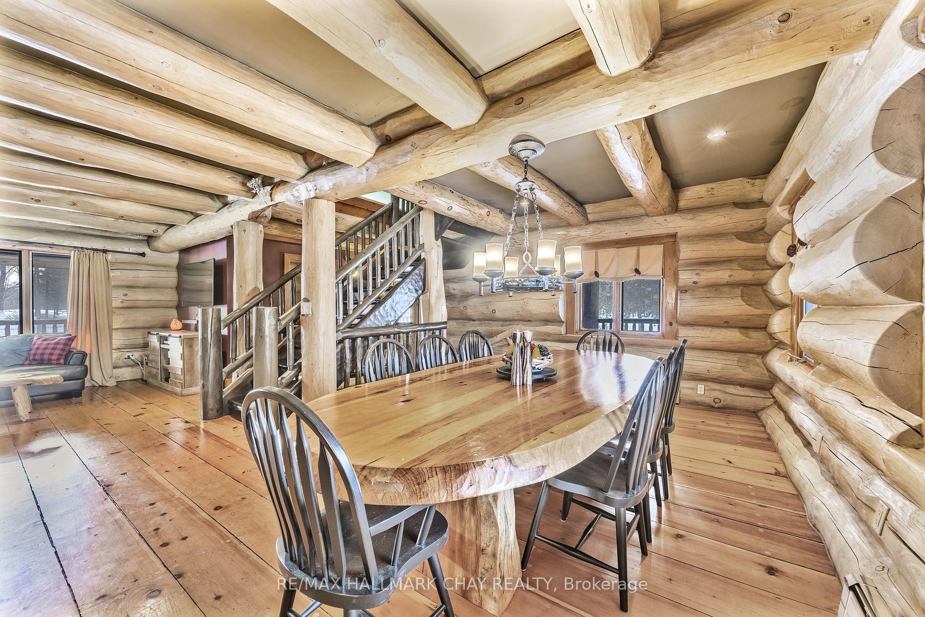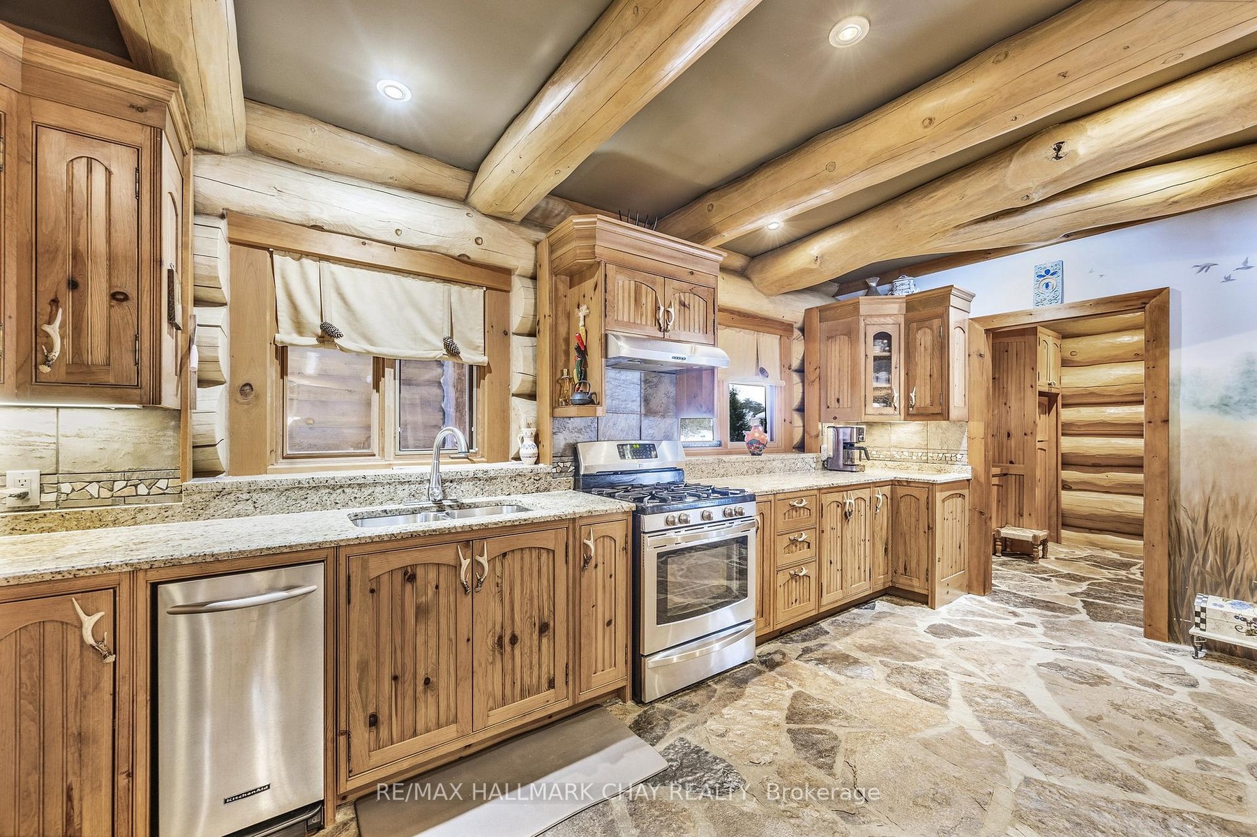 Welcome to 118 Highland Drive, Oro-Medonte. Discover the charm and craftsmanship of this stunning log home in the heart of Horseshoe Valley. Featured in the movie The Christmas Chronicles starring Kurt Russell, this home radiates warmth and comfort, complemented by award-winning landscaping and a breathtaking 3-tier pond a tranquil highlight of the property. Step inside to a spacious foyer with tile flooring which leads into a cozy yet expansive rec room with rich hardwood floors. This level also features a beautiful wet bar, a comfortable bedroom, and a 4-piece bathroom, ideal for entertaining or hosting guests.The open-concept main floor is designed for modern living. The kitchen dazzles with granite countertops, stainless steel appliances, and a breakfast bar, flowing effortlessly into the dining and living room. A walk-in pantry with a built-in freezer and second fridge provides exceptional storage, while a stylish powder room completes this level.The second floor offers two generously sized bedrooms, each with its own ensuite. The primary suite boasts a walkout to a private balcony overlooking the backyard and includes a convenient laundry area. A bright office space and soaring cathedral ceilings with wood beams enhance the airy ambiance of the home.The heated garage, complete with an entertainment room above, blends utility with style. Outdoor living is equally impressive, with multiple walkouts to covered porches, including a wrap-around porch and private balconiesperfect for soaking in the peaceful surroundings. You will love the cleanliness and efficiency of the water radiators and in-floor heating, ensuring consistent warmth and a clean, comfortable atmosphere throughout.Situated just one minute from Vetta Nordic Spa, five minutes from Horseshoe Valley Resort, and close to Craighurst amenities and major highways, this property offers a harmonious blend of natural beauty and unmatched convenience.