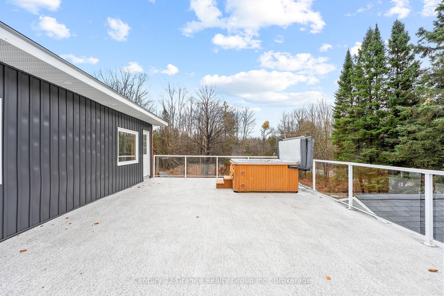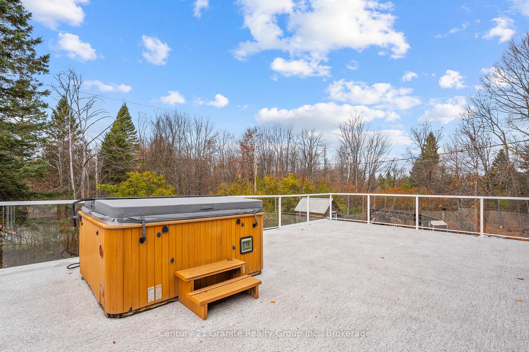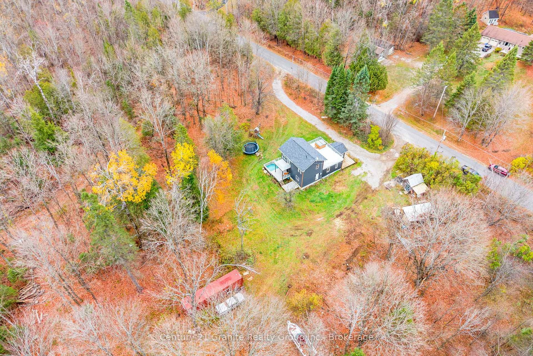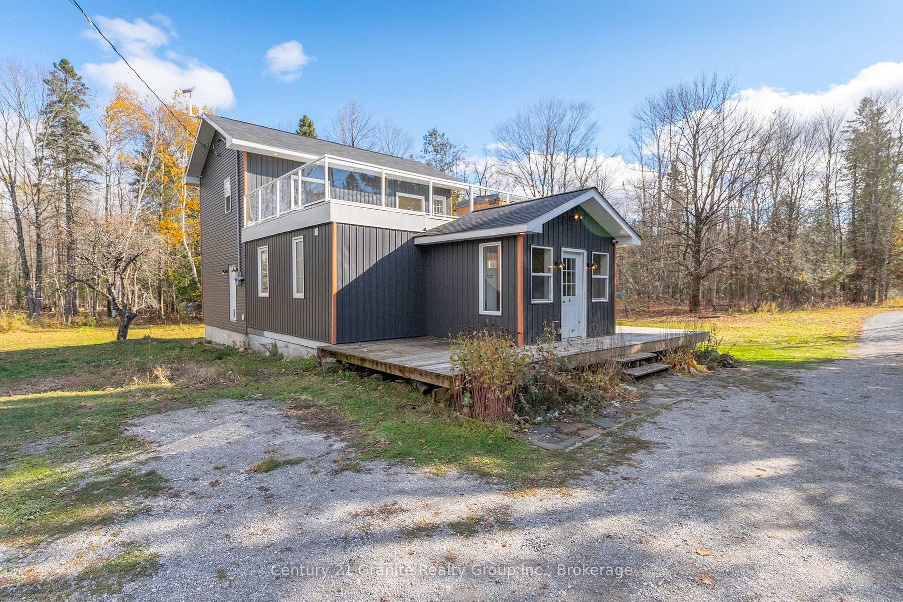 Peaceful country living just minutes from town! Nestled on a beautiful 5-acre property surrounded by mature trees, this inviting home combines comfort, privacy, and convenience. Offering approximately 1,600 sq ft of living space, it features 4 bedrooms and 2 bathrooms - ideal for families, downsizers, or weekend getaways. The main level boasts a bright open layout with warm wood accents and plenty of natural light. The kitchen offers ample counter space and cabinetry, opening to the dining and living areas for easy entertaining. Two bedrooms on this level provide flexibility for guests, children, or a home office, along with a full bathroom and laundry room. Upstairs, the primary suite serves as a peaceful retreat complete with a walk-in closet, private balcony, and soaker-tub ensuite, while the second upper bedroom adds extra space for family or visitors. A large rooftop porch with a hot tub offers a relaxing space to unwind and take in the beautiful country views - perfect for enjoying quiet mornings or star-filled nights. Step outside to enjoy the best of country life - open yard space, wooded surroundings, and room to relax, garden, or explore. With quick access to Highway 35, schools, and nearby amenities, this property offers the serenity of rural living without sacrificing convenience.