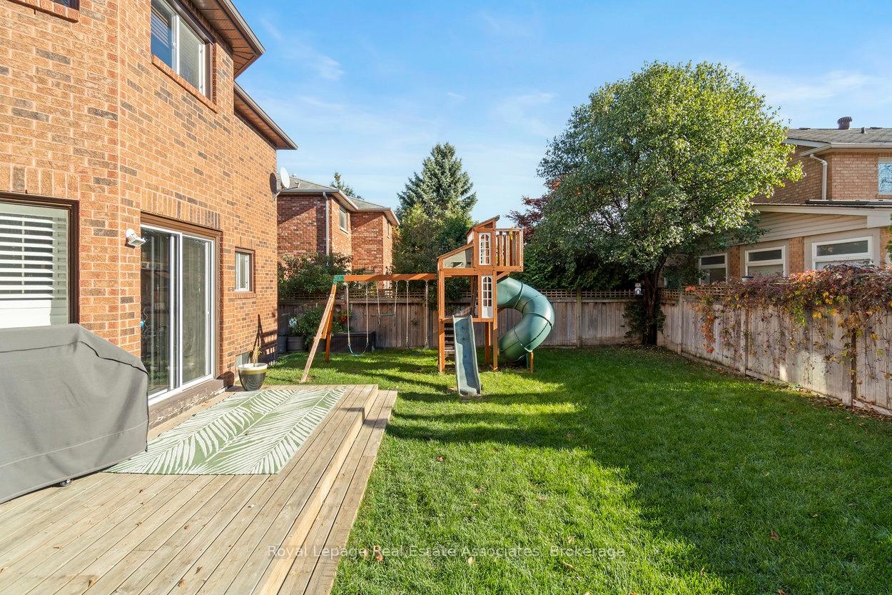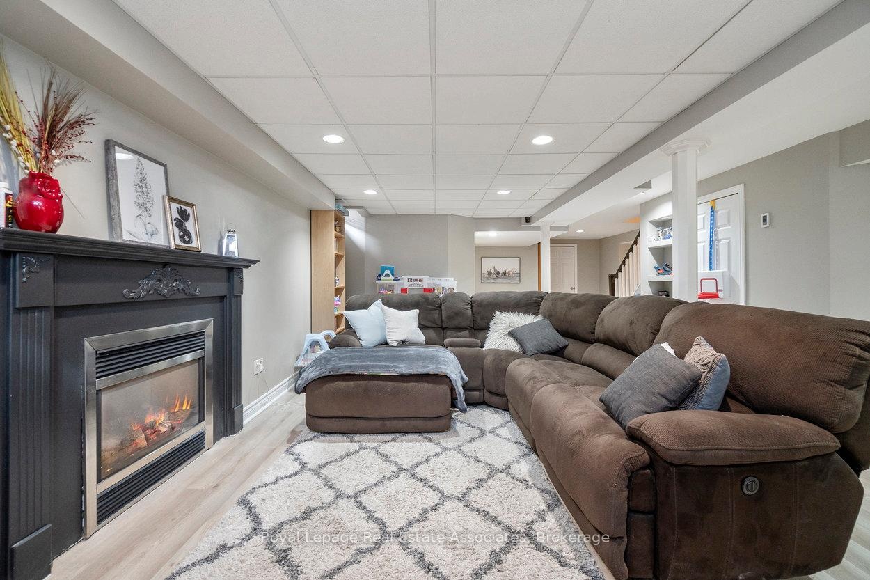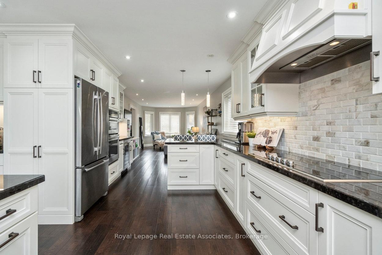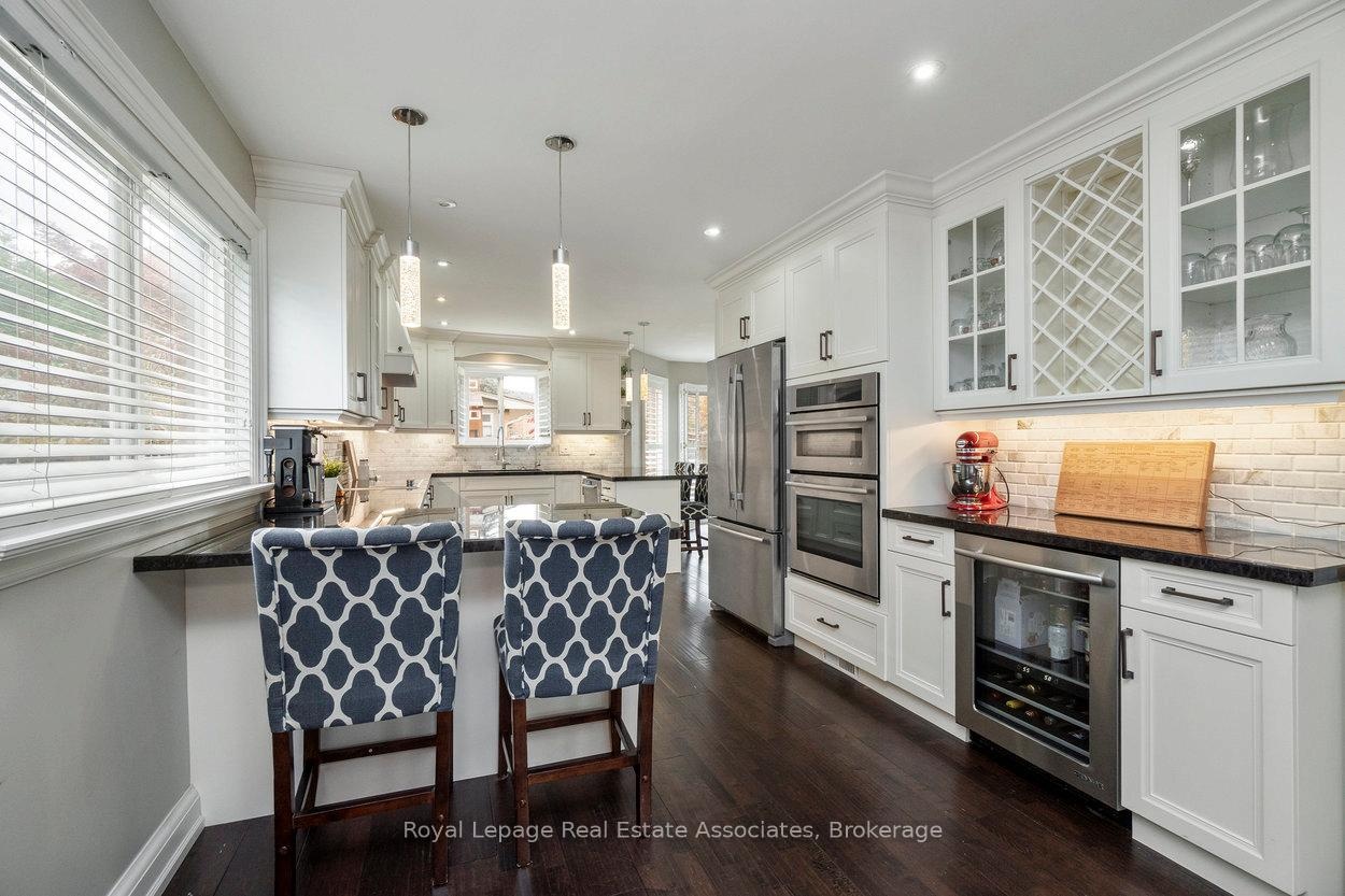 Welcome to this beautifully maintained 4 + 1 bedroom 2-storey home, offering approximately 2,400 sq ft plus a fully finished basement. Built in 1991, this property blends timeless design with thoughtful updates throughout. Engineered hardwood flooring spans the main and second levels, while the heart of the home - a stunning peninsula kitchen - features granite counters, custom cabinetry and counter seating on both ends, along with a sleek cooktop, built-in oven, microwave and built-in beverage fridge with wine bottle storage. The spacious primary bedroom includes a walk-in closet and a spa-like 5-piece ensuite with a freestanding tub and glass-enclosed shower. The finished basement adds even more living space with a large rec room, vinyl flooring, second gas fireplace, an extra bedroom, office space and a 3-piece bathroom. Outside, enjoy a private, landscaped backyard with a spacious deck, gas BBQ hook-up, shaded gazebo, lounge area, mature trees and decorative stonework - perfect for relaxing or entertaining. Additional highlights include a double driveway with parking for two, a 2-car garage and close proximity to schools, hospital, shopping, restaurants, GO train, recreation centres, parks and scenic walking paths along the ravine. What our sellers love most about this location: a quiet street lined with mature trees and double-sided sidewalks - ideal for peaceful strolls and a strong sense of community.