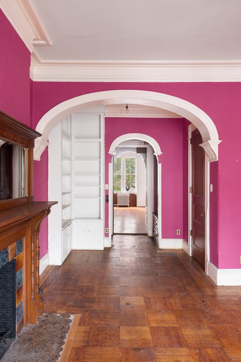 Tall ceilings and a gracious stair hall set the tone. The front and middle parlors are linked by pocket doors and show stained glass, arched openings, and carved mantels, creating flexible space for gatherings or a library. The rear parlor overlooks the garden and suits formal dining or a second sitting room with long, elegant sightlines.