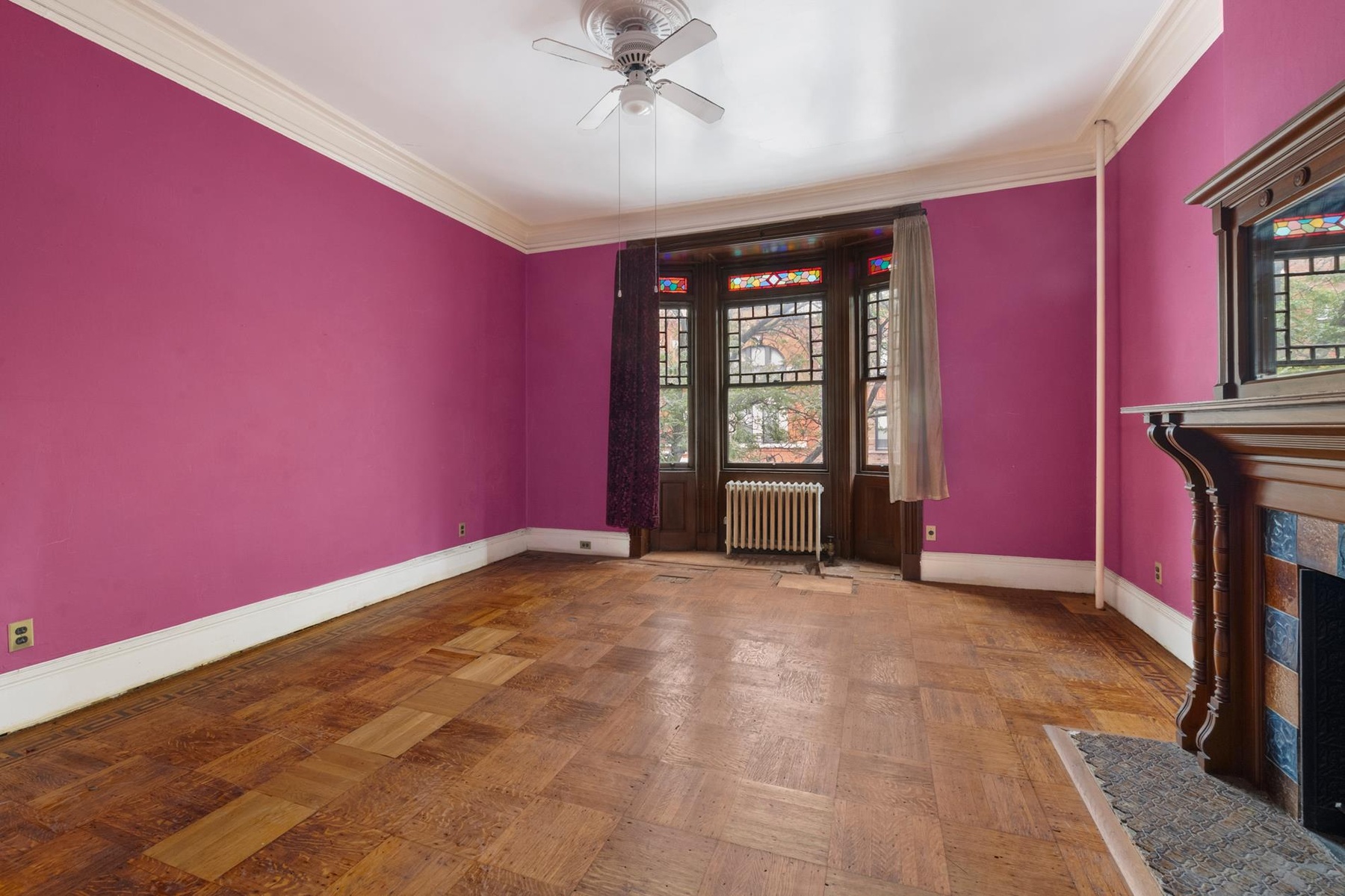 On a quiet, tree-lined block near 105th Street, just off Central Park, this single-family townhouse was built in the 1890s and retains its architectural character. Original wood fireplaces and carved mantels appear in room after room, with stained-glass window detail, arched openings, pocket doors, and parquet floors throughout. East and west exposure brings light across the day, and a skylight brightens the upper stair hall. A deep, leafy backyard with a beautiful mature tree creates a natural bird sanctuary. The house is ideal for a preservation-minded renovation, with the option to modernize in phases while honoring the craftsmanship that makes it special. Neighborhood highlights include Central Park’s North Woods, the Cathedral of St. John the Divine, Columbia University, and easy access to the B, C, and 1 trains.