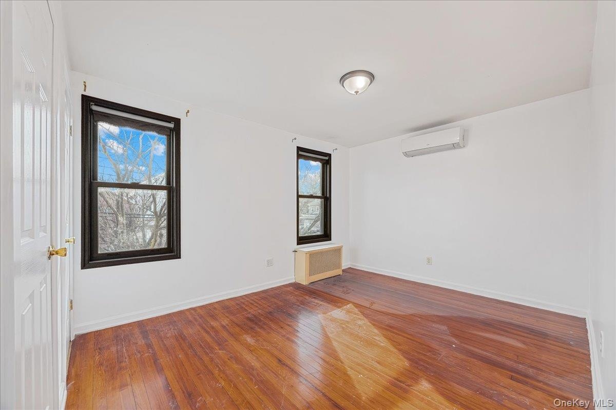 - Unfurnished room featuring hardwood / wood-style floors, radiator, and a wall mounted AC