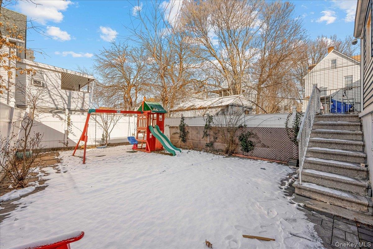 - Yard layered in snow featuring a fenced backyard, a playground, and stairs
