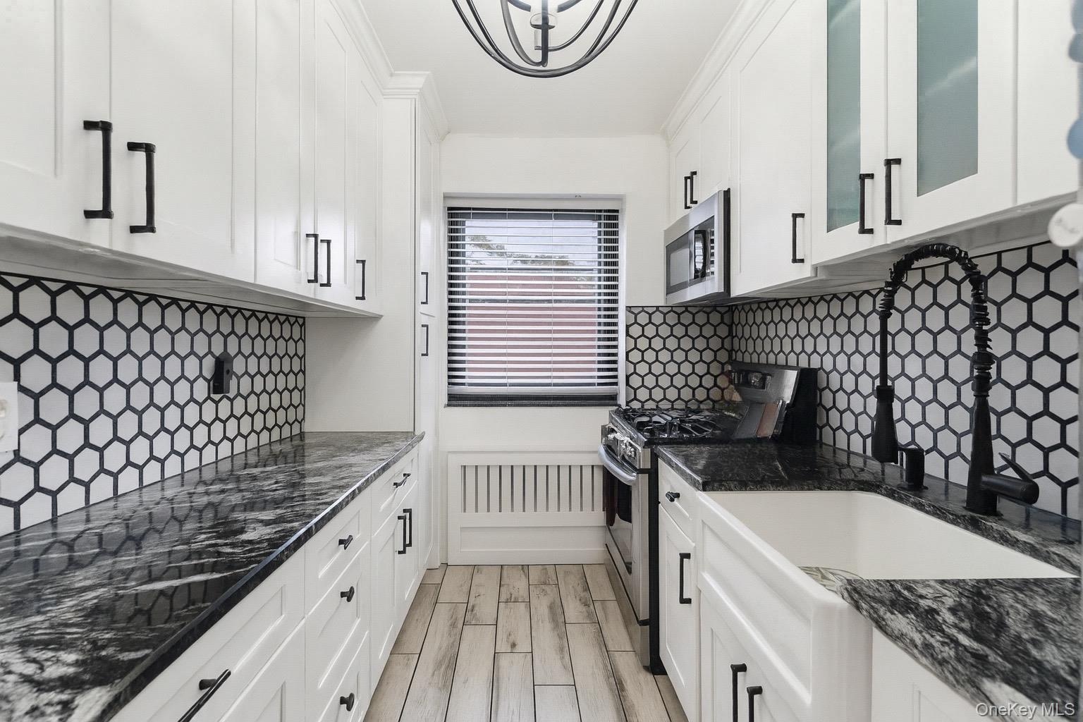 Welcome to this impeccably renovated 3-bedroom, 2-bath garden-style co-op, perfectly situated on the first floor of a beautifully maintained complex in the heart of Howard Beach. This stunning residence combines the comfort of modern living with the charm of a serene garden community—offering both style and convenience. Step inside to a bright, open-concept living and dining area enhanced by brand-new flooring, recessed lighting, and elegant finishes throughout. The custom-designed kitchen features new cabinetry, granite countertops, stainless steel appliances, and a stylish backsplash, creating a warm and inviting space ideal for cooking and entertaining. The primary bedroom suite offers generous space, a walk-in closet, and a beautifully updated private full bath with designer tile and high-end fixtures. Two additional bedrooms are well-sized, perfect for guests, a home office, or a growing family. The second full bathroom is completely redone with sleek finishes and contemporary design, providing both comfort and luxury. This first-floor unit offers easy access and a spacious layout that feels more like a home than an apartment. Every detail has been thoughtfully updated—from doors and trim to lighting and flooring—making this co-op truly move-in ready. The building and grounds are meticulously maintained, offering lush greenery, peaceful surroundings, and a true sense of community. There is a waiting list for parking, and ample street parking is available nearby. Conveniently located near schools, shopping centers, restaurants, and public transportation, this property delivers the best of Howard Beach living—quiet suburban comfort with easy access to city amenities. This is an extraordinary opportunity to own a completely redone, first-floor 3-bedroom, 2-bath garden co-op. Just unpack and move right in.