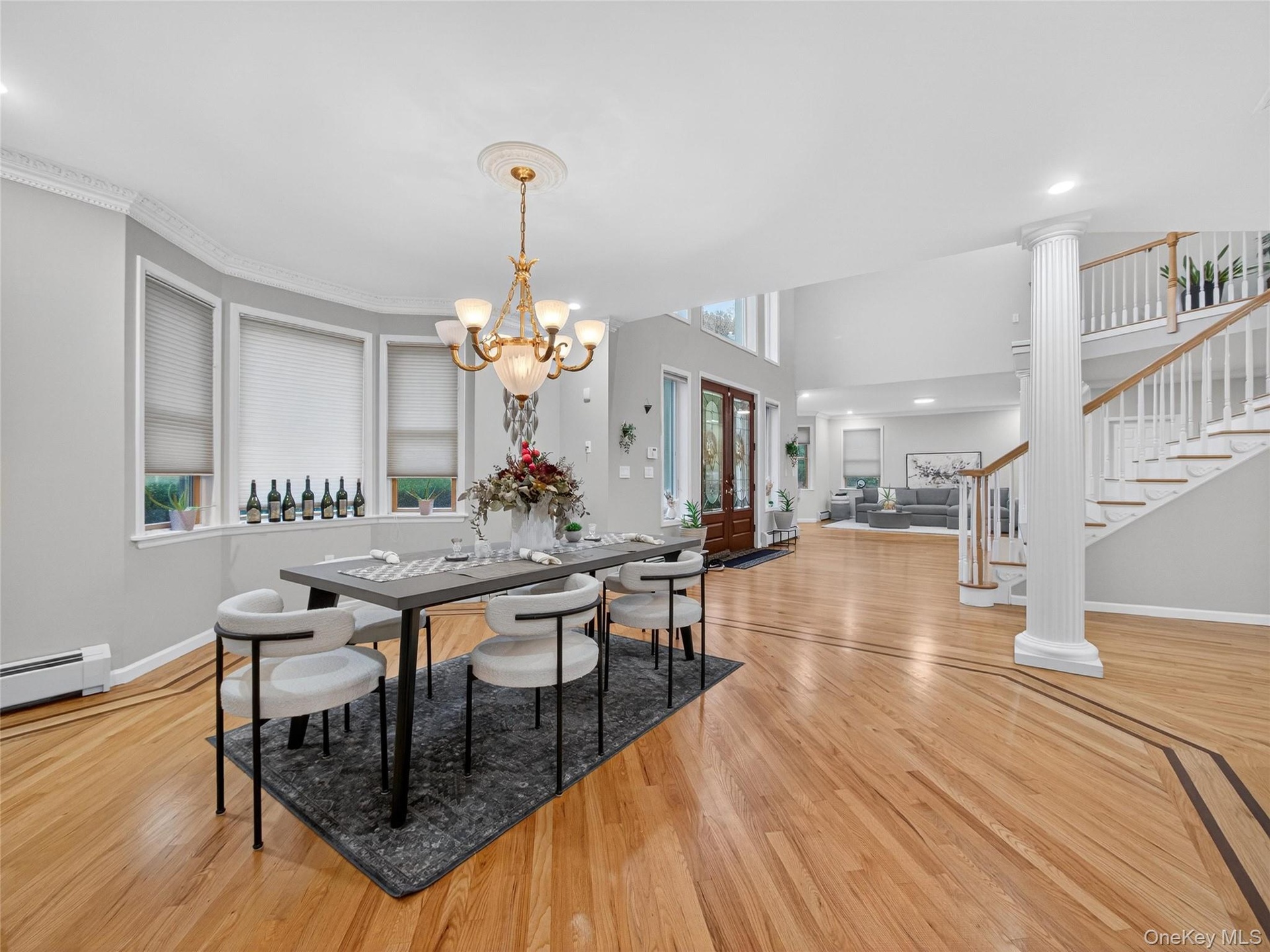 Welcome to 15 Beaver Pond Court in Stony Point — a stately ~5,000 sq ft Colonial set at the end of a private cul-de-sac with serene Hudson Valley mountain views. A grand two-story foyer with decorative columns, crown moldings, and hardwood floors introduces a light-filled plan designed for both everyday comfort and elegant entertaining. Formal living and dining rooms showcase refined millwork and elegant lighting, while the sun-splashed family room impresses with soaring ceilings and a striking stone fireplace framed by expansive windows.