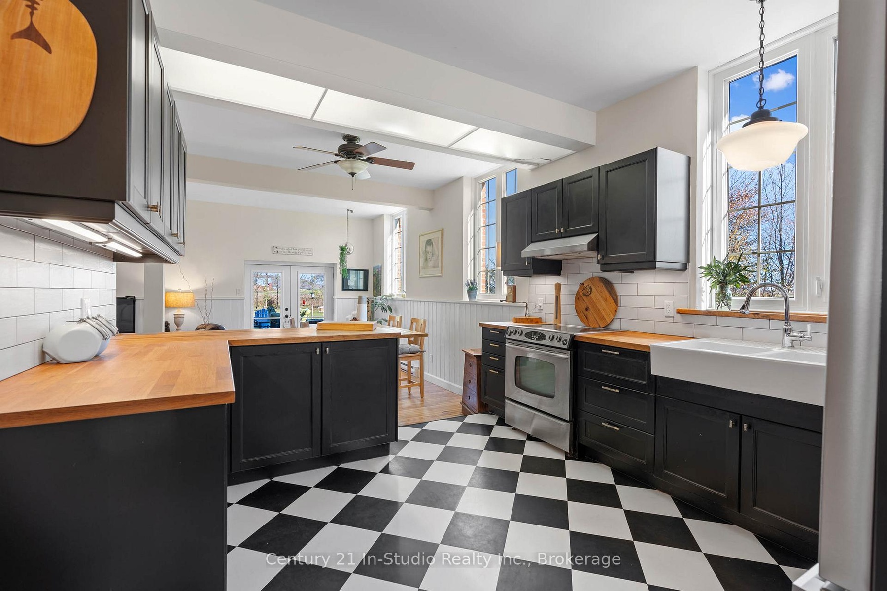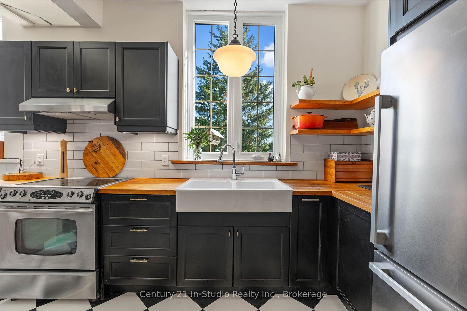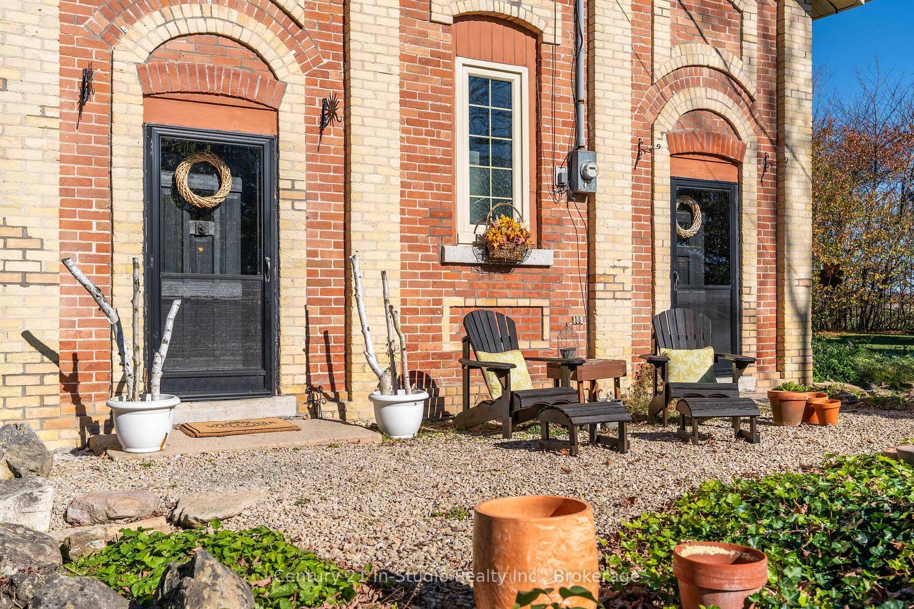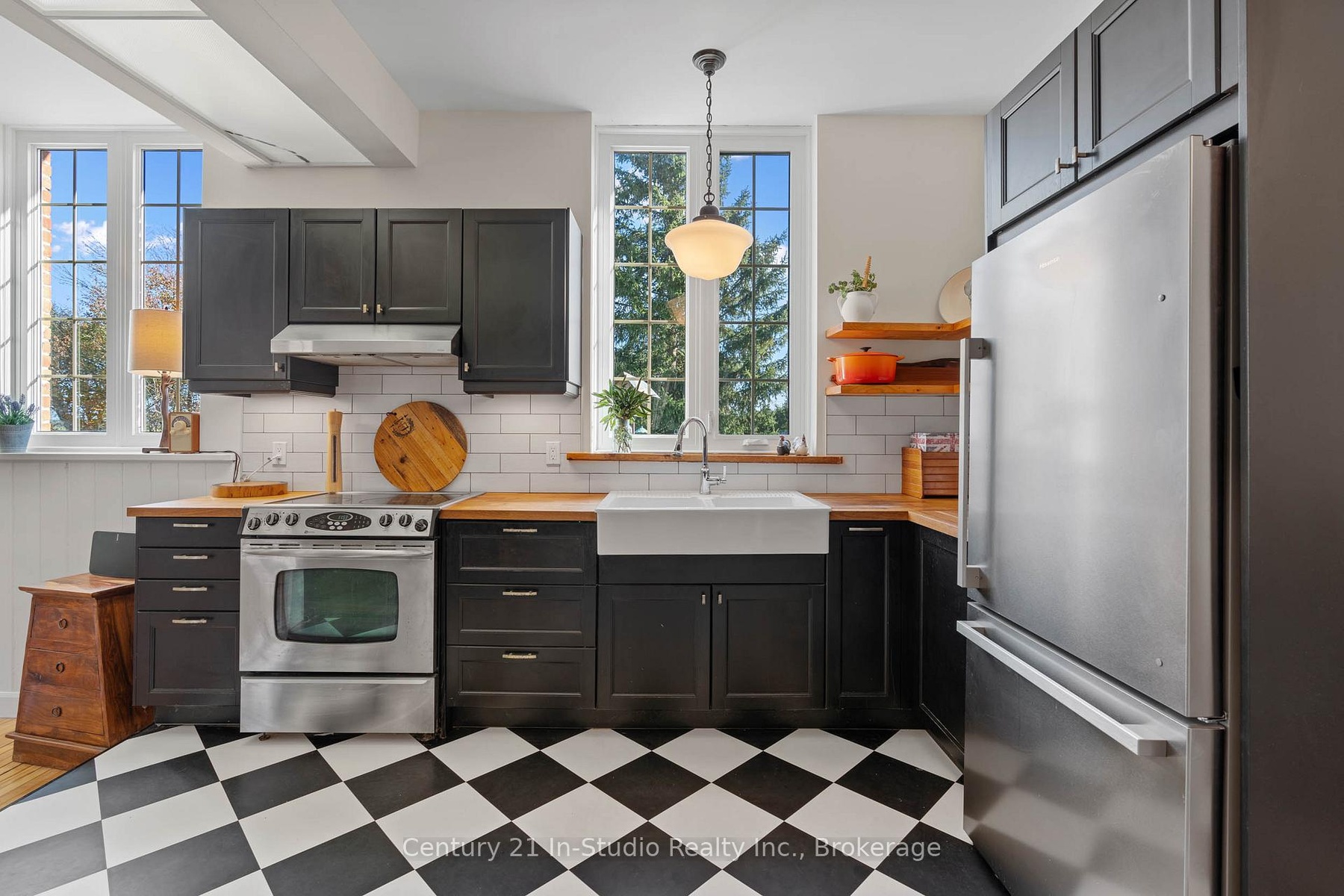 If you've ever dreamed of owning a piece of history, the Kemble Schoolhouse offers just that-rich in character, charm, and timeless appeal. Once the heart of the community where generations of children began their stories, this historic brick schoolhouse has been beautifully restored into a warm, inviting family home. Set on a full acre with sweeping pastoral views that feel straight out of the English countryside, this property blends heritage beauty with modern comfort. Inside, you'll find soaring ceilings, large windows that fill every room with natural light, and a layout that flows effortlessly. The living room features a cozy propane fireplace and original hardwood floors that carry through to the formal dining area and farmhouse-inspired kitchen, complete with butcher block countertops, wood shelving, and a deep apron sink. A half bath and full laundry room complete the main floor. Upstairs, there are four bright bedrooms, each with skylights that create a light and airy feel. A spacious four-piece bath and a lovely landing with a sitting area add thoughtful touches. The primary bedroom offers wainscoting detail and a private balcony overlooking the property and Kemble Rock beyond. Outdoors, enjoy peaceful country living with room to roam, garden, and gather. There's a rustic workshop, original chicken coop in great condition, fruit trees, and a large patio perfect for entertaining or simply soaking in the fresh air. Every corner of this property tells a story-past and present-making it truly one of a kind. Adjoining Lot also available for purchase