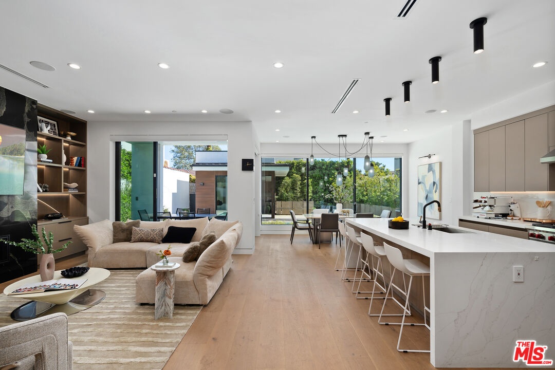 Welcome to this fully gated, stunning modern masterpiece located in one of Los Angeles' most vibrant neighborhoods. Surrounded by lush, mature landscaping, this five-bedroom, five-and-a-half-bathroom home seamlessly blends contemporary elegance with ultimate comfort. Designed for both luxury and functionality, each of the 5 spacious bedrooms in the main house features its own private ensuite bathroom, ensuring privacy and convenience. The primary suite is a true retreat with a private balcony overlooking the pool and spa, offering a peaceful escape. The spa-inspired primary bathroom boasts elegant finishes, a soaking tub, and a spacious layout, creating a serene space to unwind. At the heart of the home, the gourmet kitchen is a chef's dream, featuring high-end appliances, sleek quartz countertops, ample storage, and a seamless flow into the dining and living areas. Designed for effortless entertaining, the open floor plan is complemented by an integrated sound system, perfect for both intimate gatherings and lively get-togethers. Step outside to a private backyard oasis, where a sparkling pool and spa create a resort-style ambiance. The covered patio with an outdoor sound system, built-in BBQ, and lush greenery make this space ideal for hosting summer soires or relaxing under the California sun. A charming detached 418sqft pool house, complete with a bathroom and kitchenette, adds extra convenience and flexibility. This home offers unparalleled access to trendy coffee shops, top-rated restaurants, comedy clubs, art galleries, and moreall just steps away. AT&T Fiber internet available! Planters in the back of the house have been removed to include 2 car parking, and new 220V EV charging port capabilities.