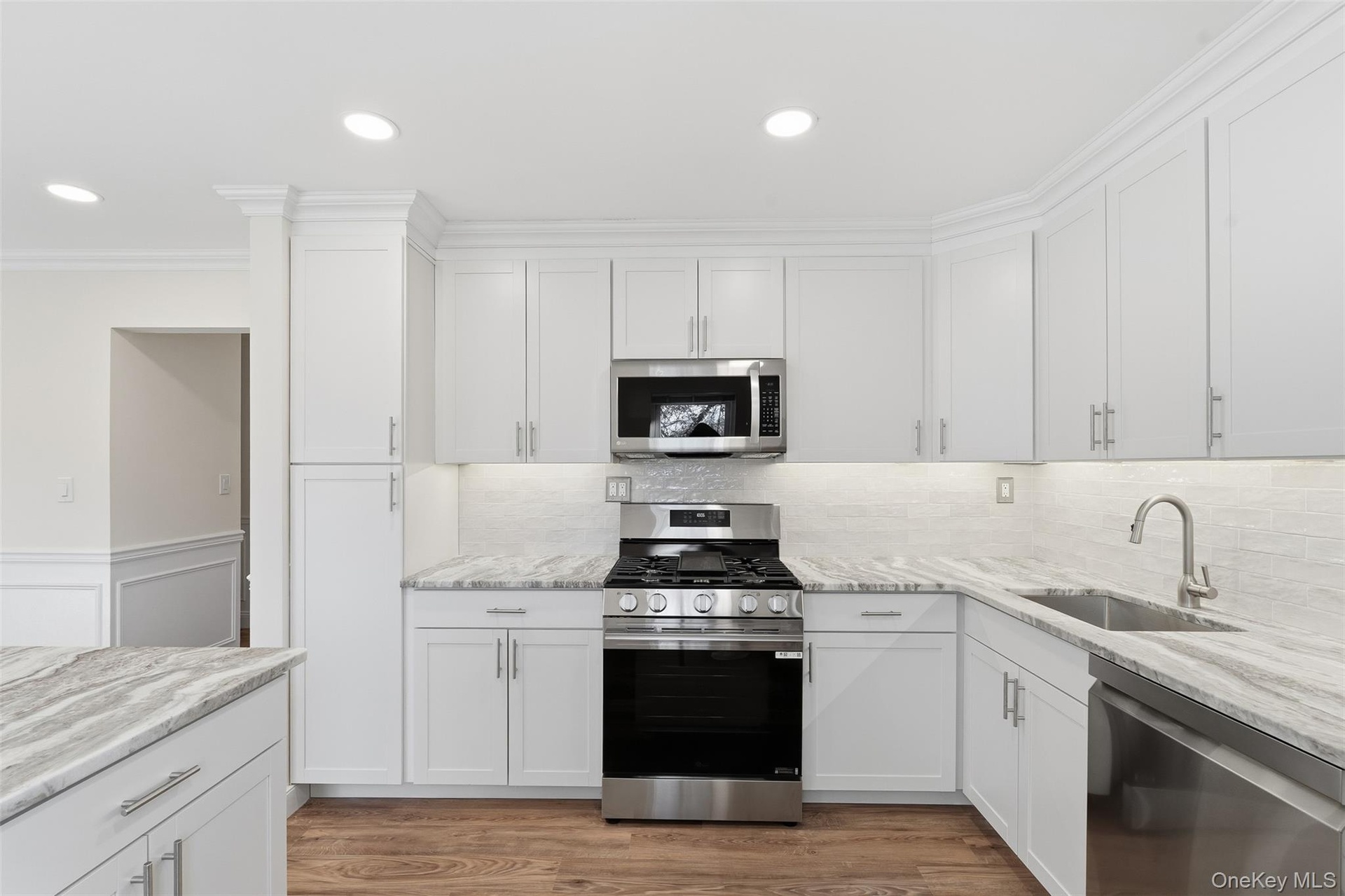 Be wowed by the light-filled, open layout with chic crown moldings, that makes every day feel fresh and new. The show-stopping, eat-in kitchen is a chef’s delight, boasting gleaming white cabinets, dazzling granite counters, brand new sparkling stainless steel appliances, including a dishwasher, microwave, oven, and a big French door fridge with freezer underneath and ice maker, plus under-cabinet lighting that makes everything shine!