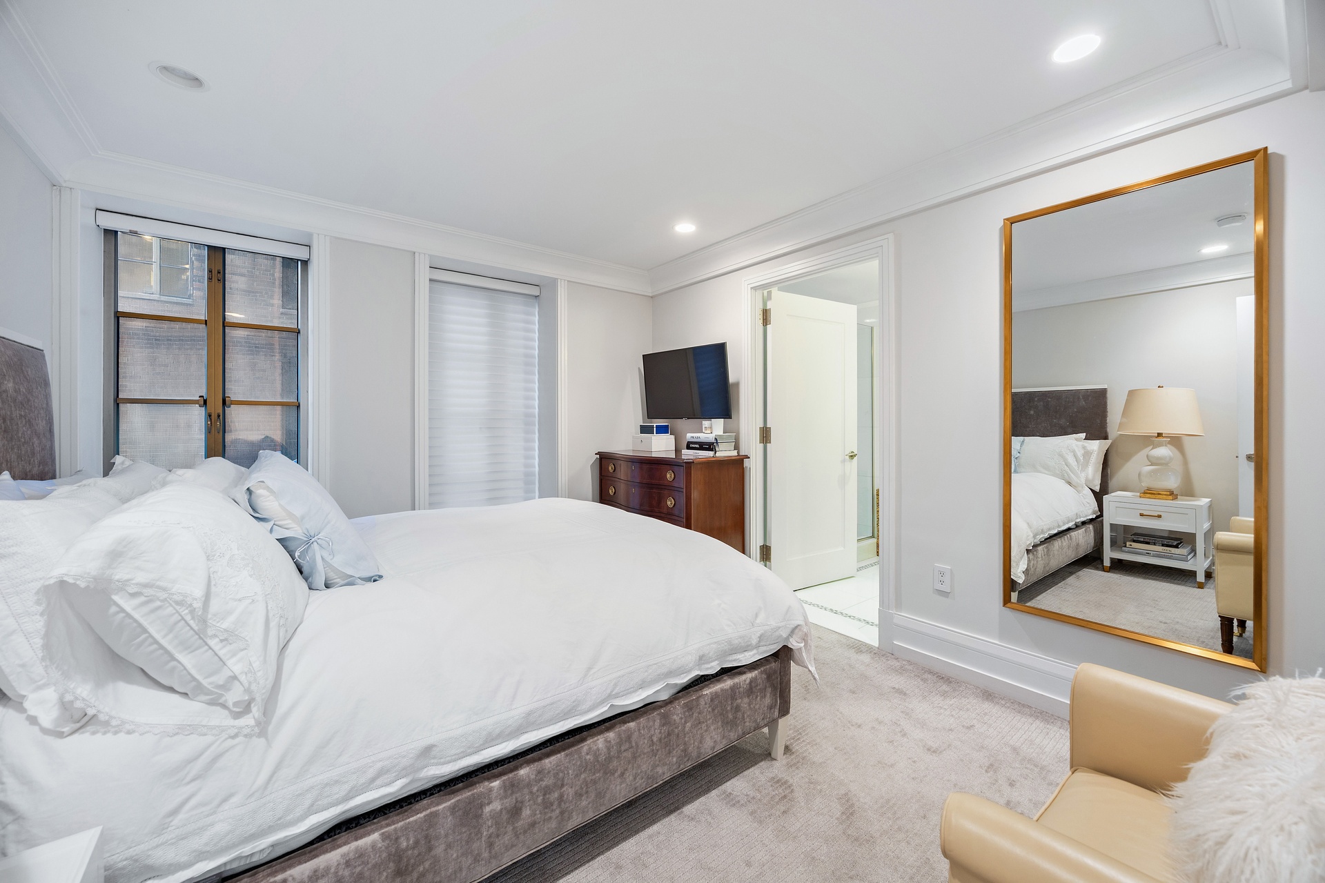 Stepping inside, a welcoming foyer and gallery introduce the home with a sense of timeless elegance, complemented by a mirrored powder room featuring a Waterworks marble pedestal sink. The corner living room is graced with six-foot French casement windows that bathe the space in natural light and frame peaceful views of lush private gardens and classic townhouses. Designed for both comfort and sophistication, the layout offers an effortless transition toward the home’s formal dining and entertaining areas.