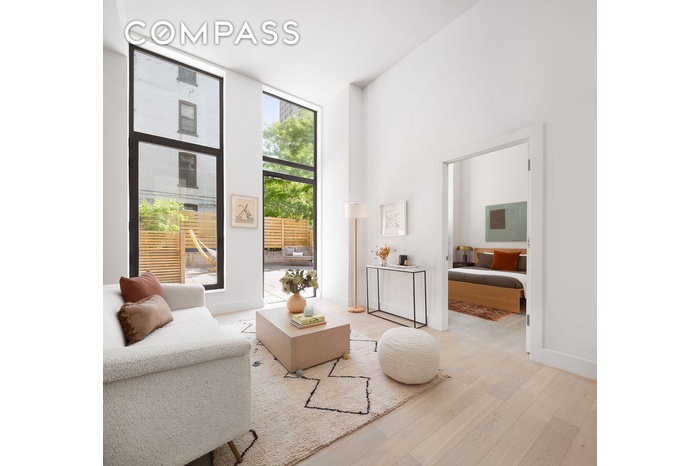 This sunlit one-bedroom, one-bathroom home features soaring 13.5-foot ceilings, floor-to-ceiling windows, and nearly 895 square feet of private outdoor space spread across two gardens.