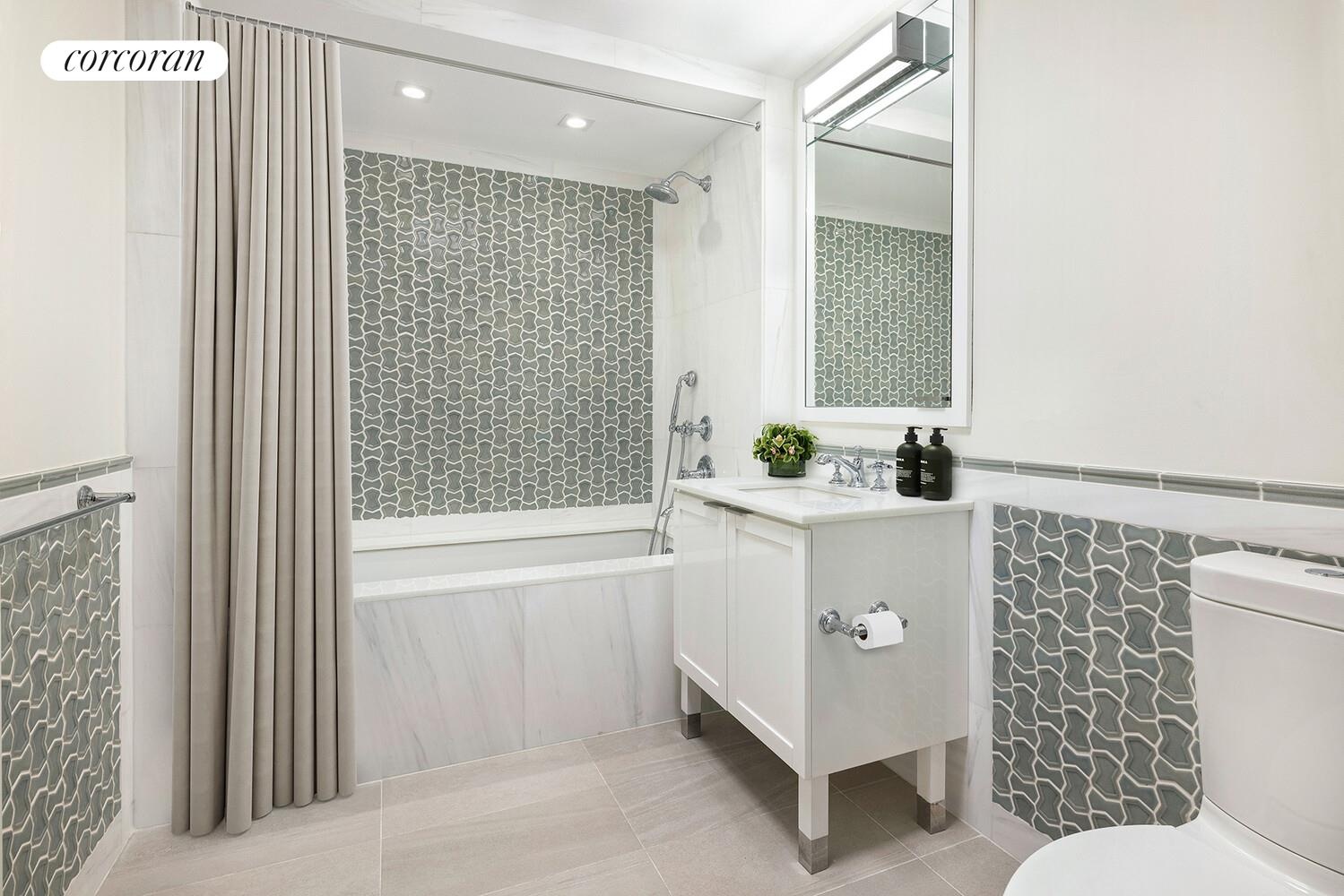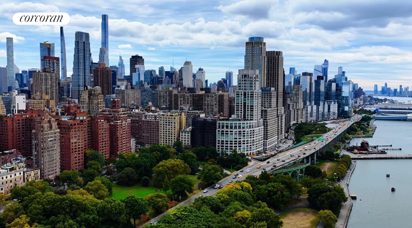 Upon entry, you're greeted by a grand foyer leading to a sprawling great room bathed in natural light from Riverside Park-facing exposures. The open, gourmet kitchen is a chef's dream, boasting custom high-gloss lacquer cabinetry, Cambridge mesh accents, and elegant pearl gray quartzite countertops and backsplash. Top-of-the-line appliances include a Wolf gas range stove, Gaggeneau refrigerator, and Miele dishwasher, speed oven, and a wine refrigerator.