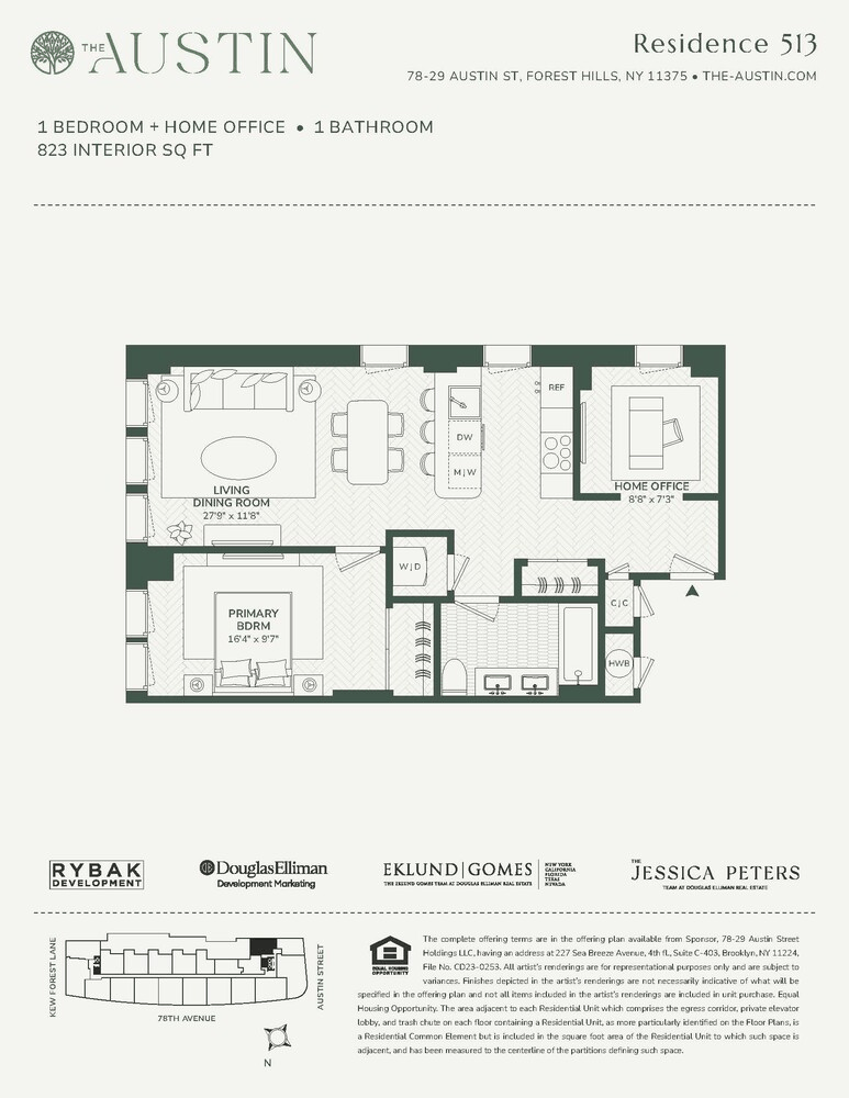 The complete offering terms are in the offering plan available from Sponsor, 78-29 Austin Street Holdings LLC, having an address at 227 Sea Breeze Avenue, 4th fl., Suite C-403, Brooklyn, NY 11224, File No. CD23-0253. All artist's renderings are for representational purposes only and are subject to variances. Finishes depicted in the artist's renderings are not necessarily indicative of what will be specified in the offering plan and not all items included in the artist's renderings are included in unit purchase. Equal Housing Opportunity.
