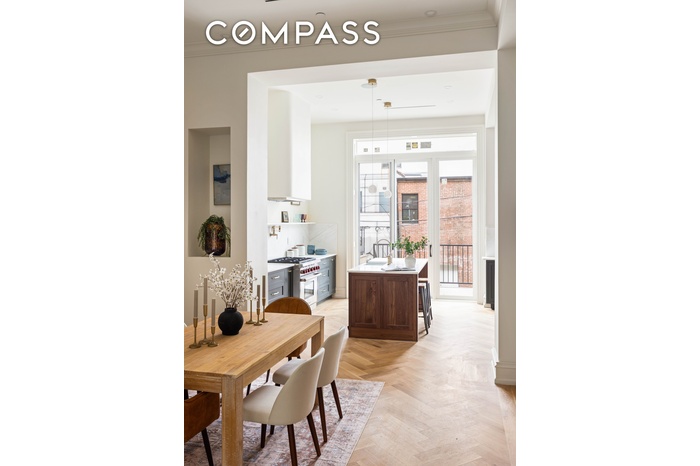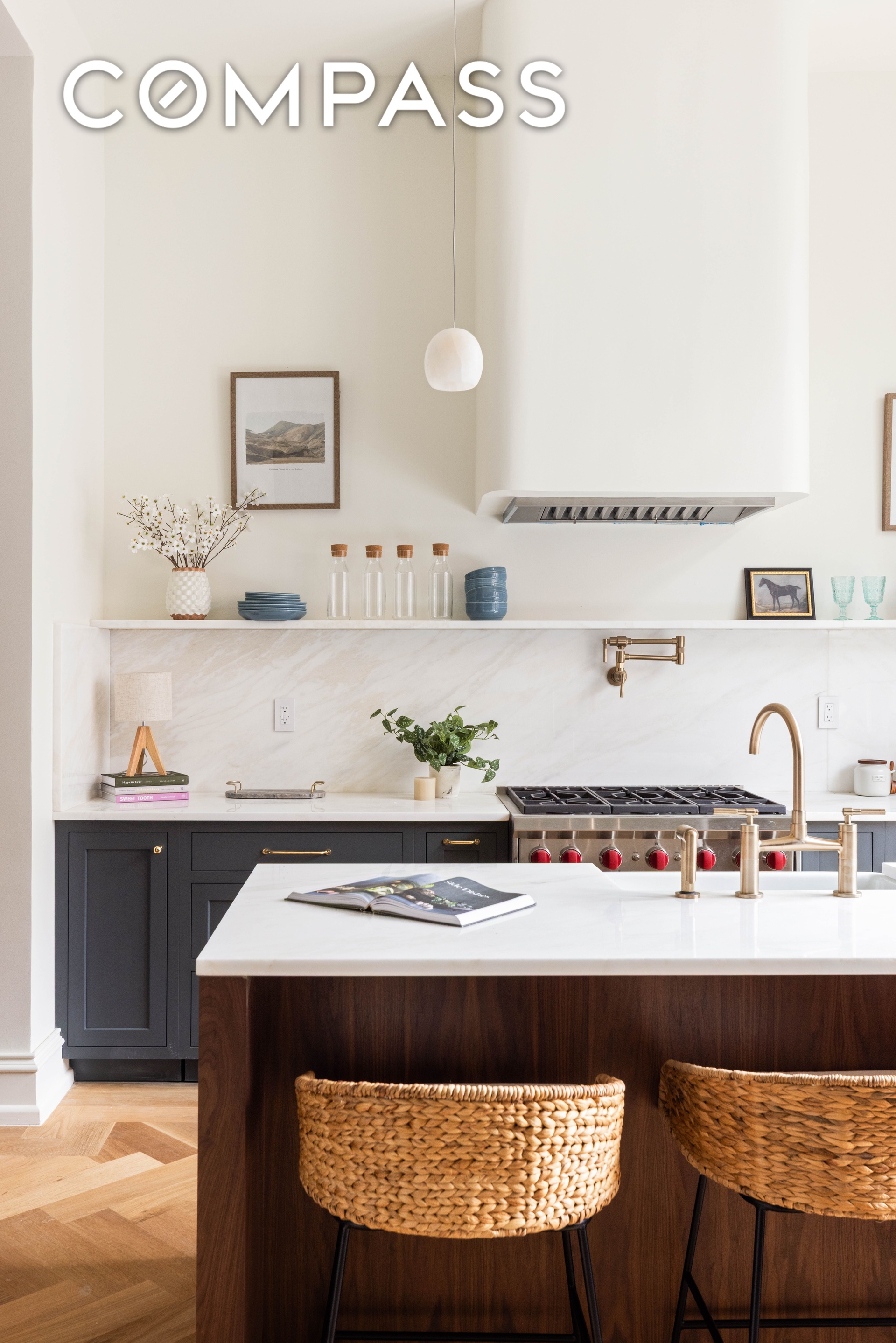 Upon entering the parlor level, you are immediately greeted by 11'6" soaring ceilings, striking moldings, and exquisite White Oak herringbone flooring. Anchoring the formal living room is a stately marble mantel wood-burning fireplace, creating an elegant focal point for the sun-drenched space. The parlor flows seamlessly into the rear kitchen — a true chef’s haven outfitted with custom inset cabinetry, an integrated Subzero refrigerator, Bosch dishwasher, Sharp microwave drawer, six-burner Wolf range, and a Summit wine refrigerator. Oversized windows bathe the kitchen in natural light and offer direct access to a full-width deck overlooking the manicured garden.