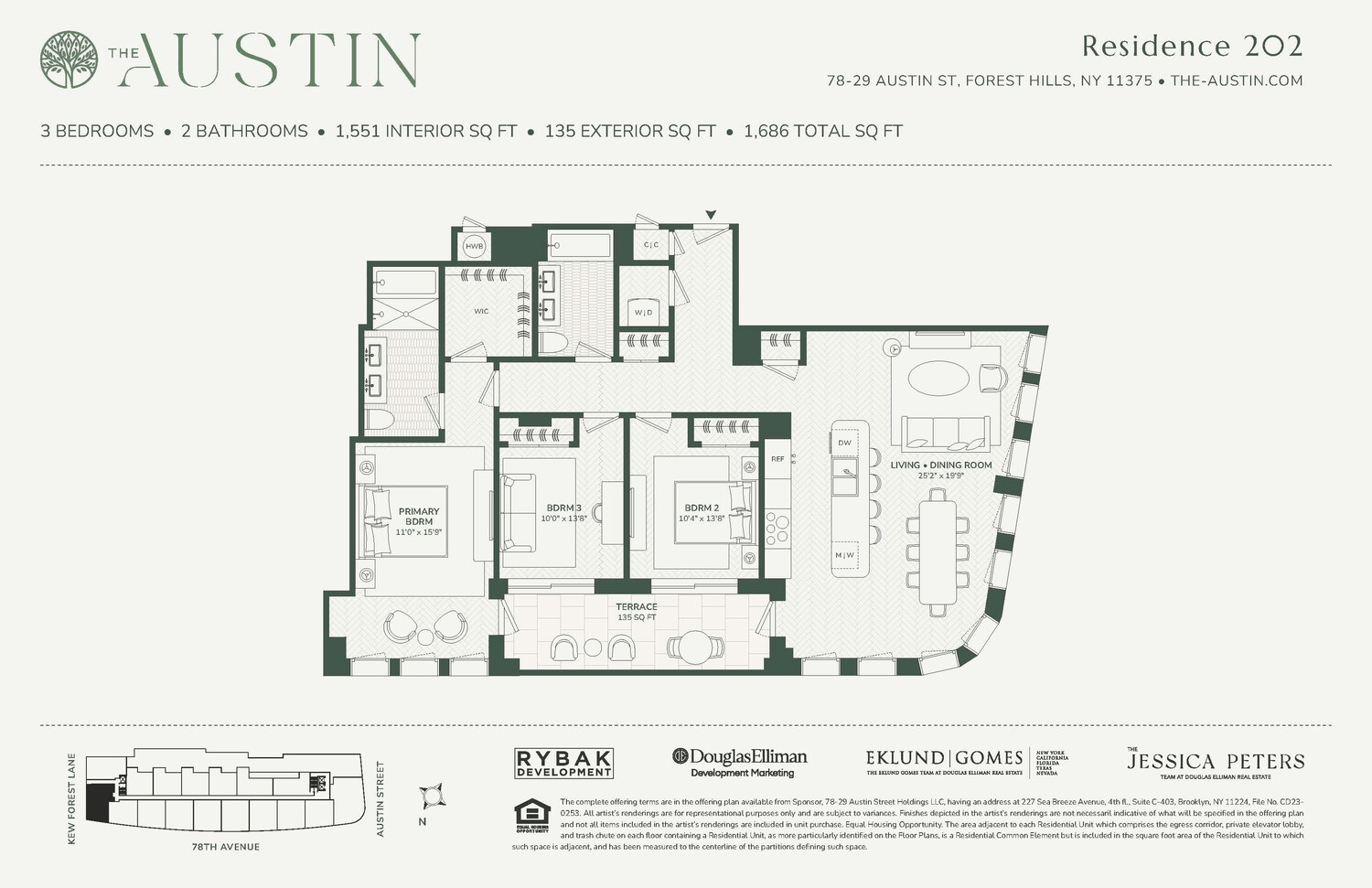 The complete offering terms are in the offering plan available from Sponsor, 78-29 Austin Street Holdings LLC, having an address at 227 Sea Breeze Avenue, 4th fl., Suite C-403, Brooklyn, NY 11224, File No. CD23-0253. All artist's renderings are for representational purposes only and are subject to variances. Finishes depicted in the artist's renderings are not necessarily indicative of what will be specified in the offering plan and not all items included in the artist's renderings are included in unit purchase. Equal Housing Opportunity.