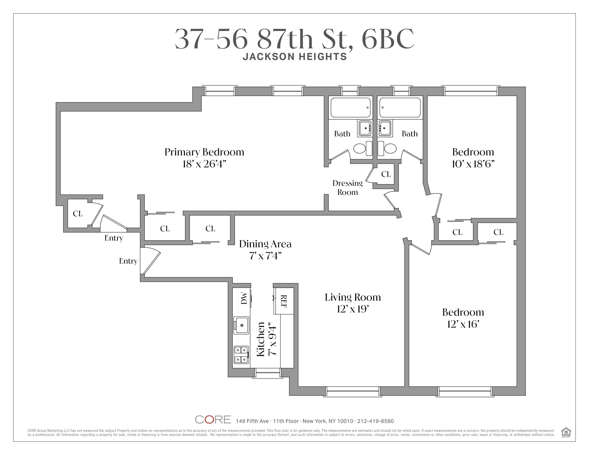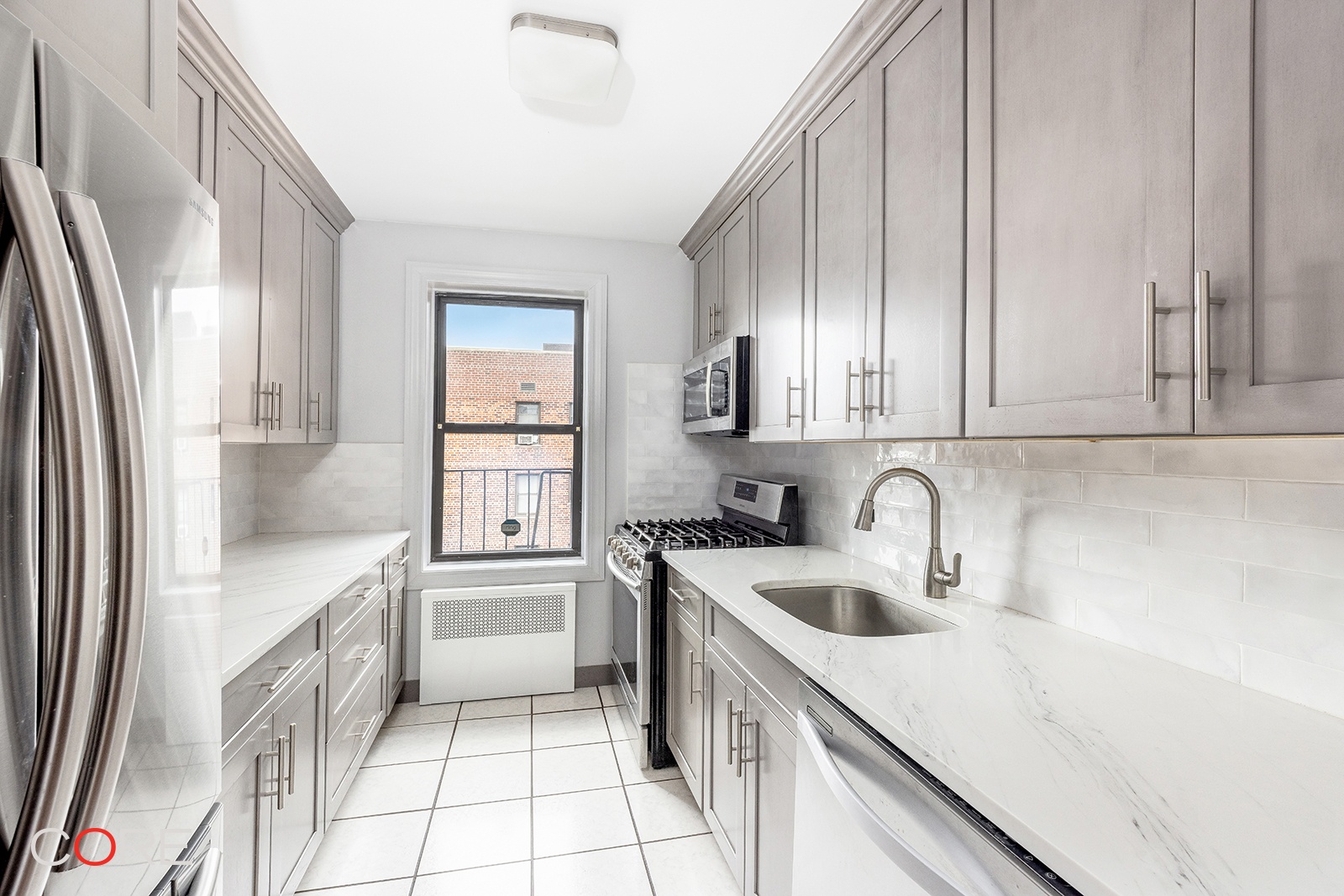 Enter through a gracious foyer, which leads to the living room with a dining alcove and an adjacent double-galley kitchen. Newly renovated, the kitchen offers custom shaker cabinets, stone counters, tile backsplash, and a full line of quality stainless steel appliances, complete with a dishwasher.