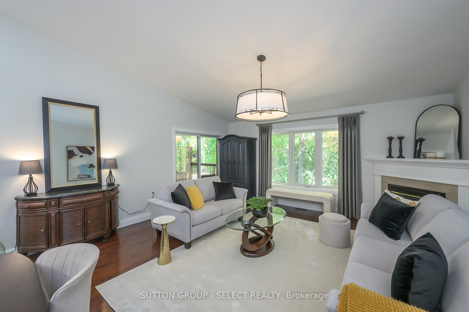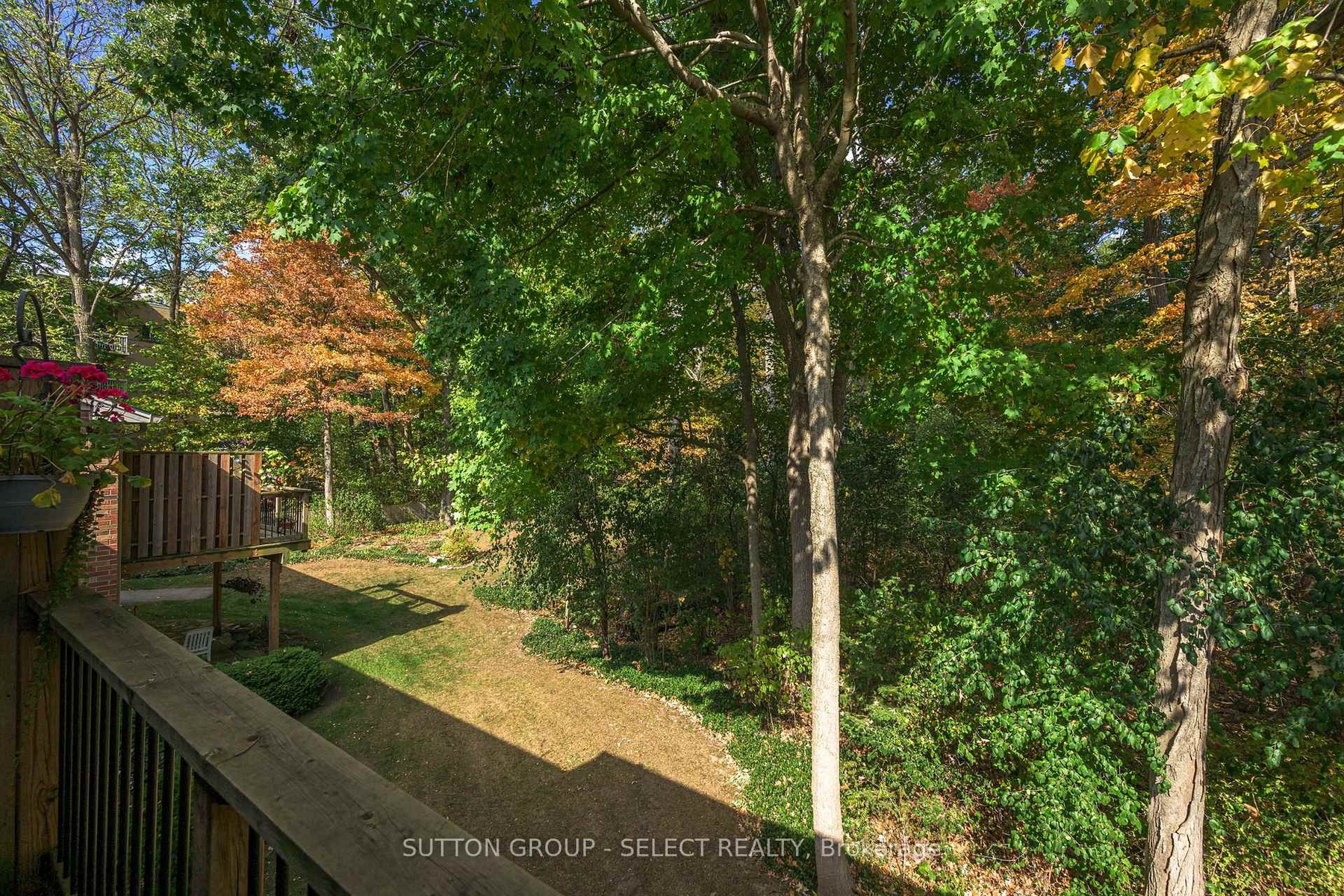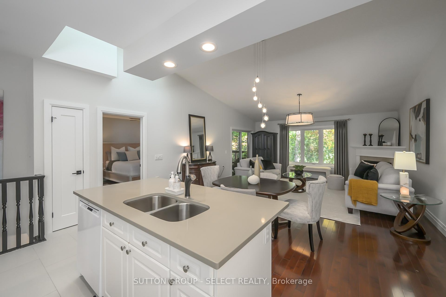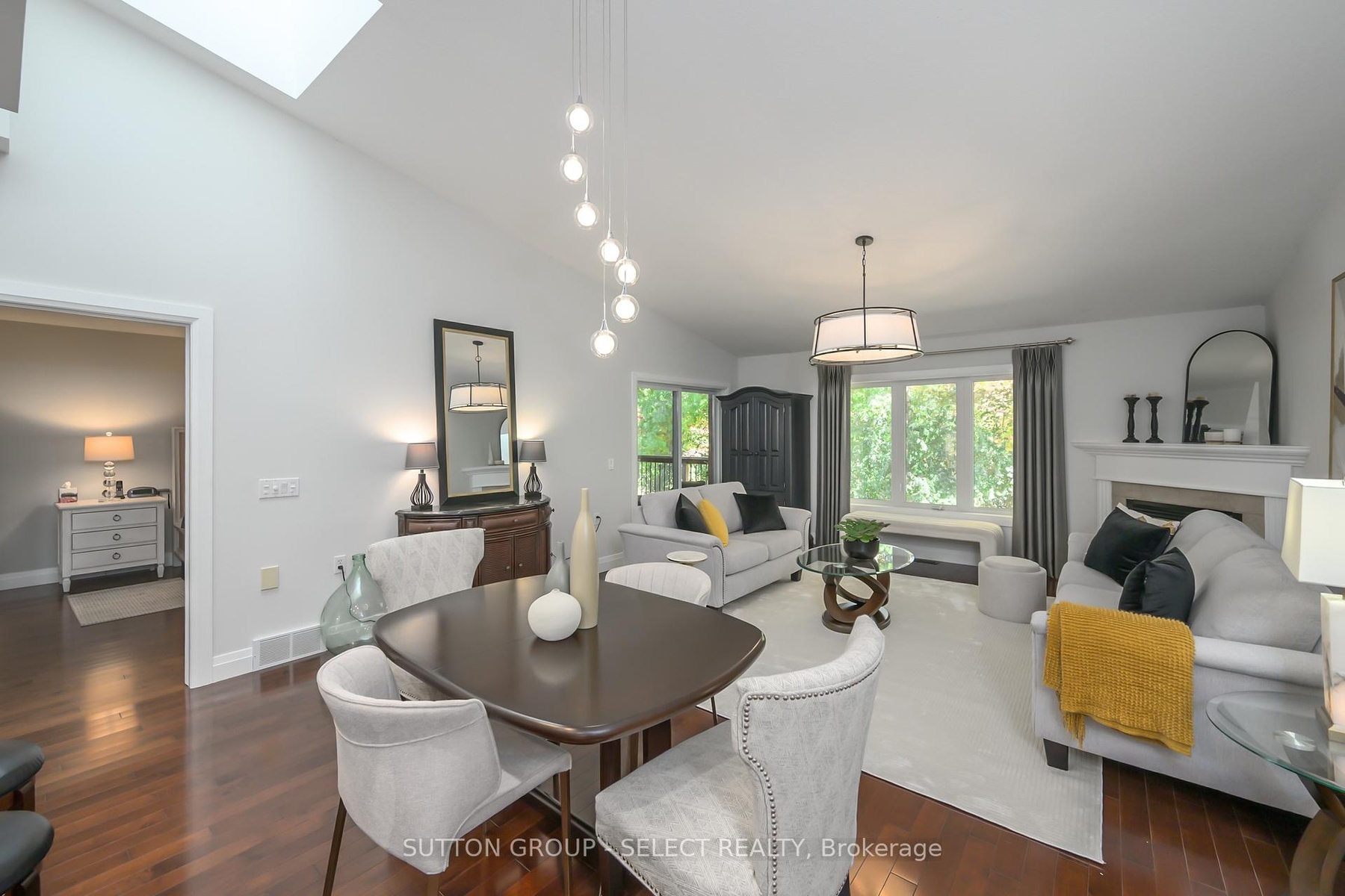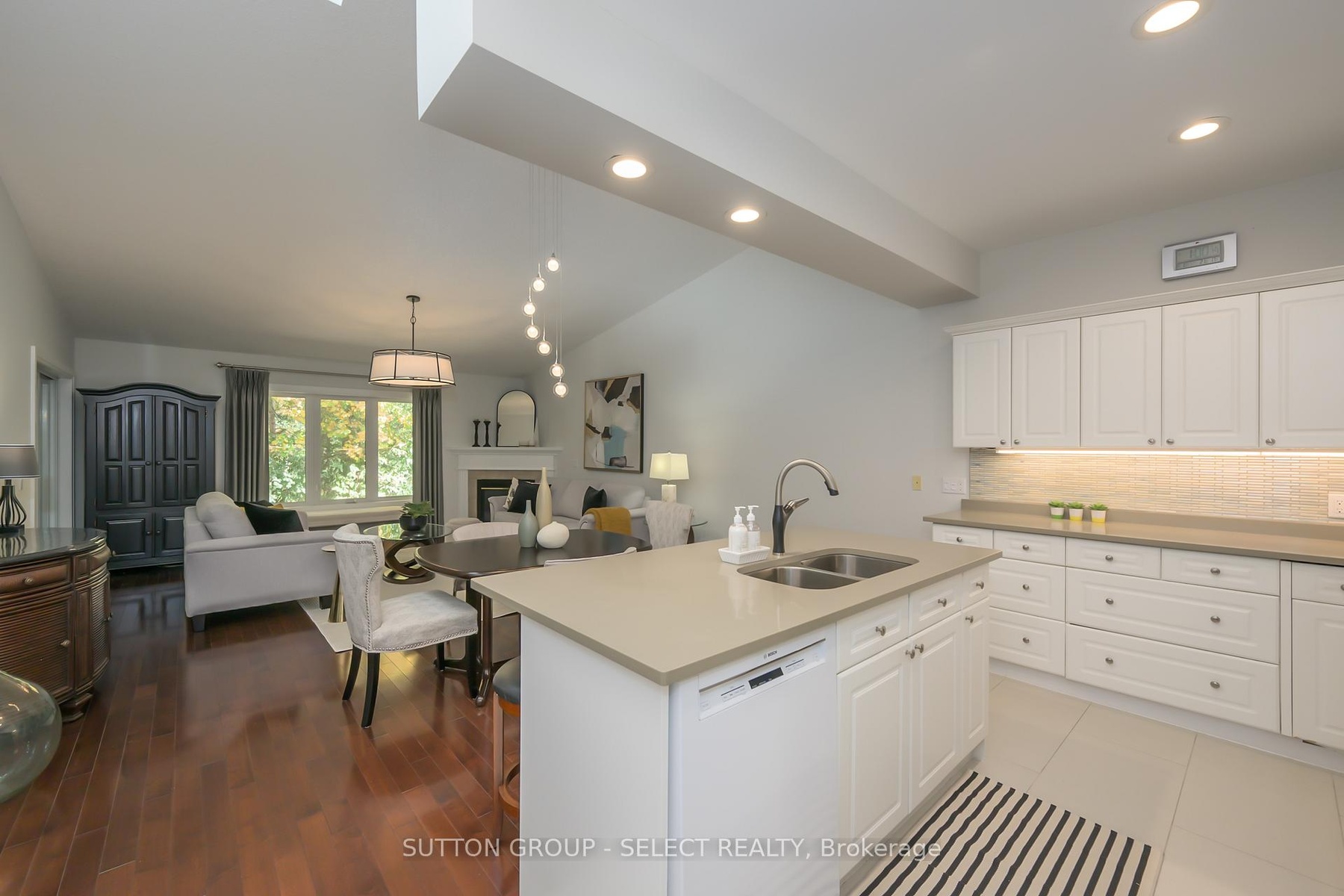 Tucked quietly at the. back of the coveted Byron Woods enclave, this forest-backed bungalow feels like a secret escape in the heart of the village. Morning light filters through the trees, birds chatter in the canopy, and the only other sound you'll hear from the covered deck is the breeze moving through the leaves. It's hard to believe you're just a short walk to Byron's shops, cafés, and the trails of Springbank Park along the Thames River. Inside, over $120,000 in thoughtful upgrades have transformed the space with timeless style including upgraded interior doors, baseboards and casings, hardwood and tile floors, updated lighting, and three beautifully renewed bathrooms. The kitchen shines with quartz counters, an iridescent porcelain mosaic backsplash, stainless appliances, and a skylight that floods the space with sunshine. The open-concept living and dining area centers around a romantic gas fireplace and lush forest views, creating a sense of calm that continues throughout the home. The main level offers a tranquil primary bedroom with walkout access to the deck, a beautifully renovated ensuite with walk-in shower, a versatile second bedroom or office, a second renovated full bath, and convenient main-floor laundry. Downstairs, the walkout lower level feels equally inviting with large windows, a family room wrapped in custom built-ins, an integrated projector and screen for movie nights, a bright guest bedroom, an updated 3-piece bath with tile walk-in shower, and plenty of storage. Step outside to your private patio and enjoy the dappled light of the woods. With an attached garage and carefree condo living, this rare forest-side home offers the best of Byron, steps from Springbank Park, minutes to Boler Mountain, Riverbend Golf, and the London Hunt & Country Club. A lifestyle as peaceful as it is connected.