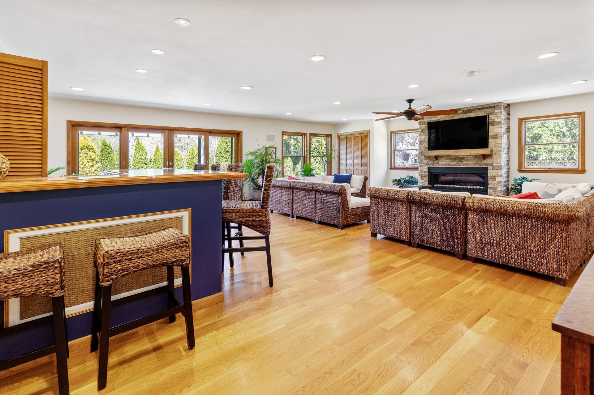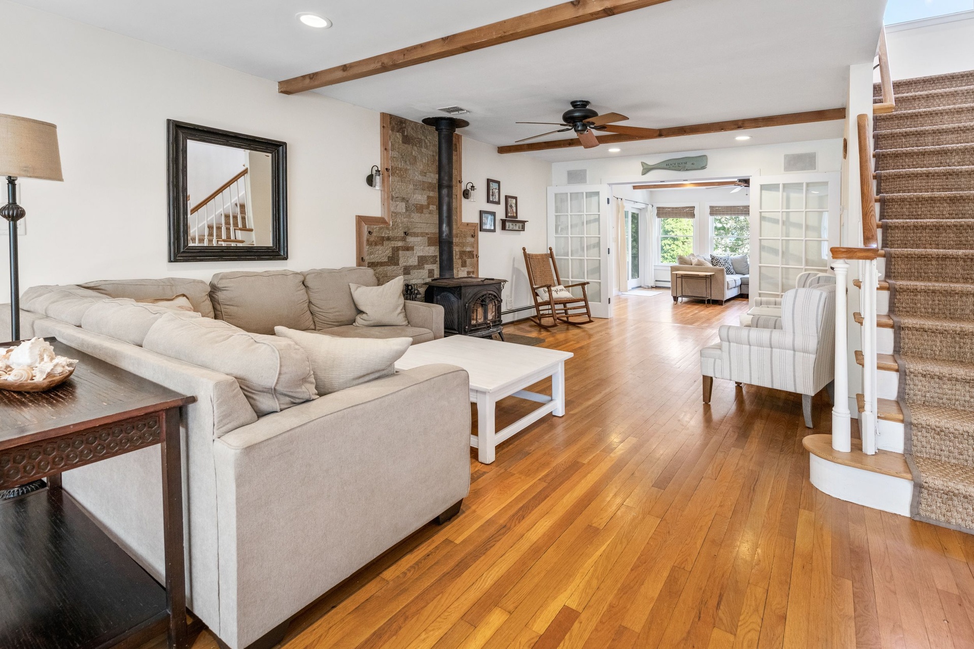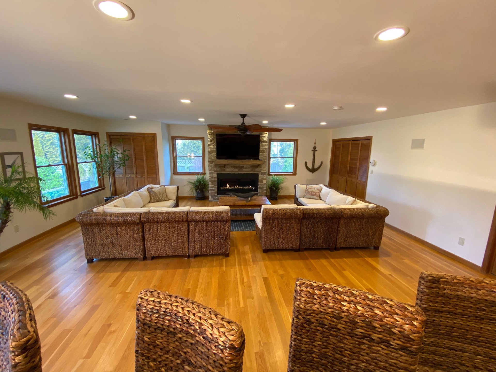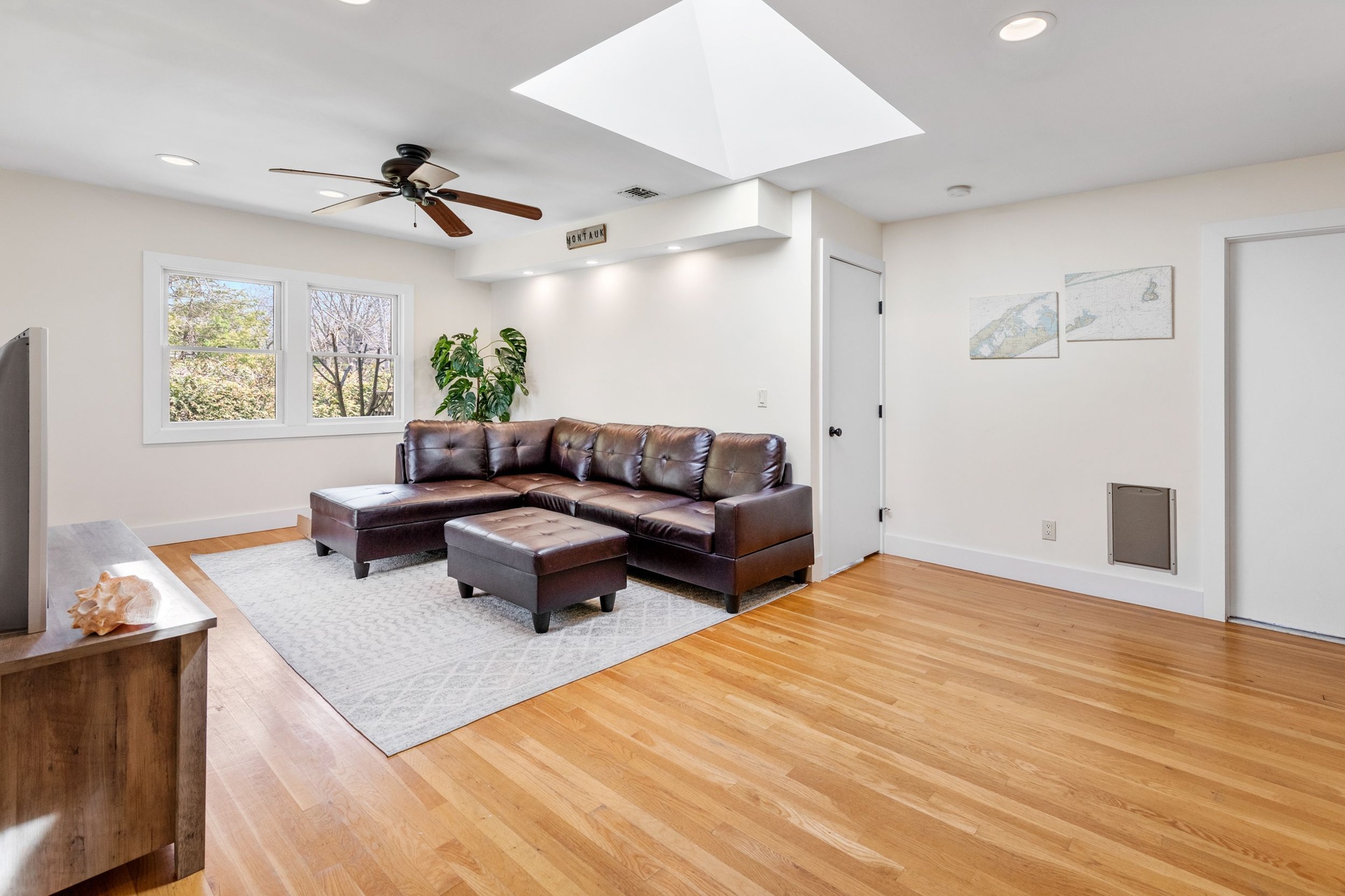 Rental Registration #24-314 Welcome to this Prefect East Hampton get away! Beyond four bedrooms there is 1 office, 1 study, 1 sitting room with wood burning stove, 1 entertainment room, 1 oversized media room with full sized bar, 1 piano room/playroom and 1 mud room. This house has it all! There is tiled foyer with custom compass mosaic as you enter the house. It is a 2 story house with hardwood oak flooring, central AC throughout, radiant heating with a high efficiency natural gas boiler 4 heat AC zones. It also has 60 gallon hot water Superstore tank and a 200 Amp electrical service updated 2006. There is Town water supply and Town natural gas supply.