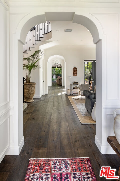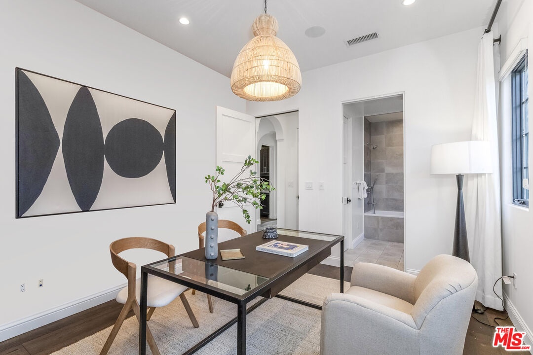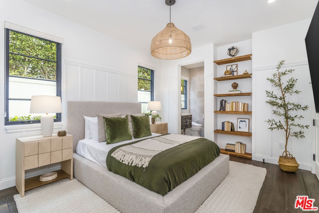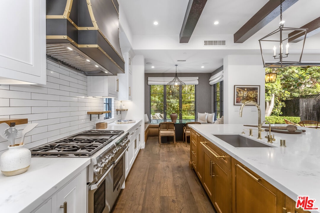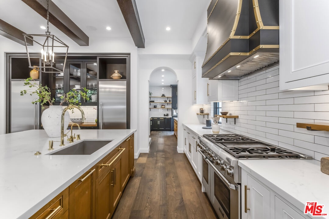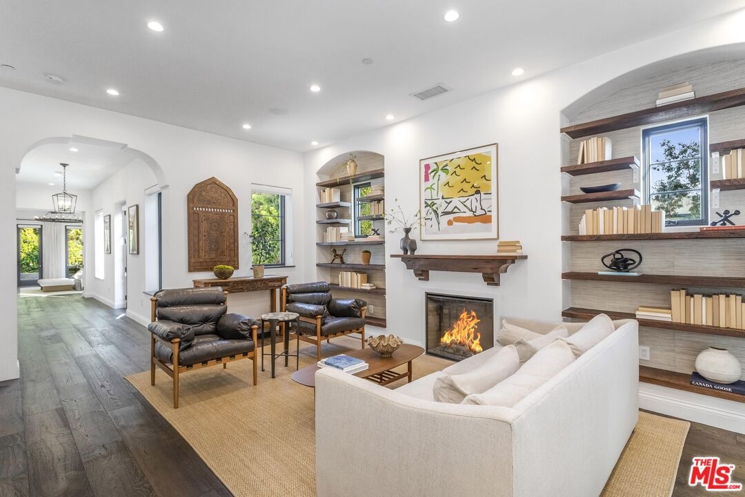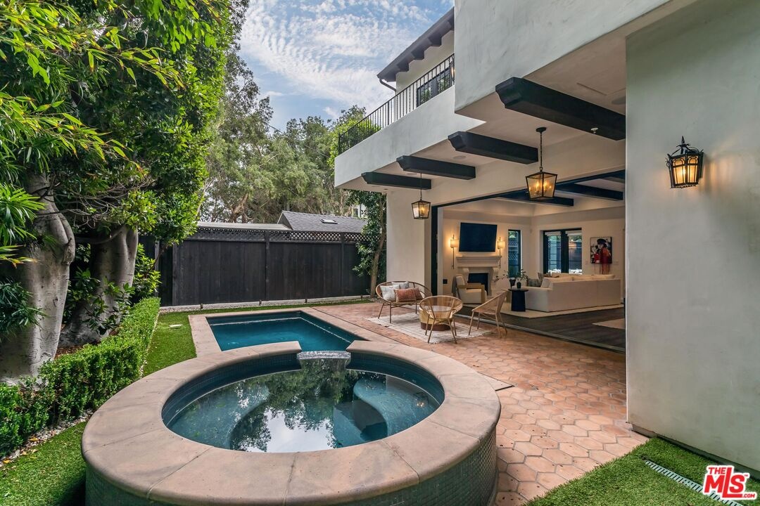 This resort-quality Spanish Revival home is a rare opportunity, blending timeless elegance with modern livability. Fully gated and exceptionally private, the residence is framed by mature palms, lush landscaping, and multiple courtyards, patios, and terraces that create the quintessential California indoor-outdoor lifestyle. Inside, the architecture exudes character with graceful archways, wood-beamed ceilings, and charming wrought iron and tile finishes. The layout is designed for intimate gatherings yet equally suited to large-scale entertaining, with the living, dining, and family rooms wrapping around a tiled interior courtyard with fire pit. Outdoors, a sliding wall of Fleetwood doors connects the home to a private pool, spa, and BBQ area, all surrounded by mature trees and landscaping. The chef's kitchen and primary bath are showcases of custom quality and understated elegance, while a large butler's pantry provides added convenience. Every upstairs bedroom opens to its own terrace, and the thoughtful design continues with a 500 sq. ft. roof deck featuring a built-in wet bar and sweeping 360-degree views of all of Los Angeles. There is simply nothing else on the market with this level of detail, design, and sophistication, while central to the best of West Hollywood and Beverly Hills.