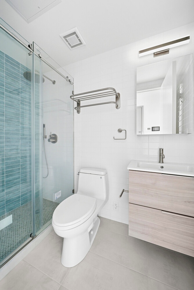 The spacious living area extends onto a private terrace, creating an ideal setting for morning coffee or evening gatherings, with open views toward Barclays Center and Atlantic Terminal. The bedroom comfortably accommodates a queen-sized bed and offers generous closet space, while the stylishly renovated bathroom showcases modern tilework and a clean, minimalist design.