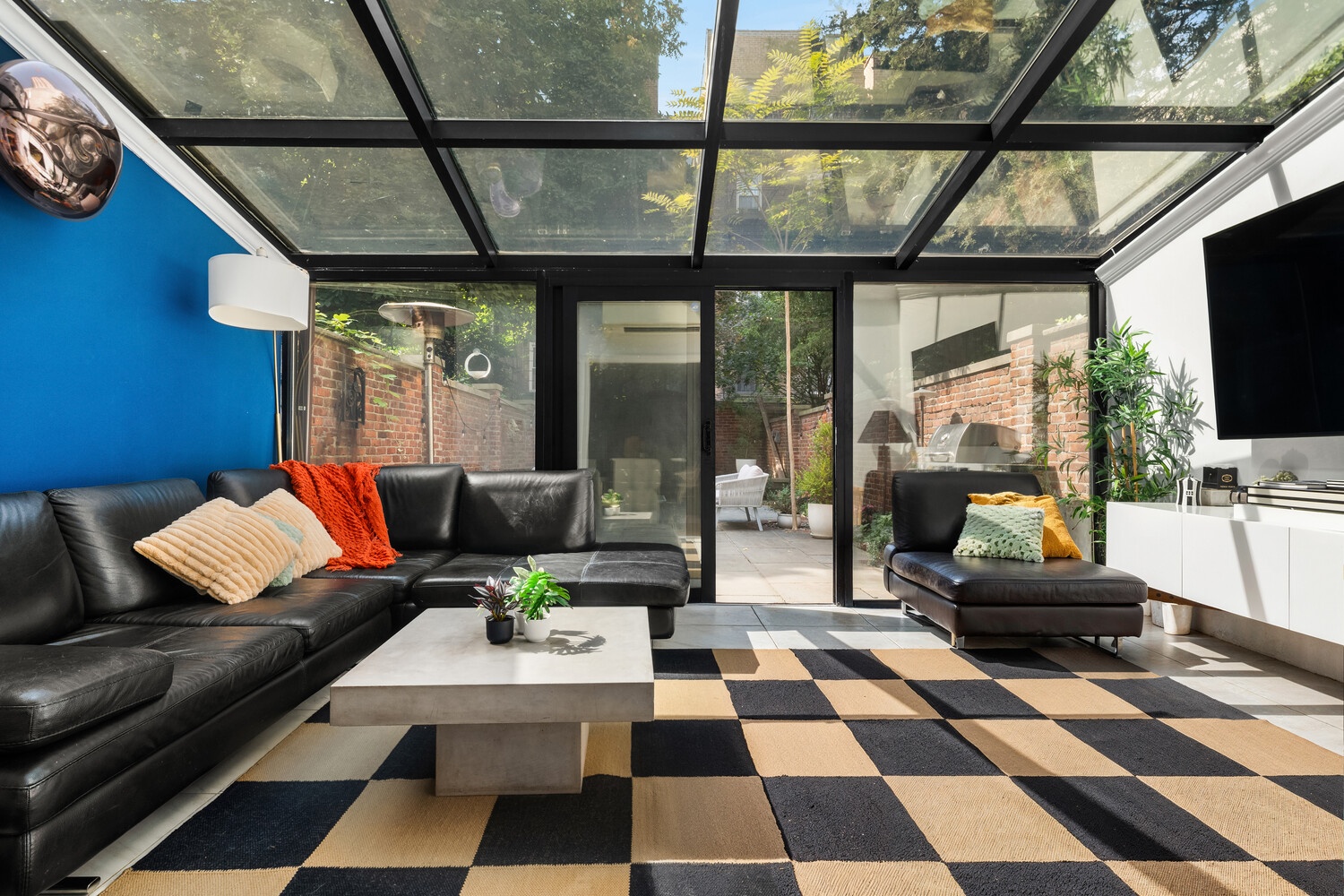 Upon entering the home, you are greeted with a captivating stone facade with a landscaped garden that leads into the first level of the home. Enter through the welcoming foyer and you're greeted by a magnificent great room that seamlessly combines living and dining in one sweeping, light-filled space. Enjoy three oversized windows which allow for ample sunlight in and a working fireplace. The gourmet chef's kitchen, which features a breakfast bar, has been meticulously renovated and is equipped with updated appliances including a 6-burner gas cooktop and exhaust fan, full size dishwasher, and a built-in refrigerator-freezer. Additional features include white lacquer cabinetry and an abundance of counterspace throughout to test your culinary expertise. Discreetly tucked away is a powder room with a storage closet and a pantry closet for additional storage. Continue on into the large sunroom which can easily be used as the main living area and into the huge private backyard which is enclosed for privacy and is the perfect place to entertain in the warmer months.