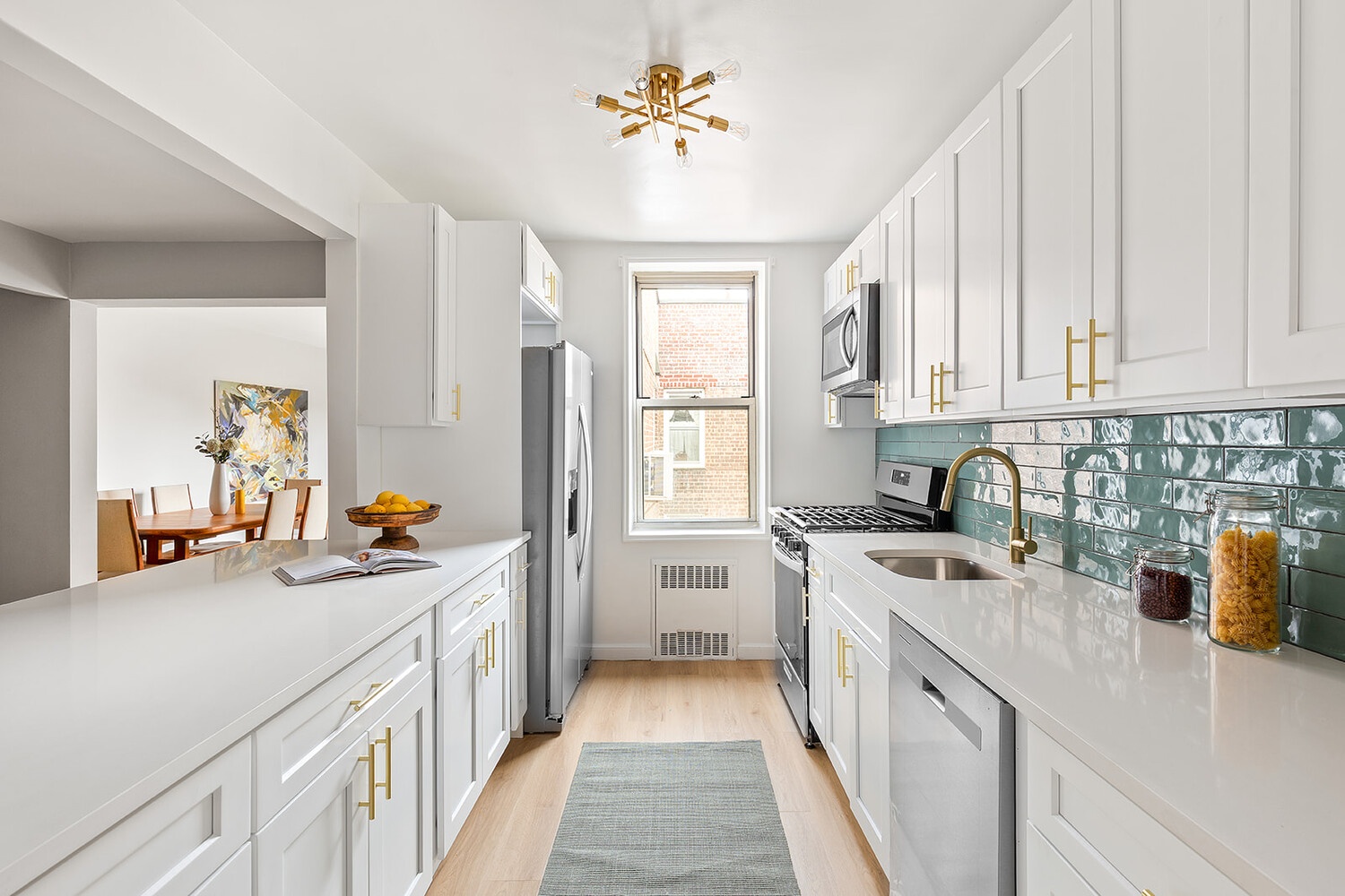 The reimagined kitchen combines modern function with timeless design-complete with quartz countertops, shaker cabinetry with brass accents, a sea-glass tile backsplash, and stainless steel appliances including a gas range and dishwasher.