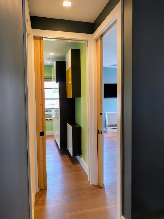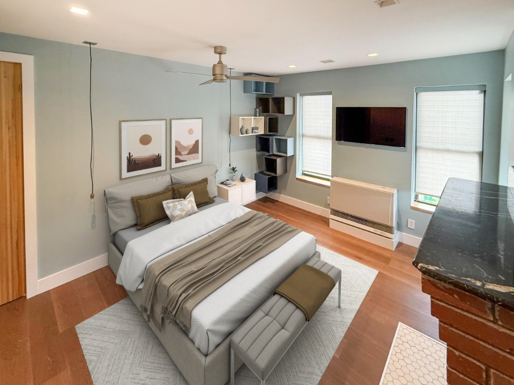 Set on a quiet fourth floor, enter into a charming, sunny living room with wide-planked wood floors, exceptional window light, Warm dimmed recessed lights, and an adjoining kitchen, featuring porcelain tiled floors, Liebherr fridge, gas KitchenAid stove, ceiling-high storage, and a beautiful versatile eat-at waterfall-style caesarstone dining counter. This apartments layout is square, no railroads here!