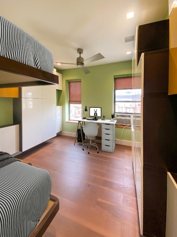 The second, only slightly smaller bedroom, is lined with cabinetry to maximize space and storage, featuring sleek built-in legless bunkbedseasy for vacuuming underlending the room a high-end, fun feel.