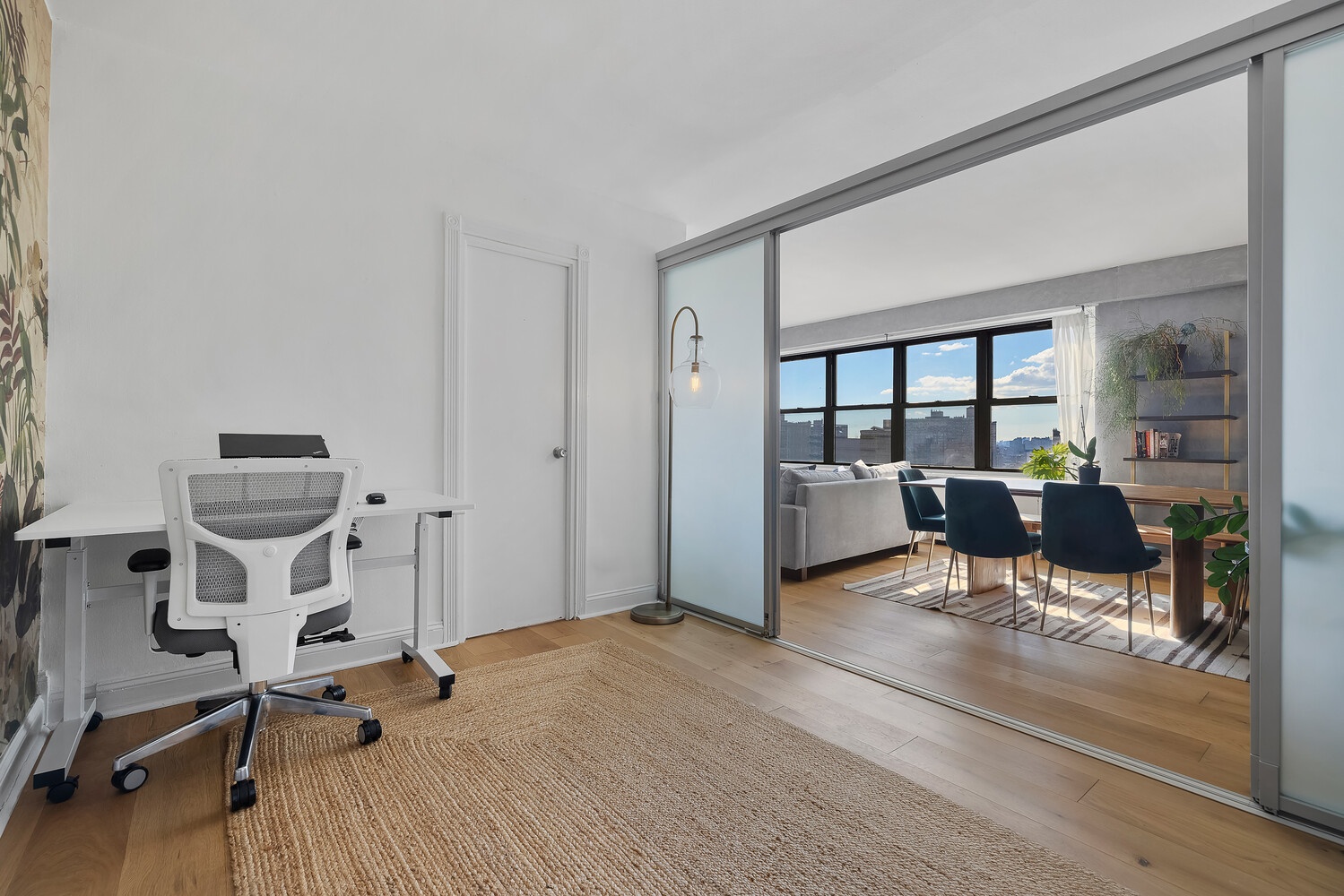 A set of sliding frosted-glass doors separates the home office or guest area, which includes a Murphy bed with storage for added versatility. Two fully renovated bathrooms feature refined materials and thoughtful design. The primary bath includes a walk-in shower and a deluxe Toto bidet commode. The second bath is crisp and modern, with new fixtures and a bathtub.
