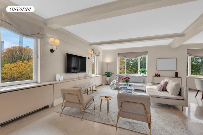 Apartment 6C at 930 Fifth Avenue is a sun-filled and expansive two-bedroom, two-and-a-half-bathroom corner home on the Park! Located on the famed 'Museum Mile' and directly across the street from Central Park, the 'Gold Coast' location is superb. Oversized windows draw in extraordinary natural light from both western and southern exposures while showcasing spectacular Central Park views, as well as the midtown skyline! From the spring buds and blossoms, full summer green lushness, to the breathtaking autumn foliage splendor, the seasonal perspective is a spectacular vantage point.