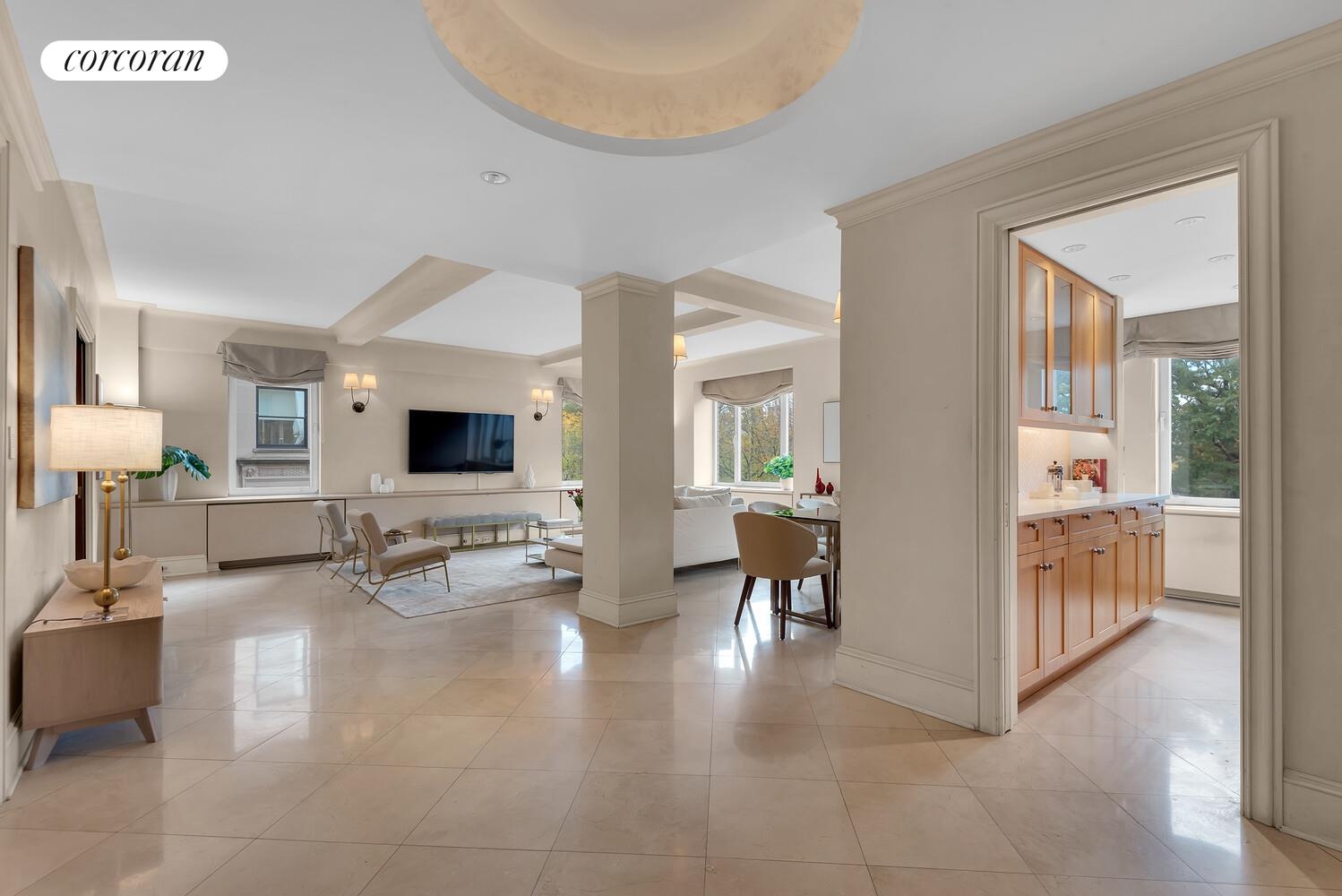 The stunning formal expanse offers an open concept layout that is well-suited for formal entertaining. The setting is spectacular with five sets of windows showcasing lush green Park views from two exposures. The fully outfitted and sun-filled kitchen faces the Park and can be accessed from the two sides of the dining area. More recently renovated, the space is filled with abundant cabinetry, sleek counters, herringbone marble tile backsplash and stainless-steel appliances including dishwasher and built-in microwave. A large walk-in pantry just opposite the kitchen provides endless storage space.