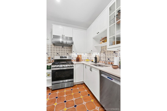 The windowed kitchen is a standout, a joyful mix of traditional and artisanal design. White shaker cabinetry and Caesarstone countertops are set against a striking hand-painted, ceramic tile backsplash contrasted by rich terracotta floor tiles accented with colorful geometric inlays. The result is timeless yet unexpected, paired beautifully with a deep farmhouse sink, elegant glass-front cabients and stainless-steel Bosch and GE appliances .