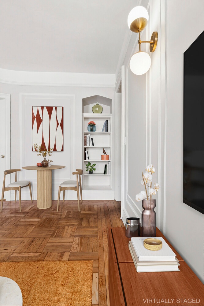 The current owners reimagined the space with meticulous attention to detail, balancing character, comfort, and craftsmanship in perfect measure. Immediately upon entering you're greeted with a bright, gracious entry foyer with a double-door coat closet, leading to a sun-filled living room framed by treetop views. The scale allows for distinct dining and lounge areas, while custom built-ins, sconce lighting, and a ceiling fan add texture and ambiance. Original parquet floors and high ceilings lend warmth and continuity throughout.